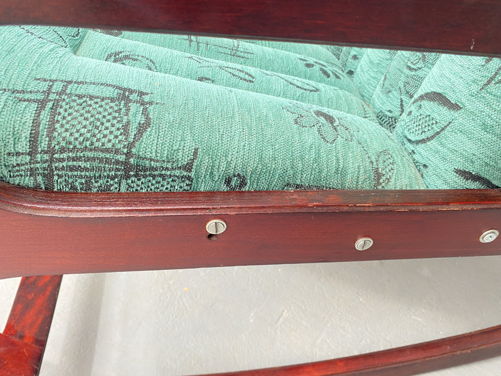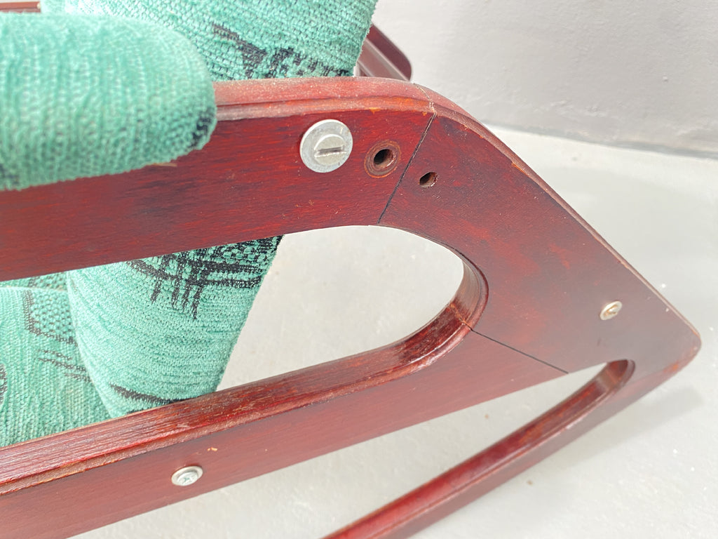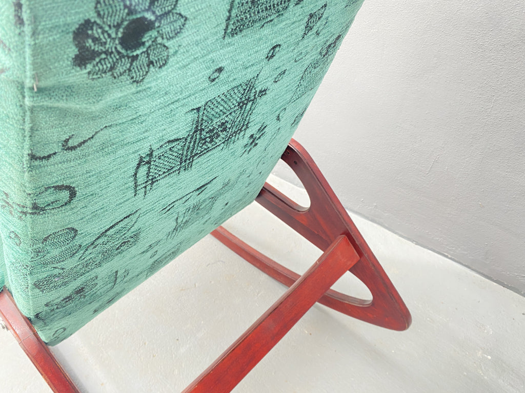 The chair features a solid wooden frame with clean, sculptural lines that provide both aesthetic appeal and lasting stability. Green-patterned upholstery remains in very good condition—fully intact and functional—highlighting the thoughtful preservation of the piece.