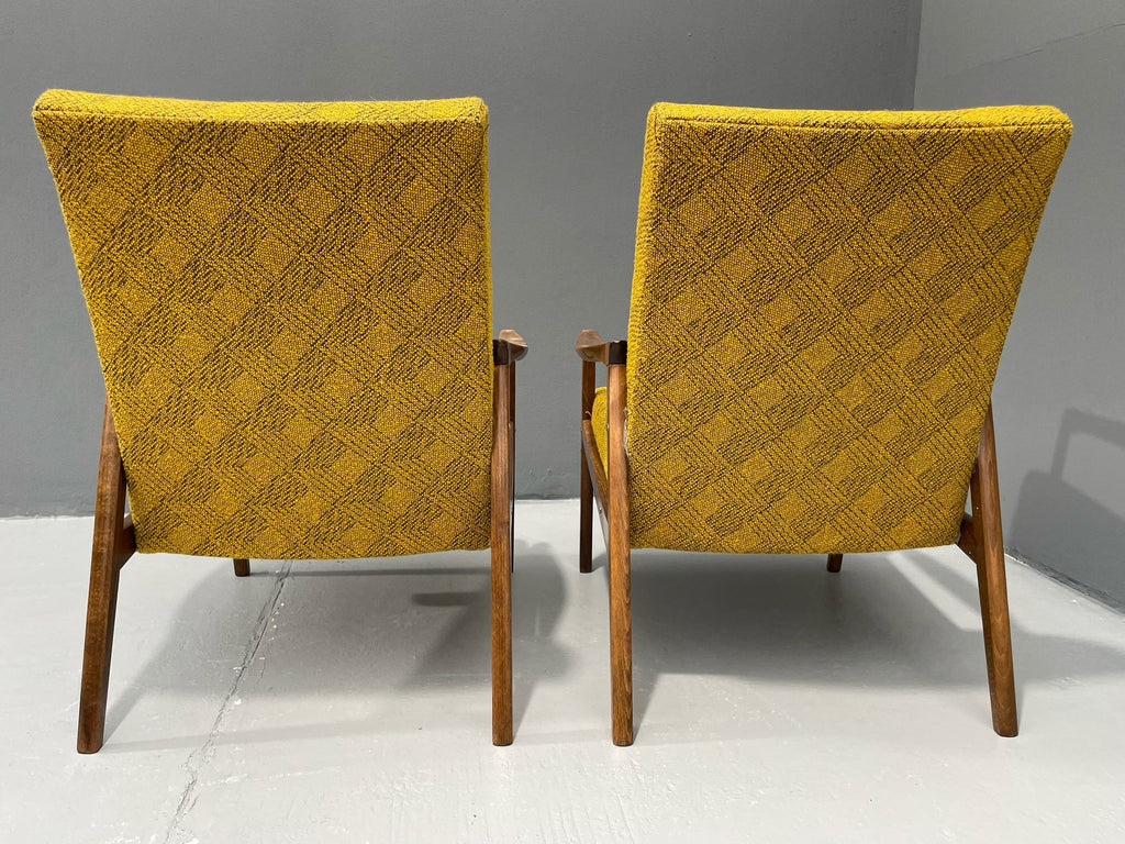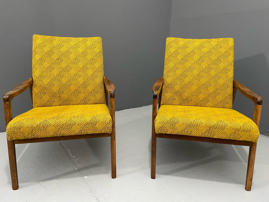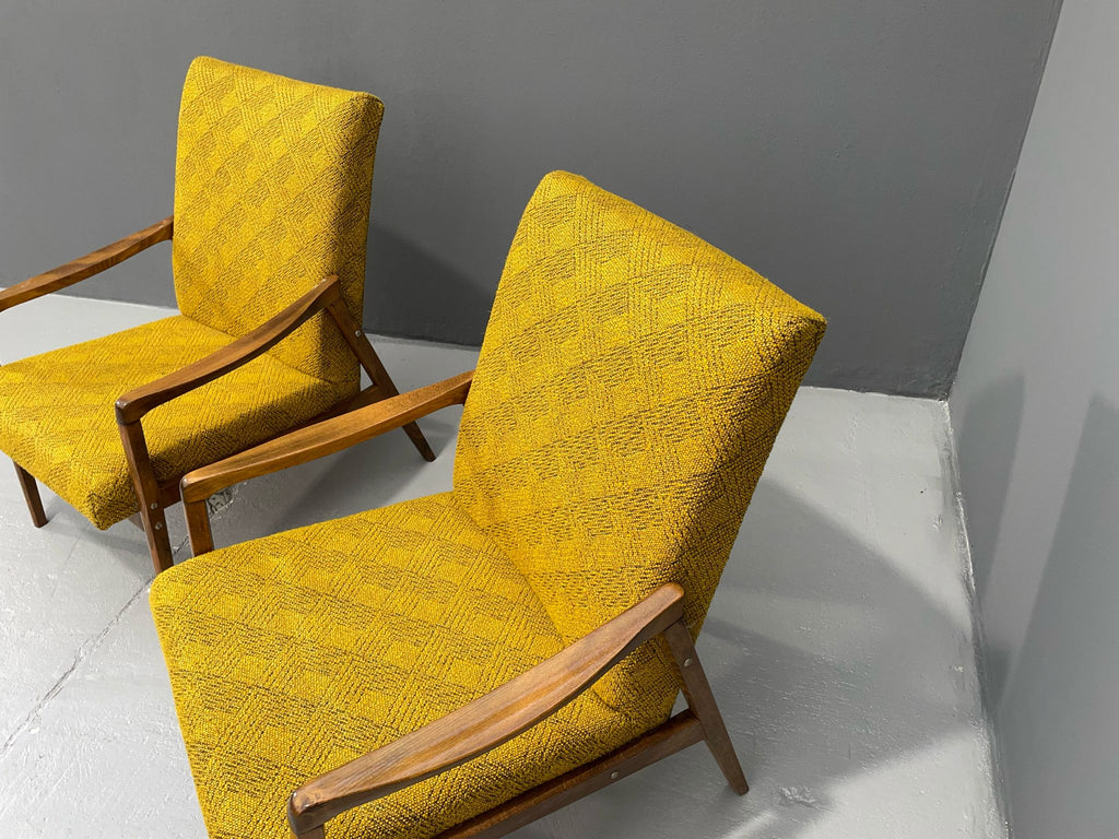 The armchairs feature solid wooden frames with elegantly curved armrests that lend the design a light, open feel. The original yellow upholstery with a textured pattern is well-preserved and free of major damage. The construction is stable and ready for immediate use.