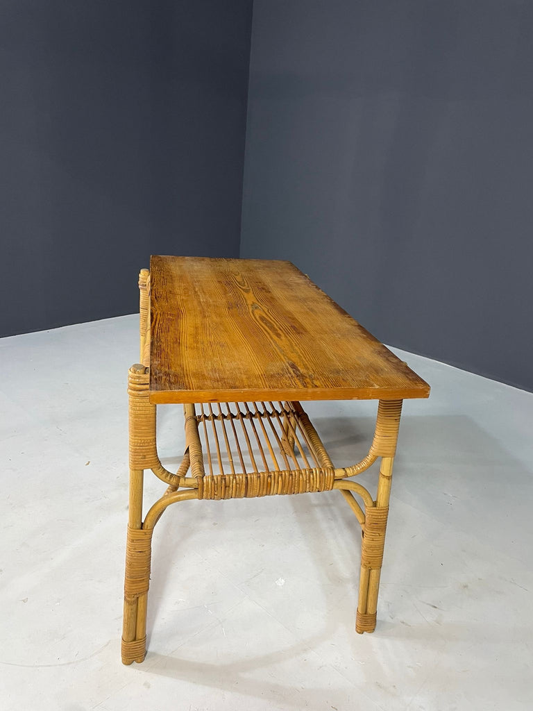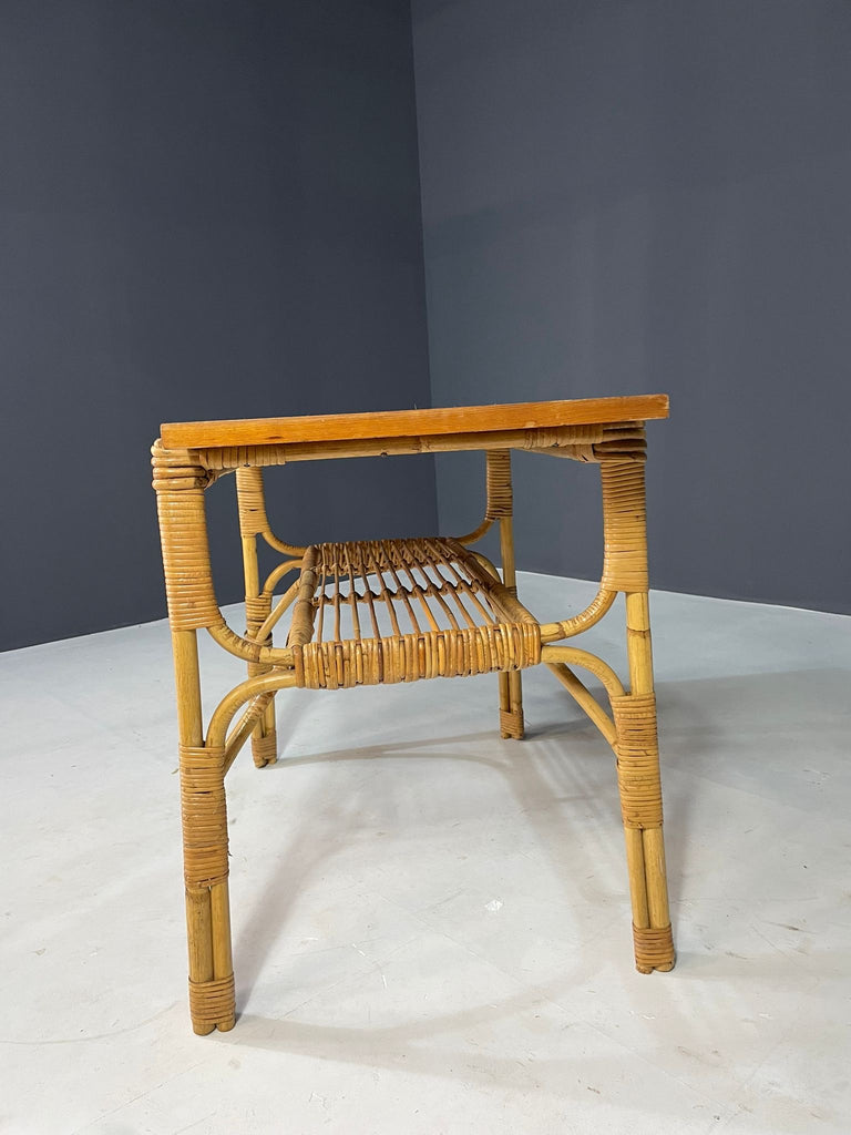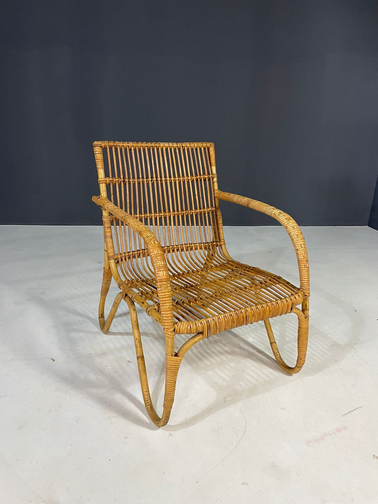 A charming rattan seating set in the Art Deco style, produced in Central Europe around the late 1930s to early 1940s. This elegant ensemble includes a table, a two-seater bench, and two armchairs. The set showcases handcrafted woven construction, curved lines, and the soft yet structured silhouette typical of pre-war European design.