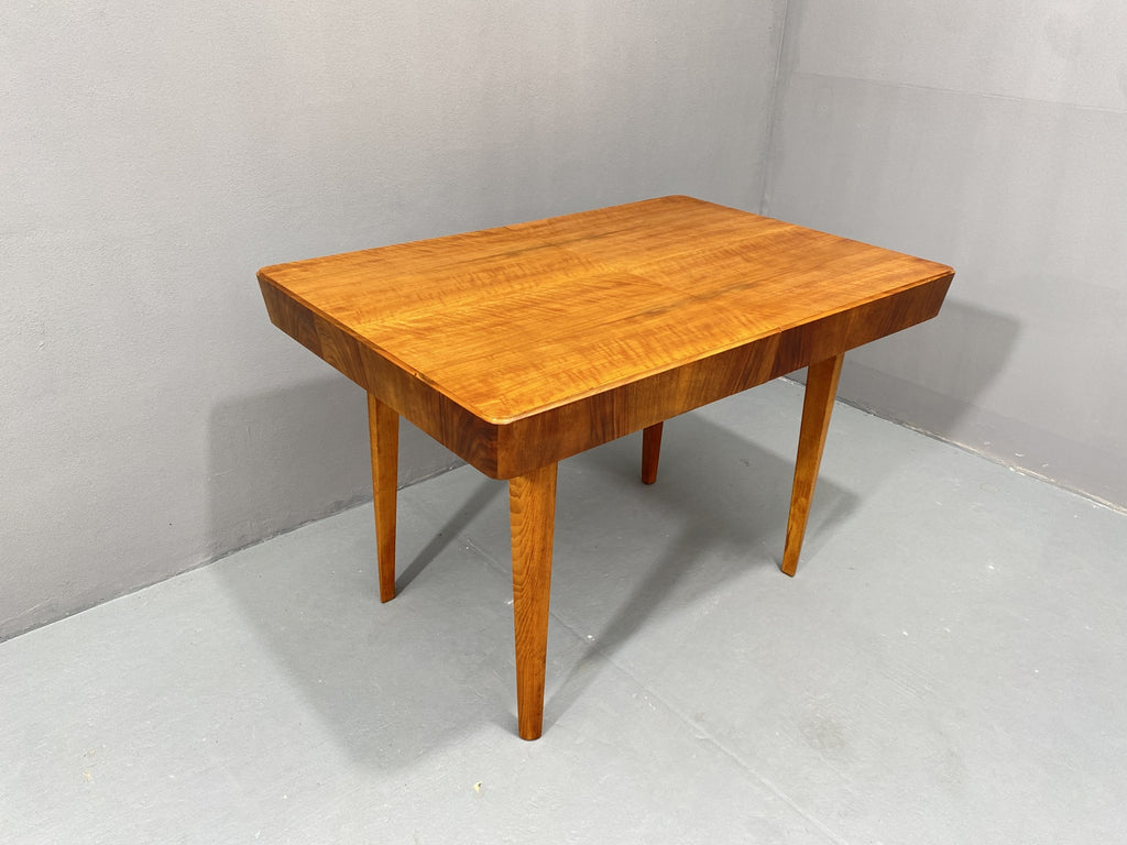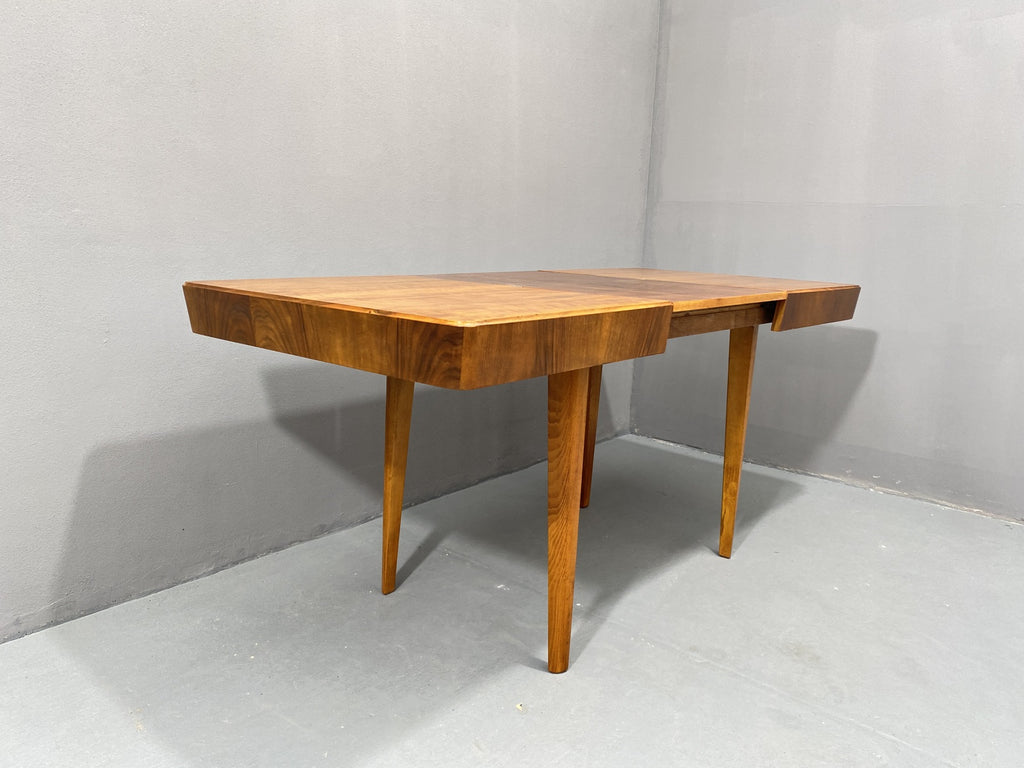 An adjustable mid-century dining table from the 1950s, produced by Setona in former Czechoslovakia. Made of walnut, the table can be easily unfolded and extended from 116 cm to a length of 171 cm.