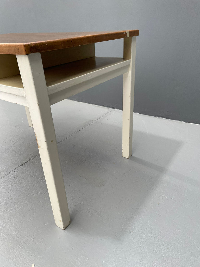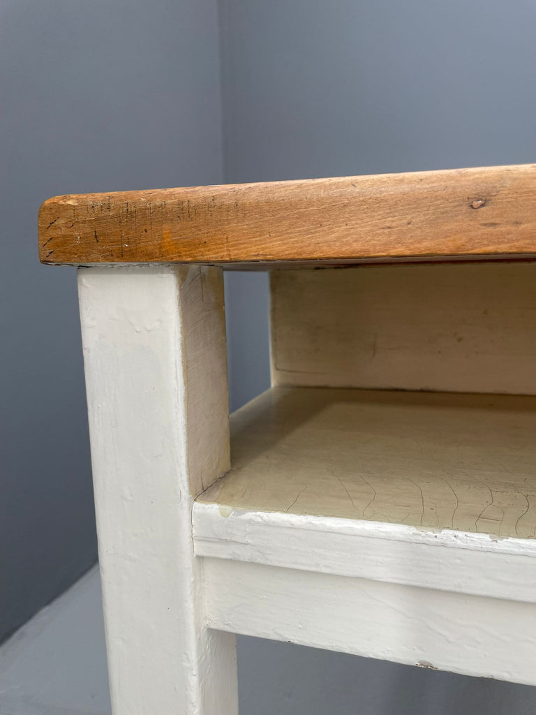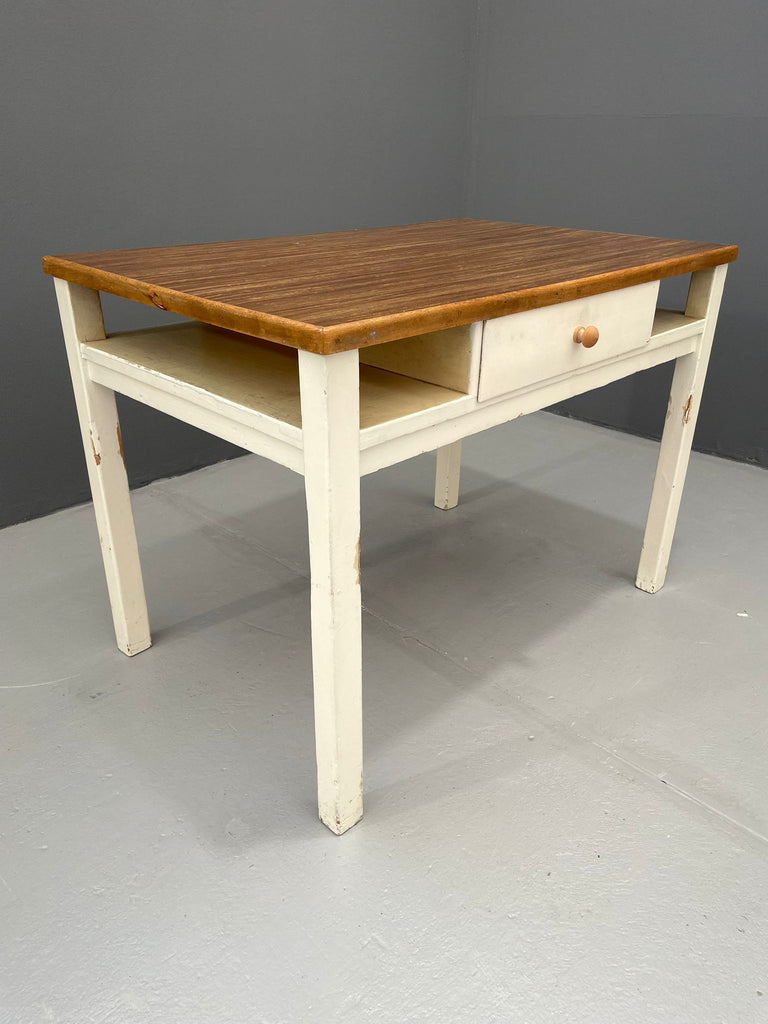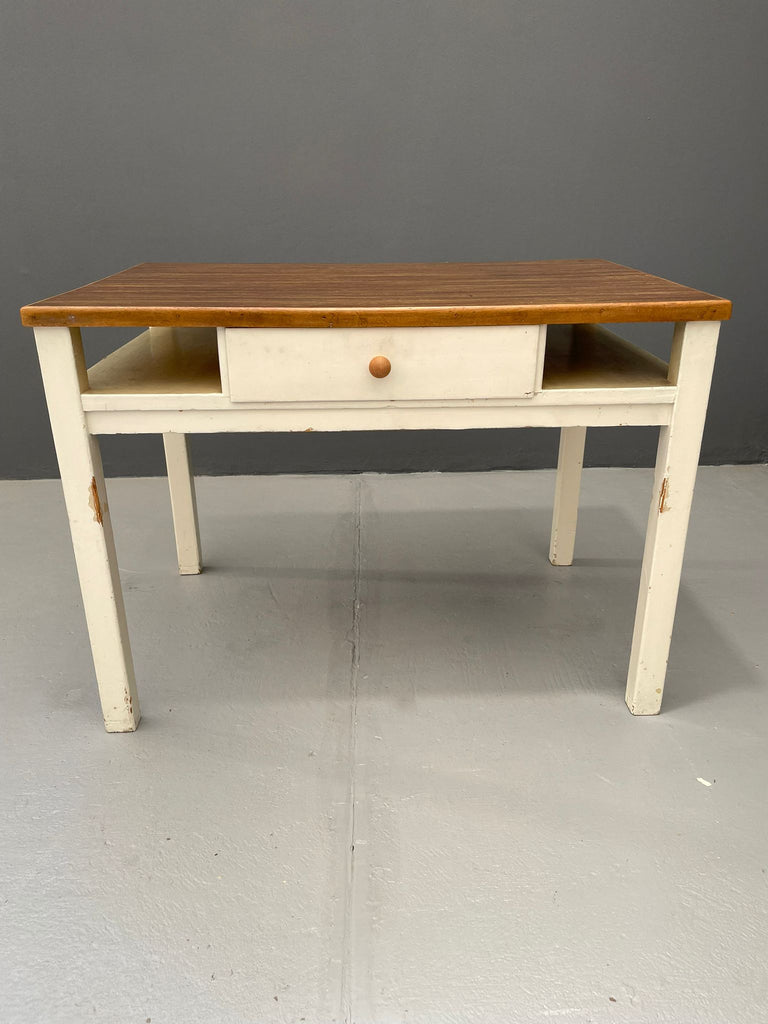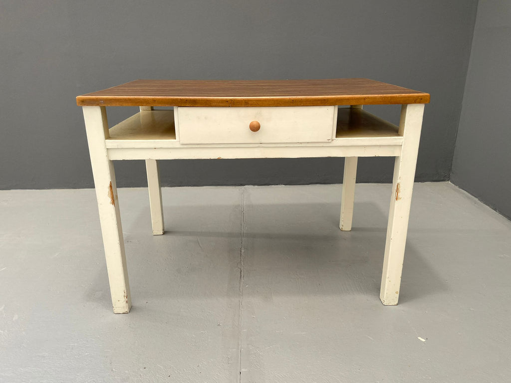The desk features a solid painted wooden frame in off-white and a contrasting dark veneered top. It includes a single drawer and an open shelf underneath for convenient storage. Visible wear and patina from years of use contribute to its authentic vintage character.