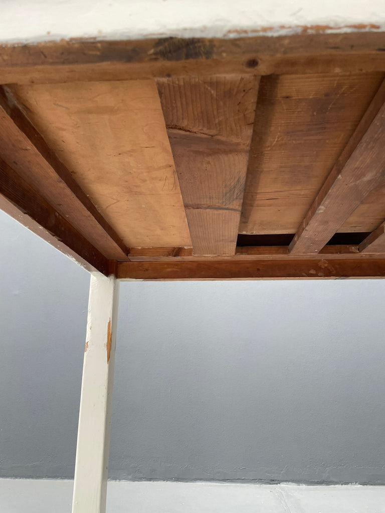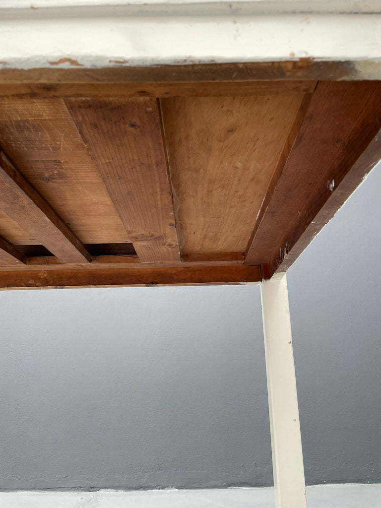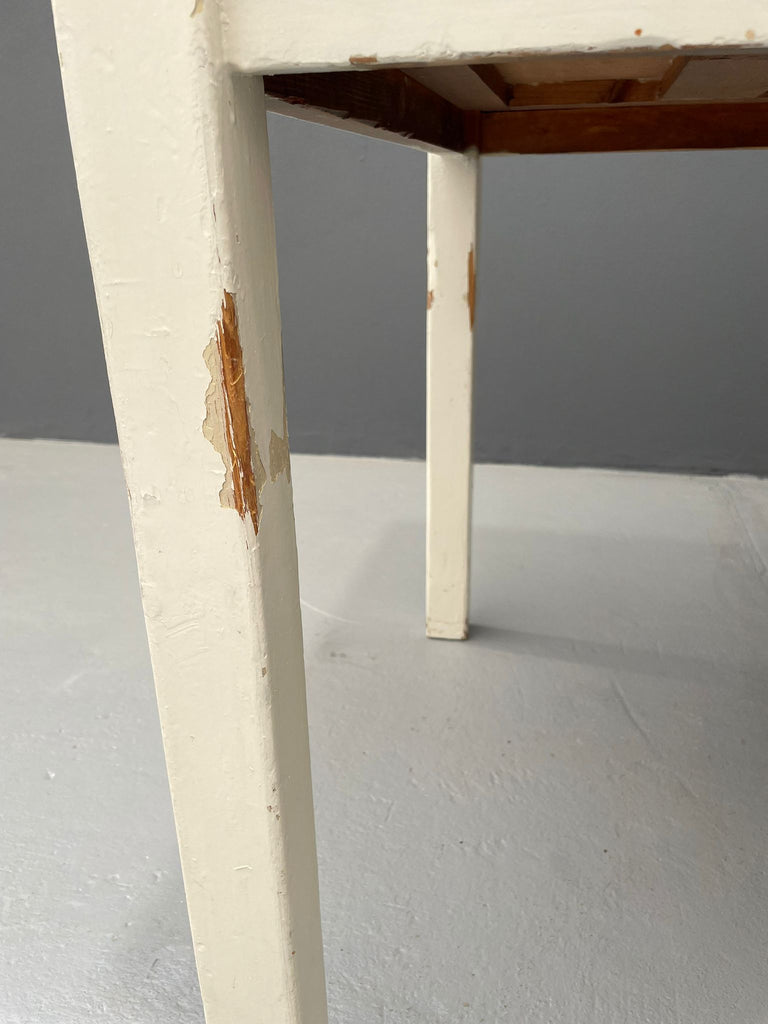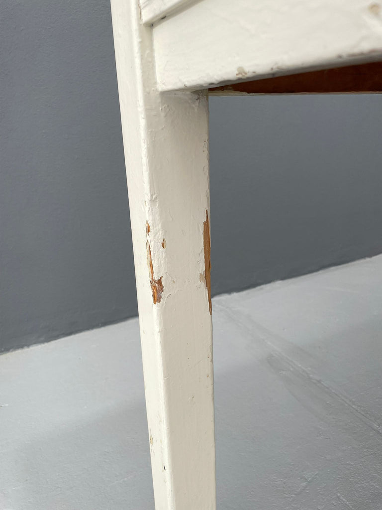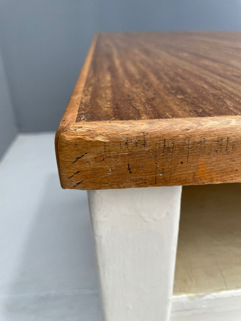 The desk features a solid painted wooden frame in off-white and a contrasting dark veneered top. It includes a single drawer and an open shelf underneath for convenient storage. Visible wear and patina from years of use contribute to its authentic vintage character.