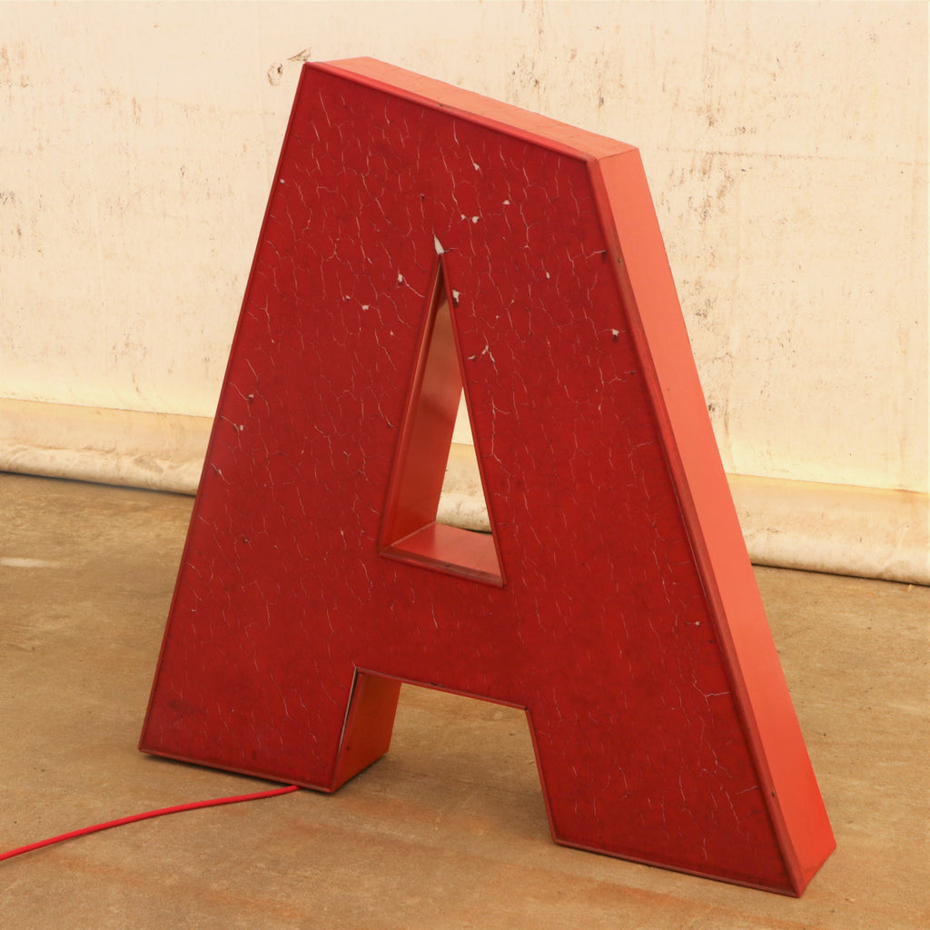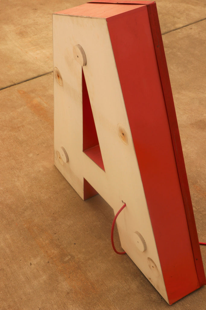 This advertising illuminated letter represents the ever so popular Vintage wall art. You can use the letter on the wall but better as a floor lamp in the room. The lamp shines in darkness or semi darkness. This vintage industrial illuminated letter A was made in the former Czechoslovakia during the 1970s and comes from an old advertising banner. It´s made of plexiglass and plastic. It is equipped with a LED strip. The sign was hanging outside, so it showing signs of wear. However, the signs of time and wear create an interesting and engaging patina to this piece. The weight of the letter is about 6 kg. Rewired: New power cord added.