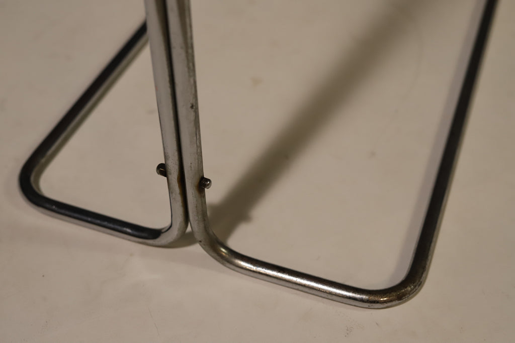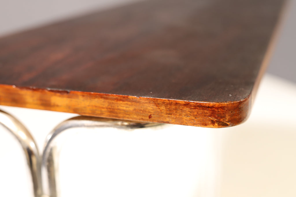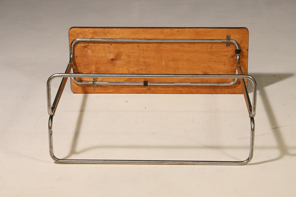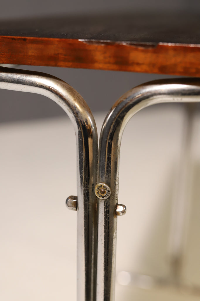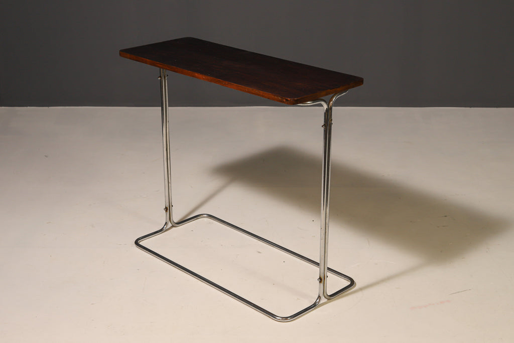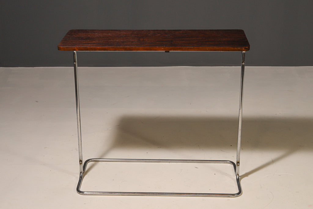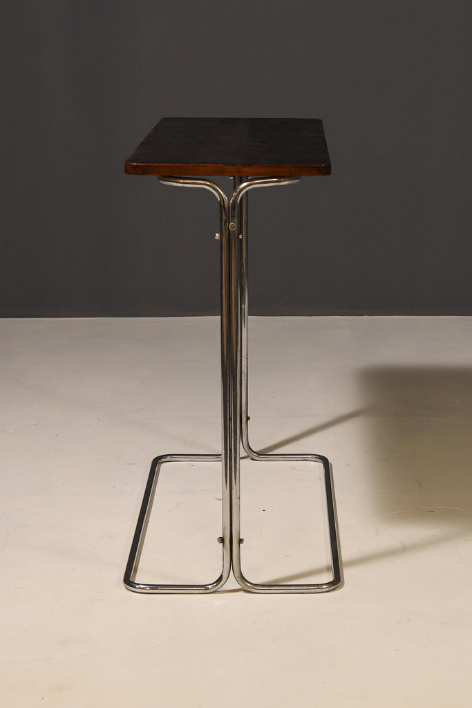This Bauhaus Console Table was designed by Robert Slezák and made in the 1930's in the former Czechoslovakia. It combines timeless design with functionality. The wooden top provides a fresh look, while the original chrome accents emphasize its elegant character. Its compact dimensions make it ideal for smaller spaces, offering practical storage without compromising the room's aesthetics. It's in very good condition.