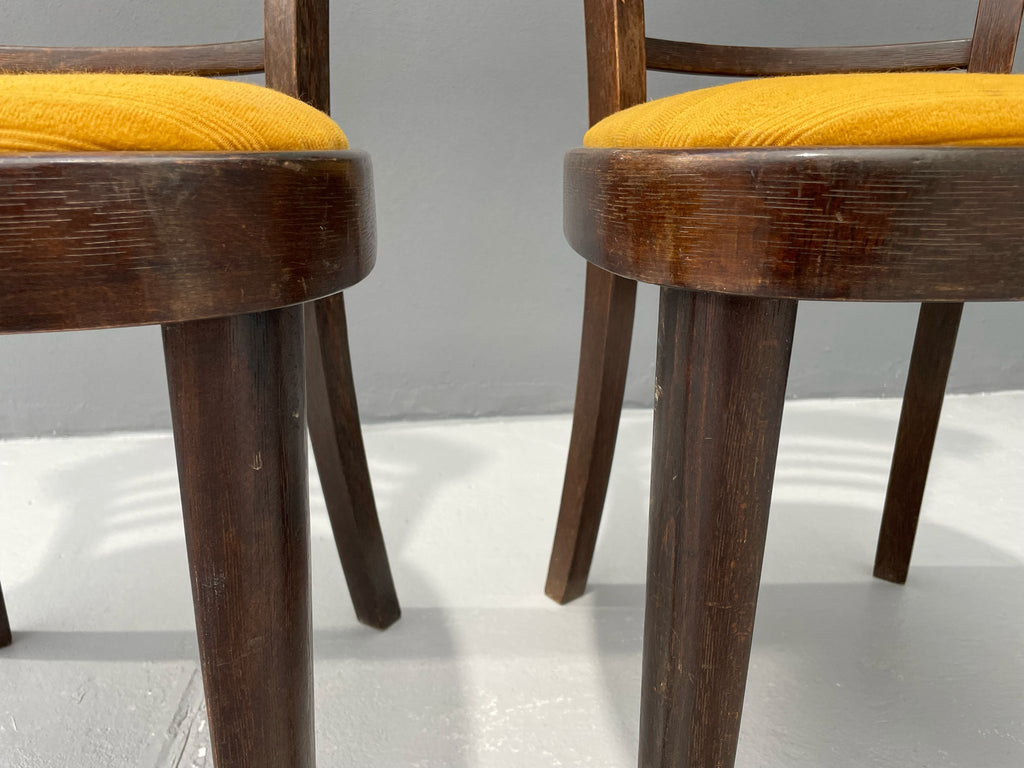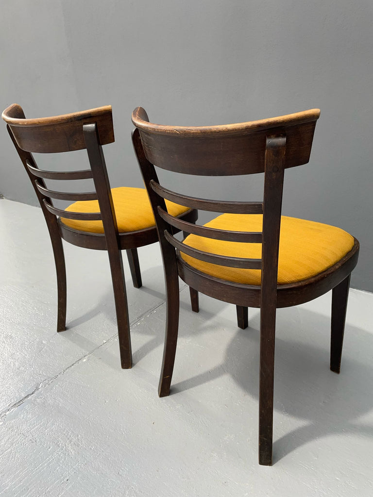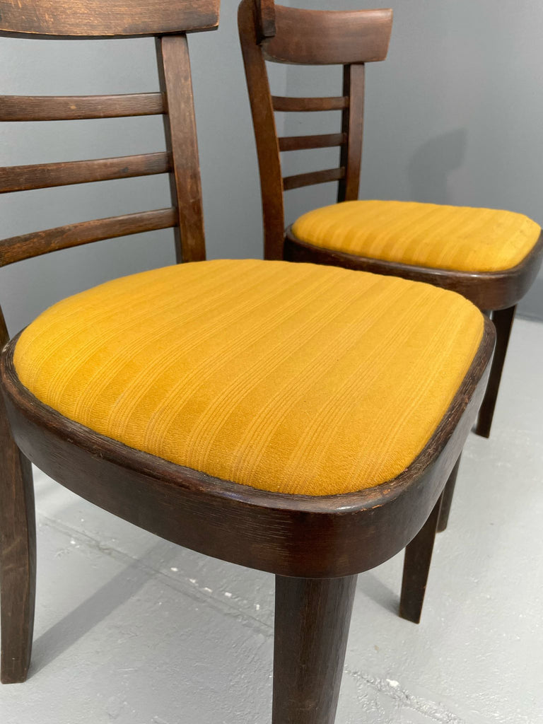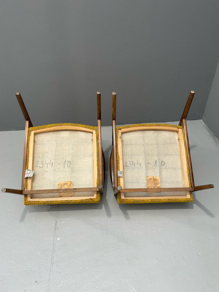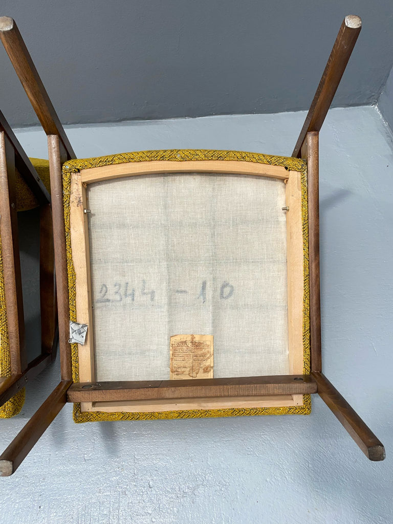 The chairs remain in good original condition, with signs of use, the fabric needs to be cleaned. An original factory label confirms the manufacturing origin and date.
