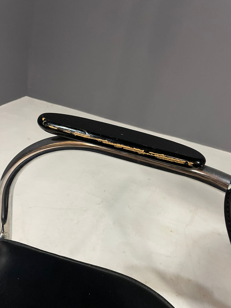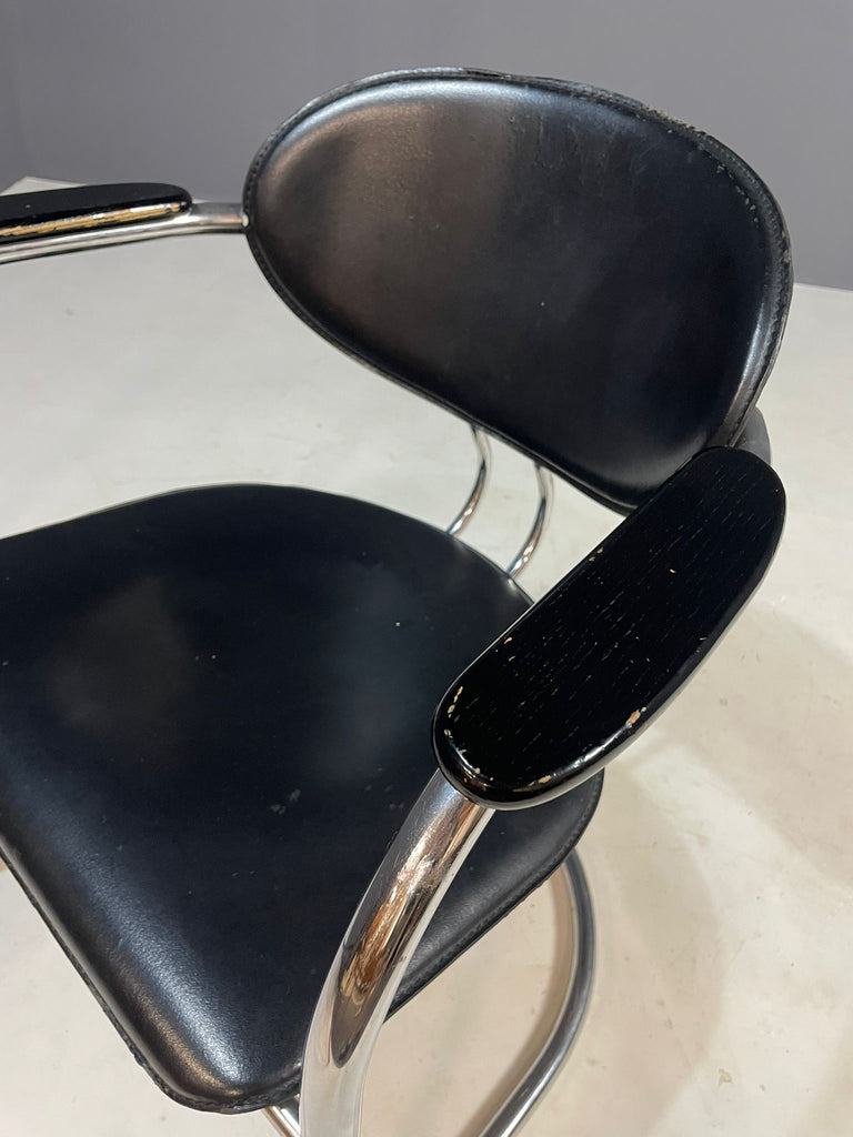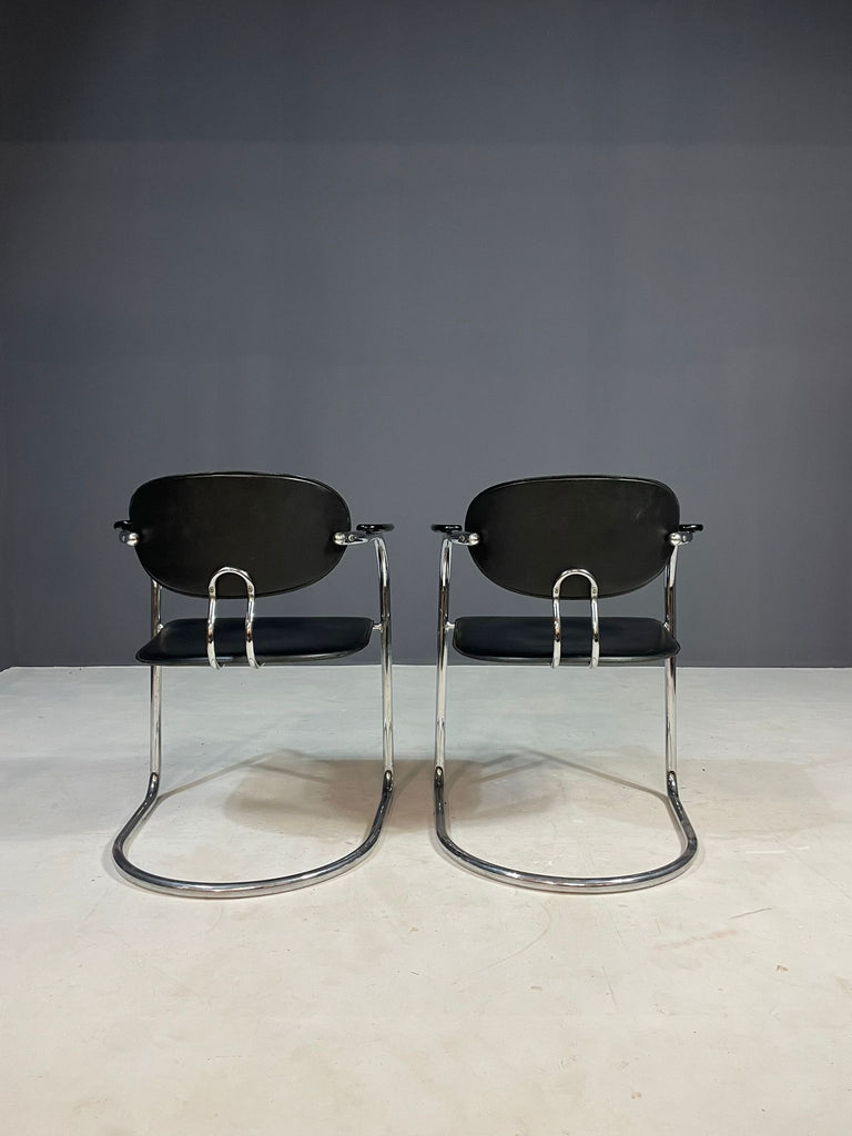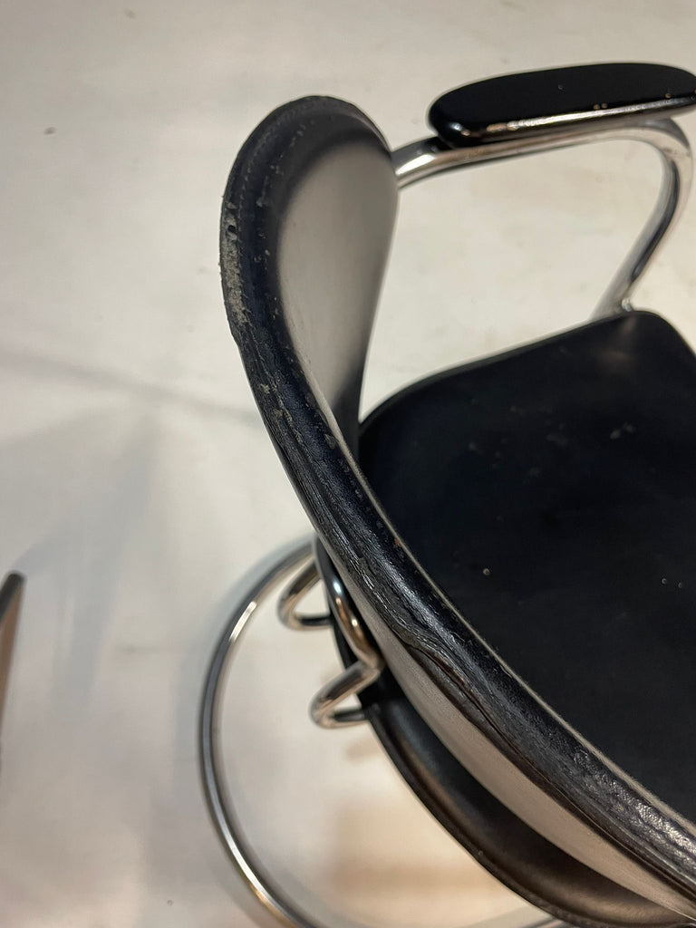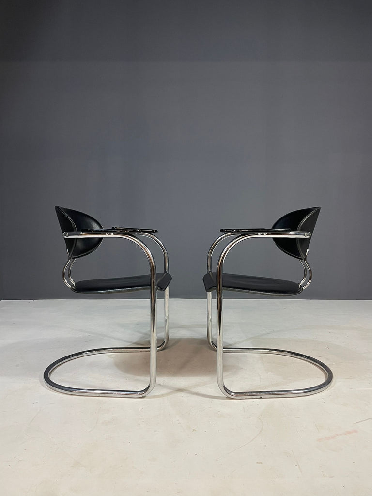 A pair of chrome Bauhaus-style chairs designed by Italian brand Effezeta in the 1980s. These chairs combine a cantilevered chrome frame with black plastic seating and backrest. The elegant curved lines evoke mid-century modernist and functionalist influences.