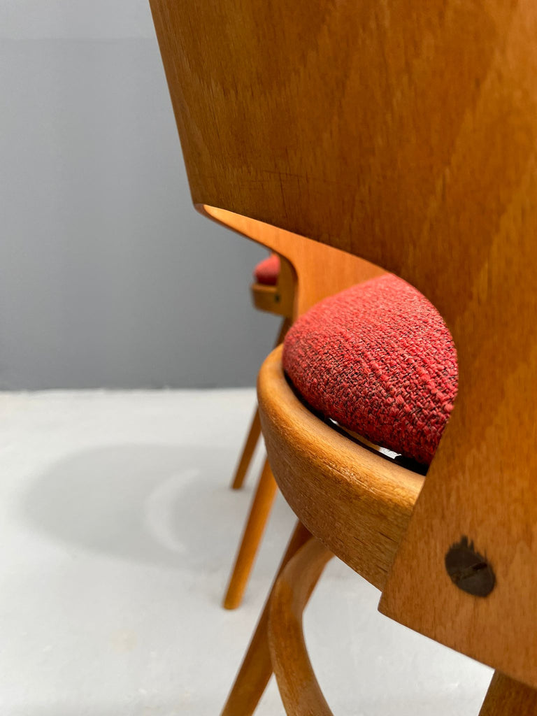 These chairs feature a classic mid-century silhouette with a curved plywood backrest and shaped seat. The original upholstery is intact – a textured red fabric that pairs well with the light tone of the beech wood frame. The structure is solid, and the chairs are in good vintage condition with natural patina and light wear consistent with age.