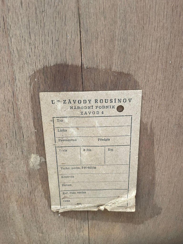 Offered here is a pair of original TON dining chairs, model 514, designed by Radomír Hofman and produced in the 1960s in Czechoslovakia. The original factory label from UP Závody Rousínov, Plant 4, is preserved on the underside, confirming the authenticity and origin of these mid-century pieces.