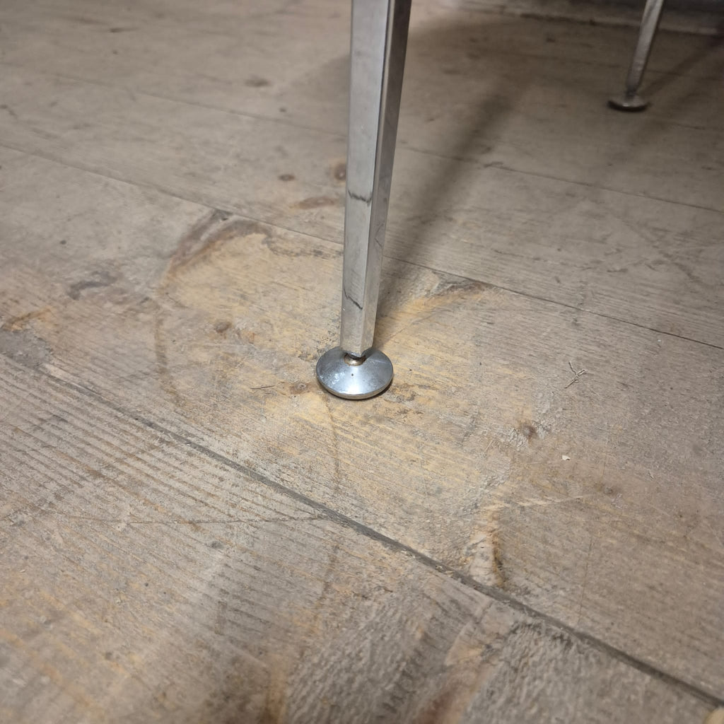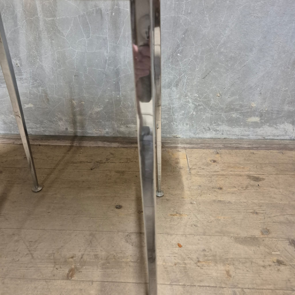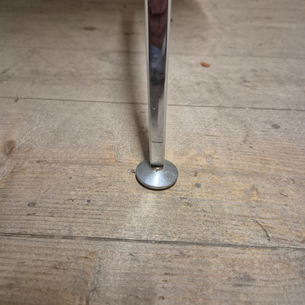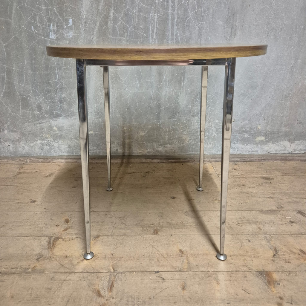 A round side table from the 1970s, produced in Europe. The piece features a simple, clean-lined silhouette typical of the decade, combining a round tabletop with slim metal legs.