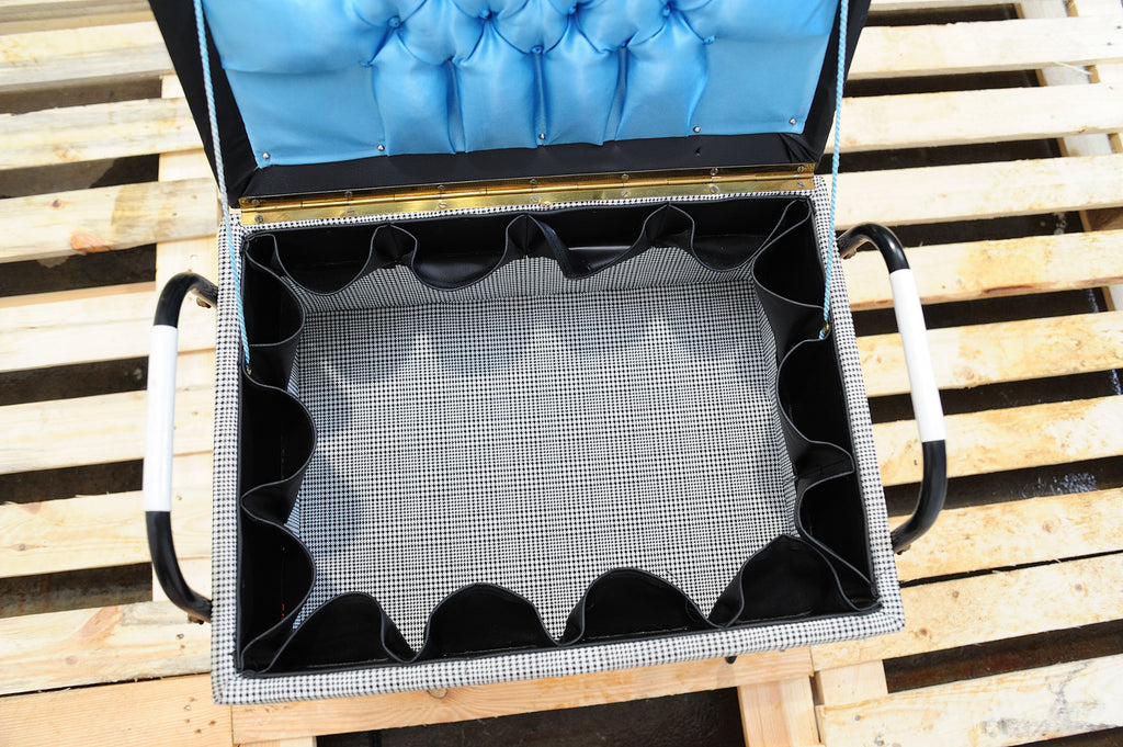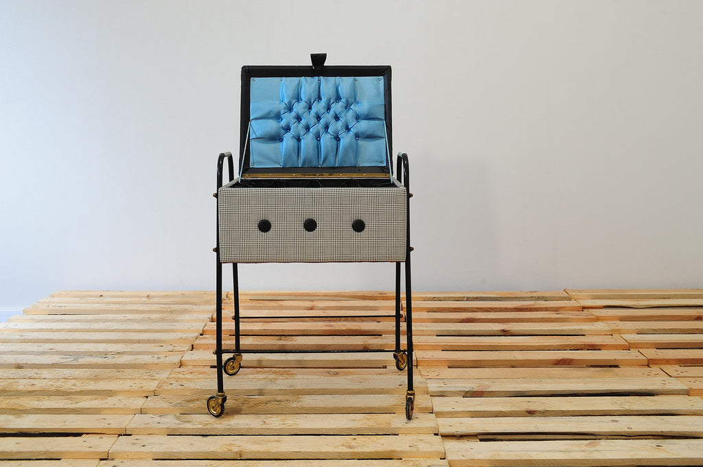 It can also be used, for example, as a serving table or great interior decoration. It features a metal structure and an upholstered storage space. The table is in good Vintage condition.