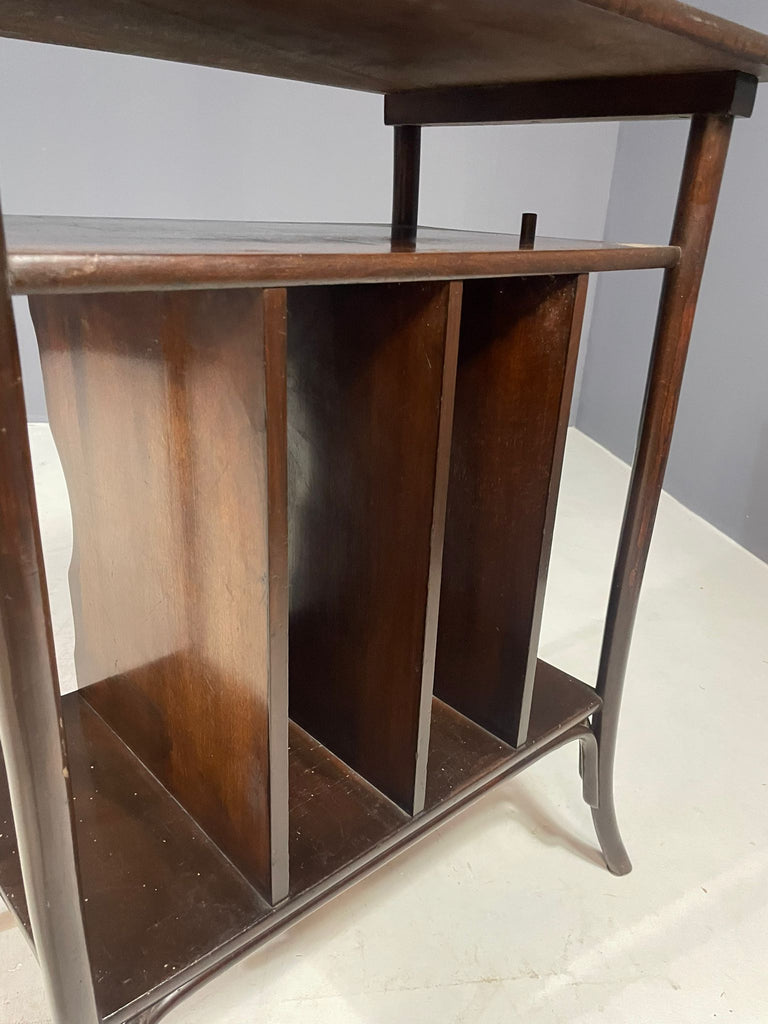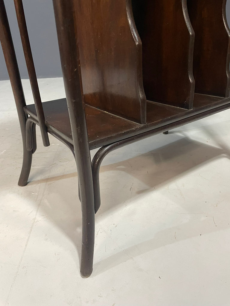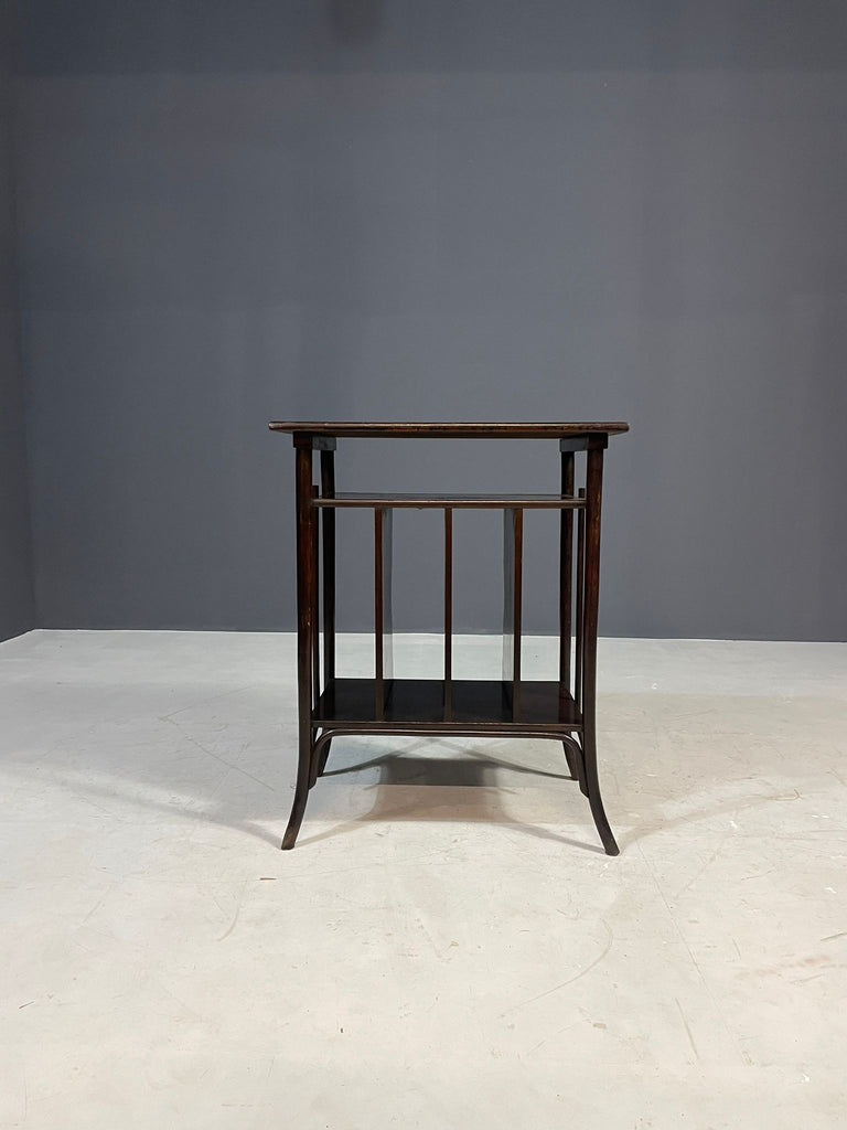 The table features gracefully curved legs, a hallmark of Thonet’s bentwood technique. It includes two horizontal and four vertical slots for music sheets or newspapers. Finished in dark brown with subtle wood grain patterns. In good vintage condition with natural patina and minor wear consistent with age.