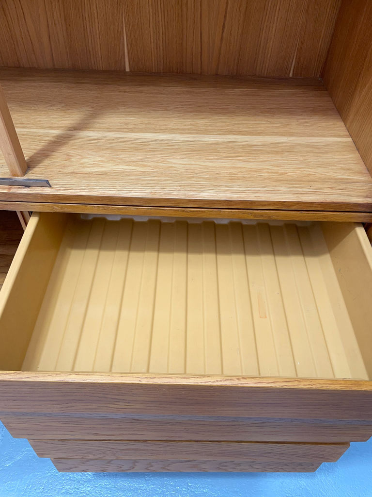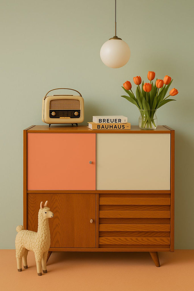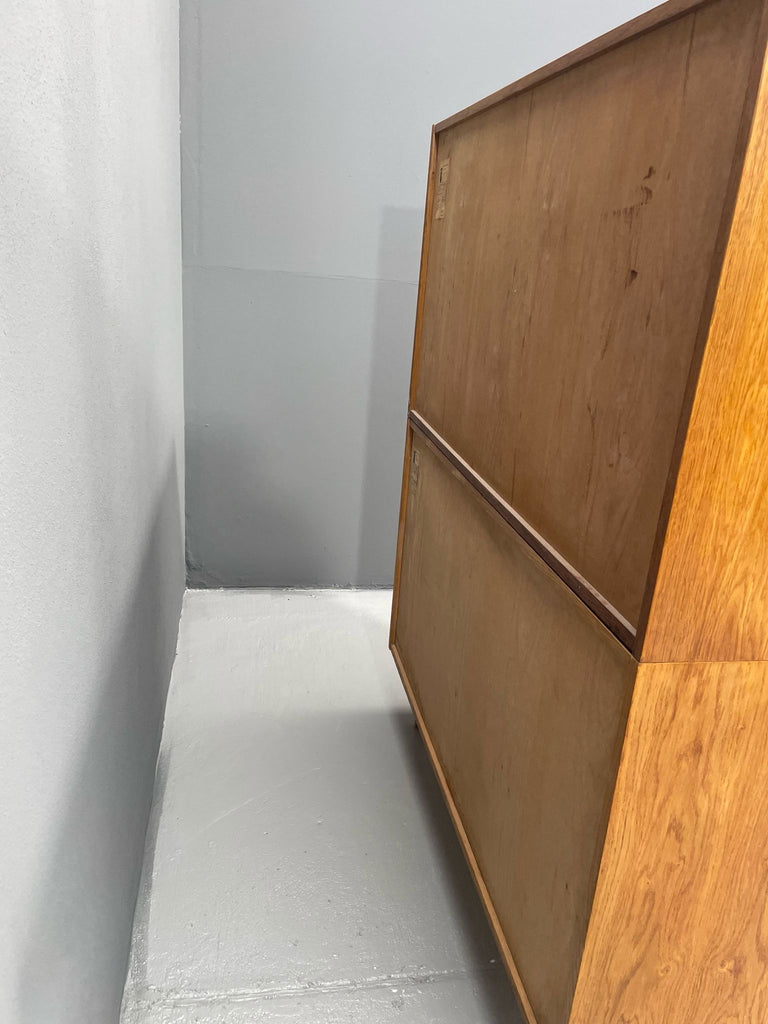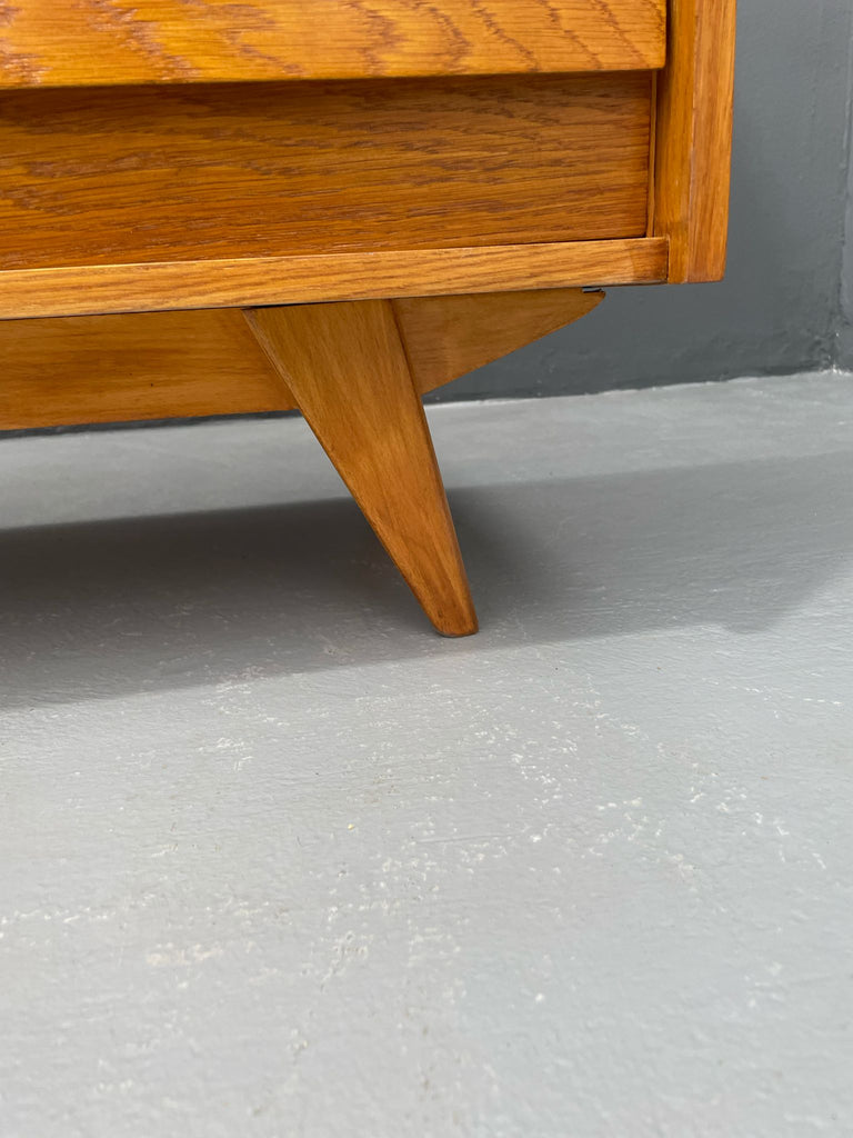 These cabinets are generally an icon of Czechoslovak post-war furniture design. They blends practicality with modernist aesthetics – featuring angled sides, tapered legs, and asymmetrical layout. The upper section consists of two lockable compartments, while the lower half has a shelved cabinet on the left and a column of four drawers on the right.