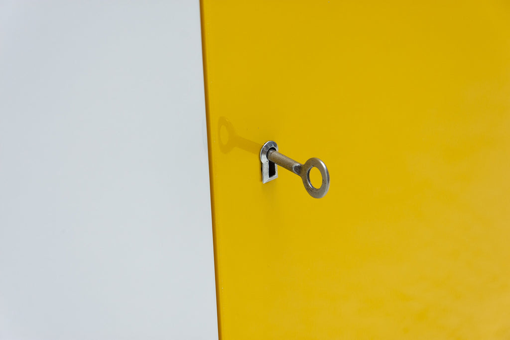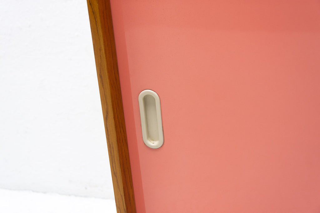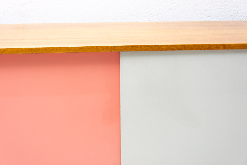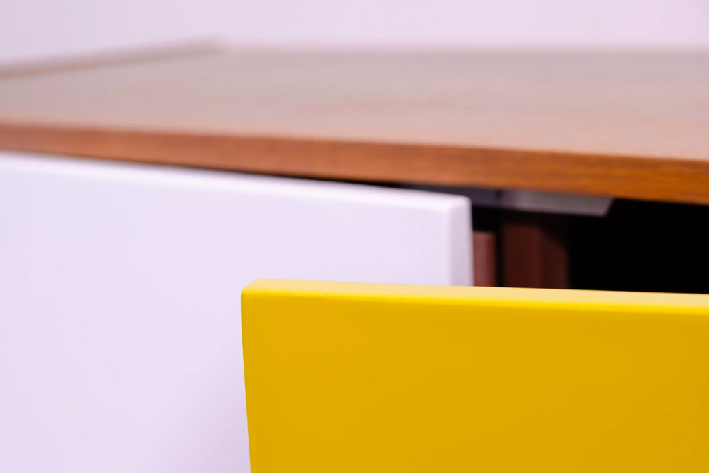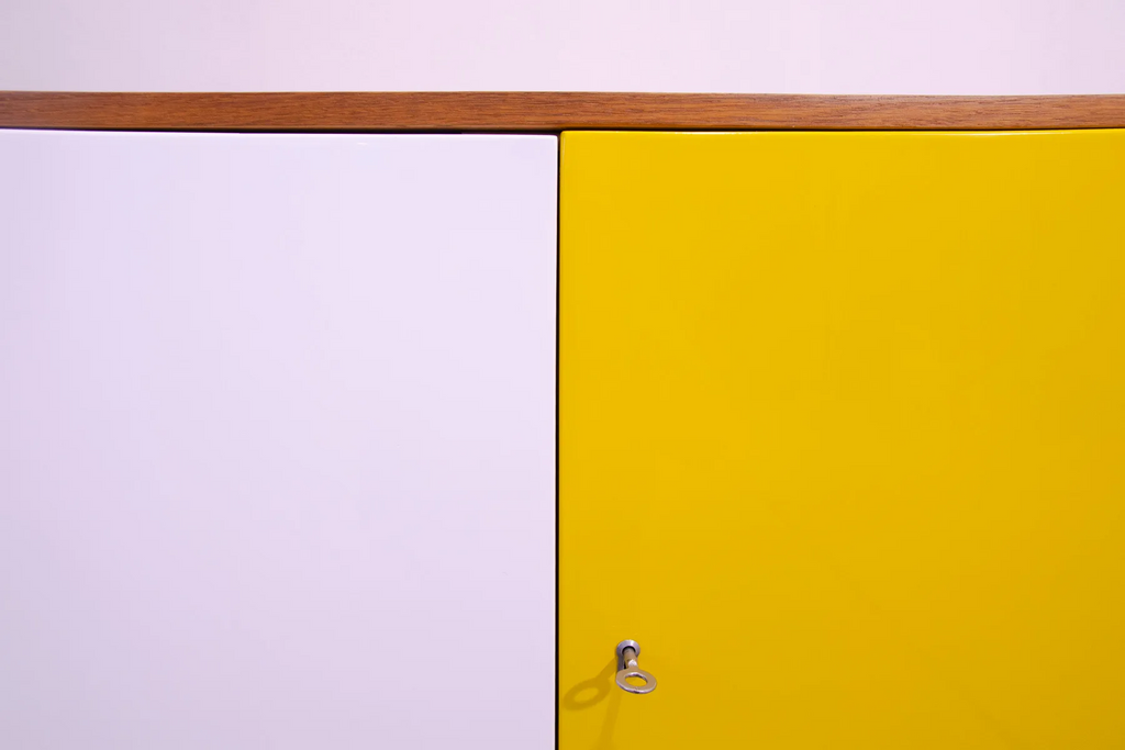 A mid-century sideboard from the iconic Universal series (U-450), produced in former Czechoslovakia in the 1960s. Recognized for its pastel colors, sloping legs, and minimalist lines, the U-450 range became a symbol of the “Brussels style” that followed the success of the 1958 Brussels Expo.