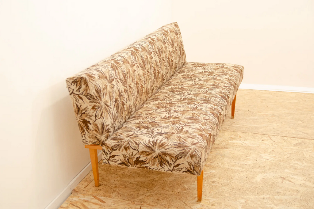 A mid-century sofa/daybed from the 1960s, made in former Czechoslovakia. Crafted from beech wood with fabric upholstery, it functions both as a comfortable sofa and as a practical bed. The clean lines and simple, functional design reflect the essence of mid-century modern style.