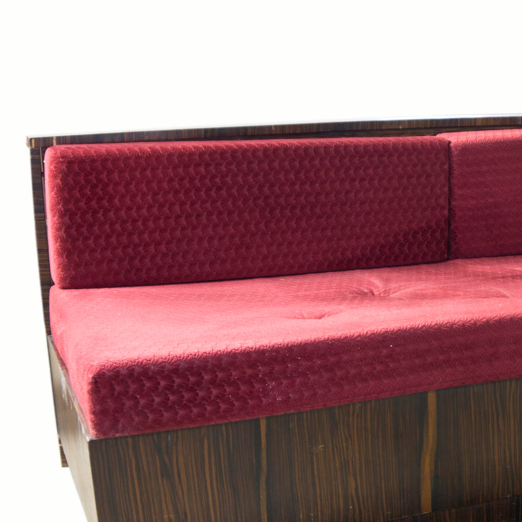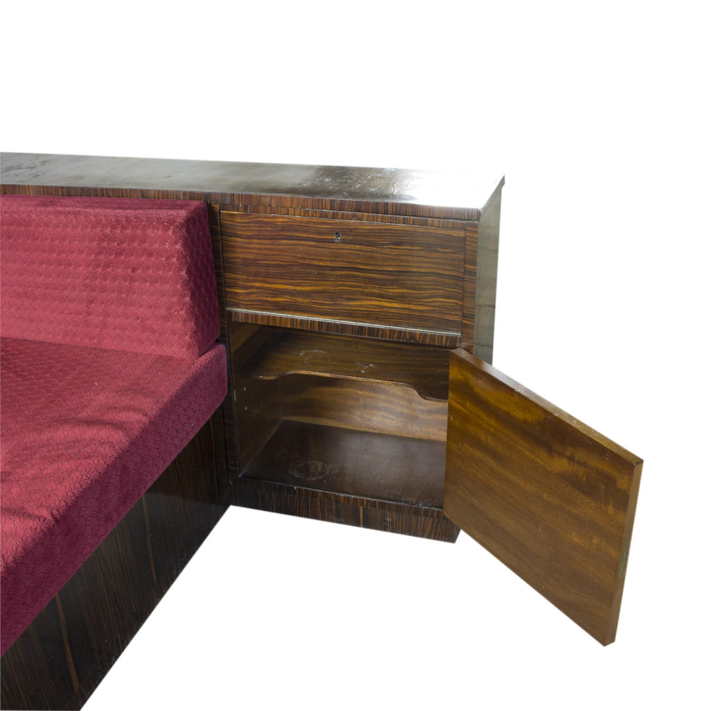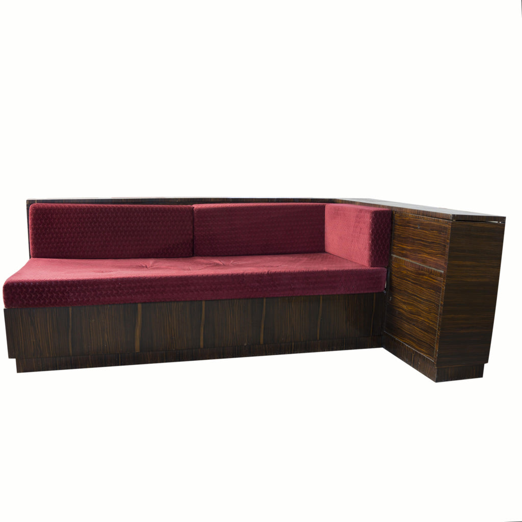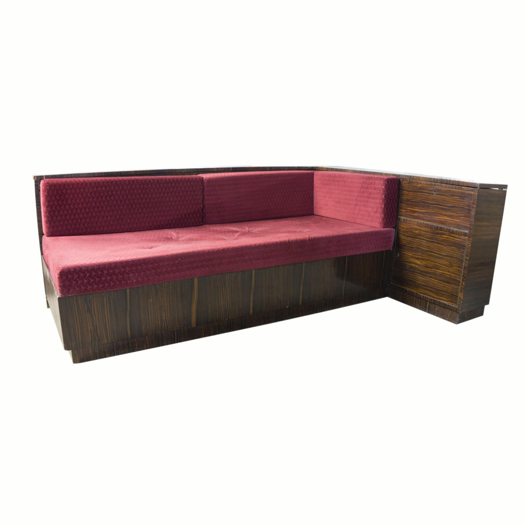 An exceptional corner sofa, macassar veneer. Bauhaus period, circa 1930´s. Good condition. In a few places the veneer is slightly damaged, and behind the sofa the veneer is wrinkled in one place, see photo. New upholstery with foam padding. In the corner are two storage spaces for books, etc. There is also a storage space under the bed.