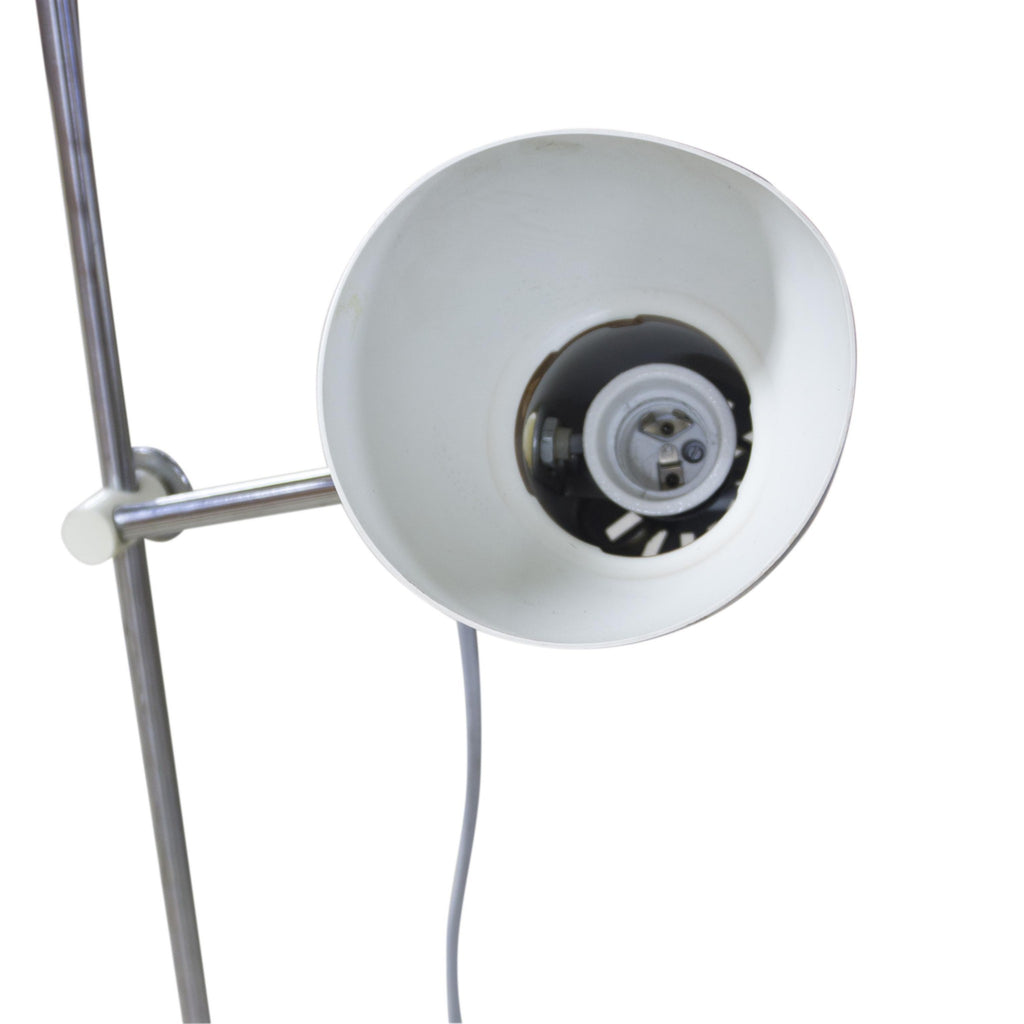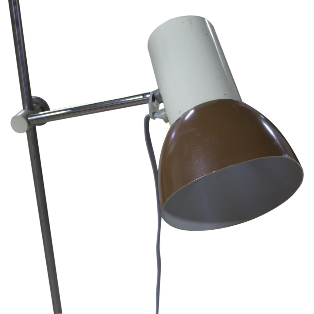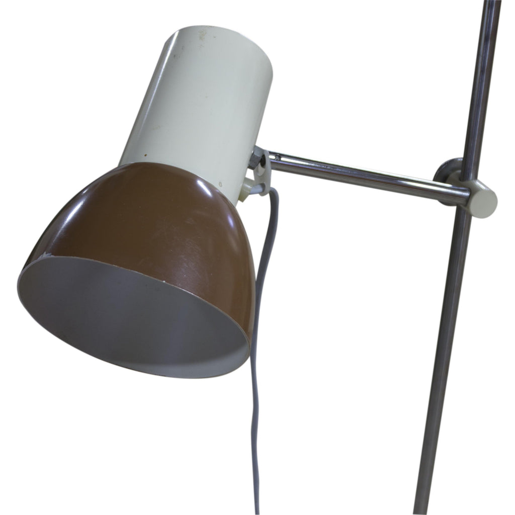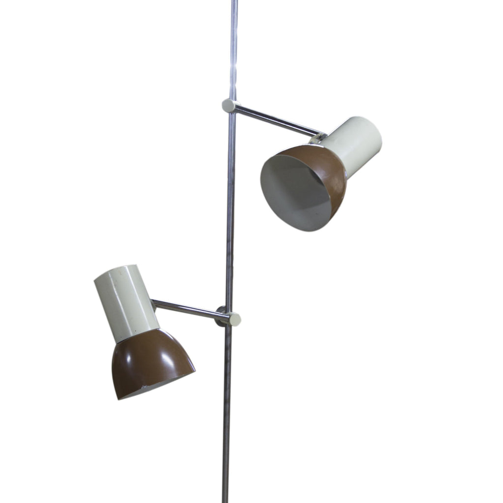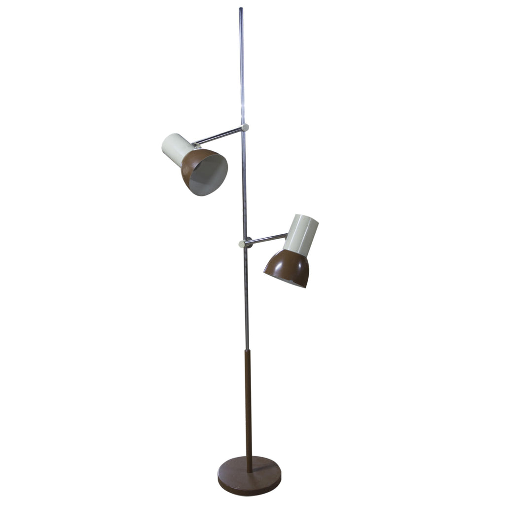 Elegant floor lamp circa 1960´s, Czechoslovakia, designed by famous Josef Hurka, great fitting, that allows the lamp heads to adjust up and down along the post. Turned aluminum tapered bell-shaped shade. The center rod is chromed steel. The shade moves up and down the rod and pivots.