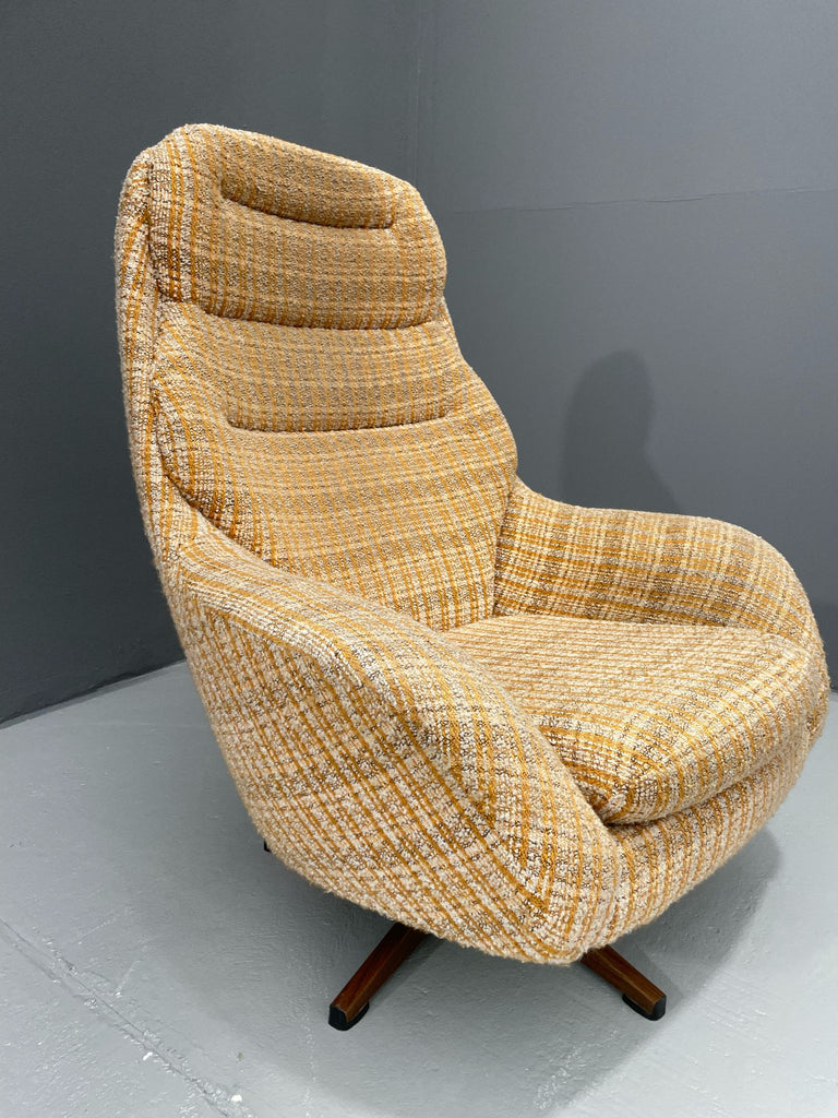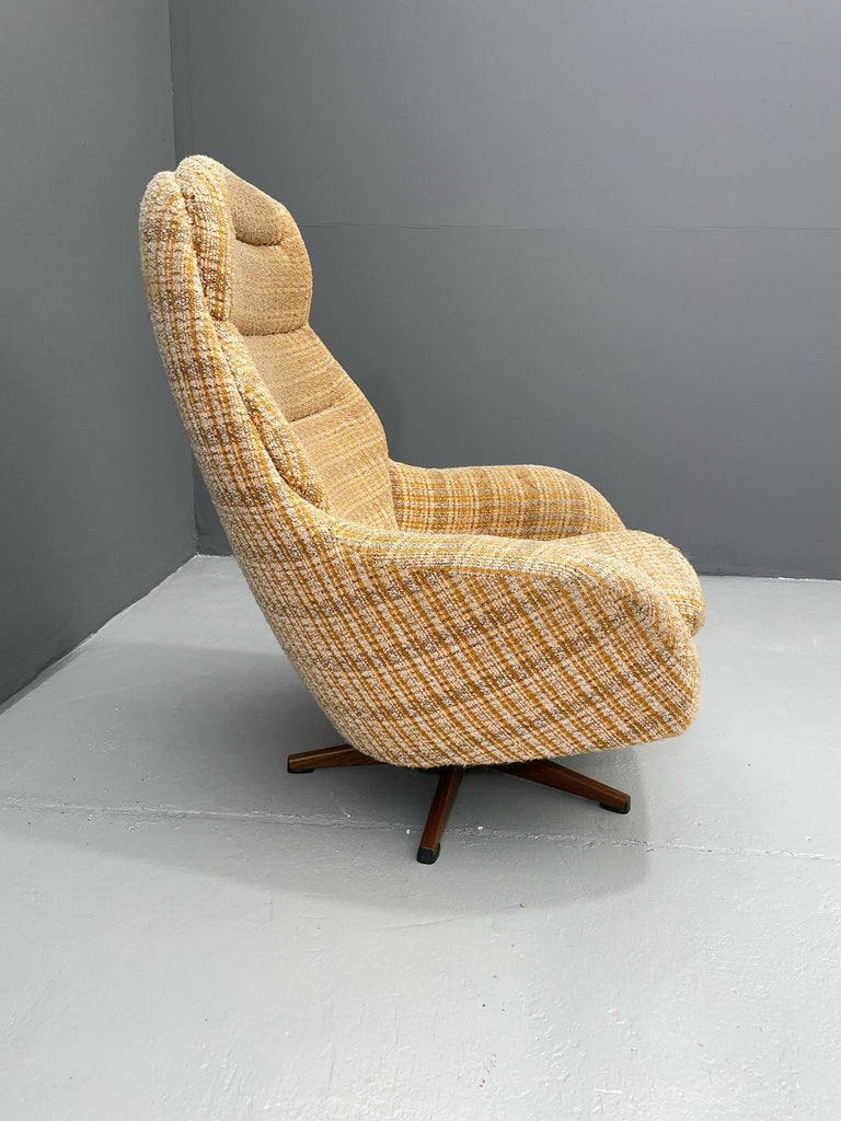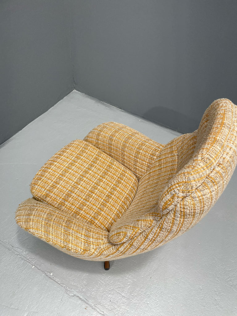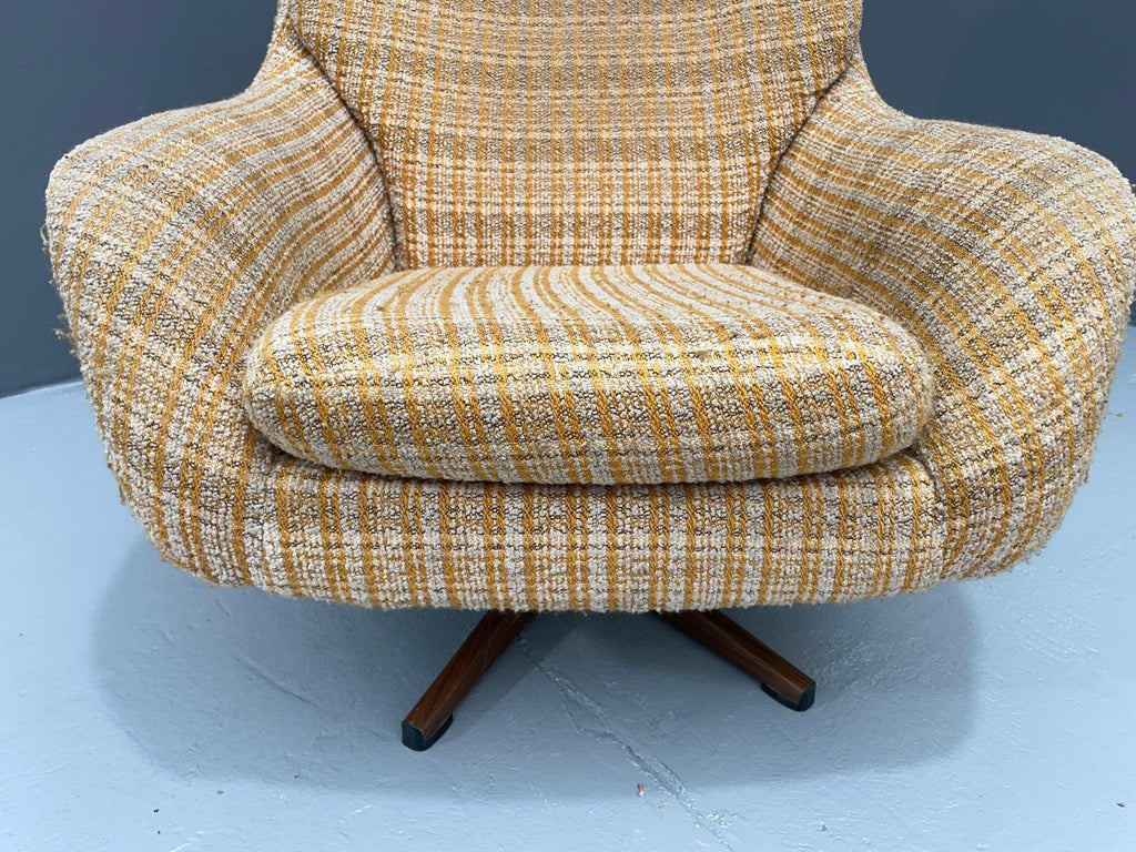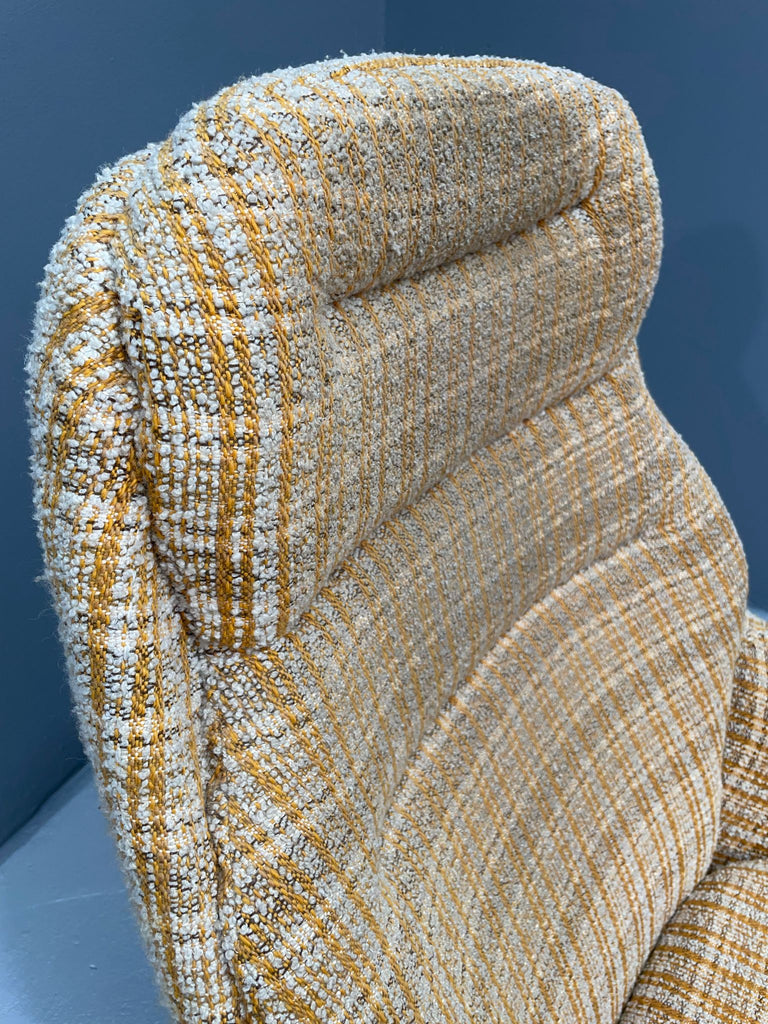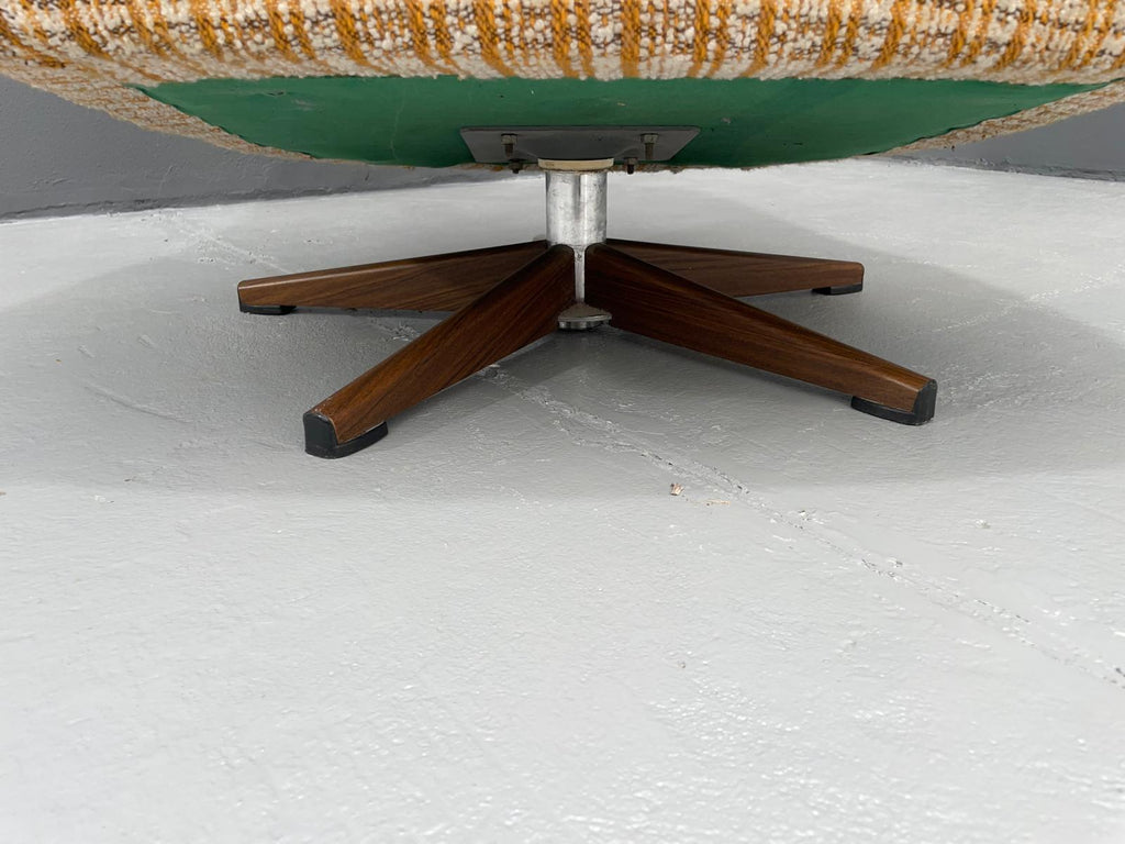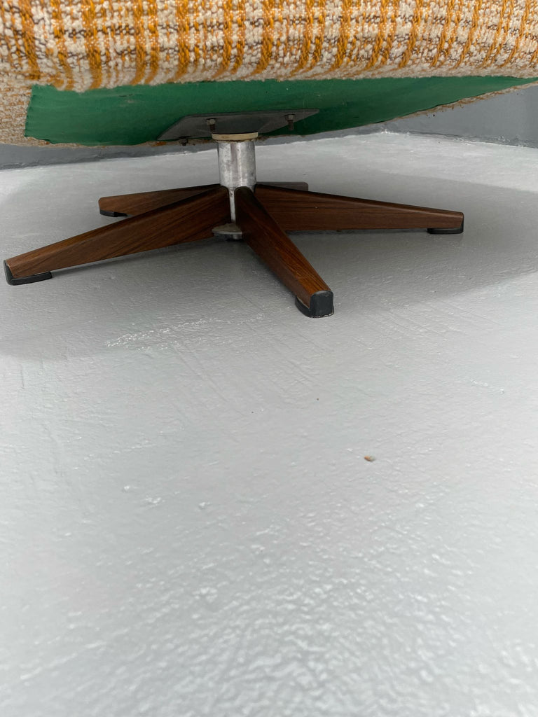 The seats and backrests are generously padded, ensuring a high level of seating comfort. The base is a four-spoke swivel support made of dark-stained wood. The upholstery is in good original condition with no major signs of wear, just need to be cleaned - we will figure it out before shipping.