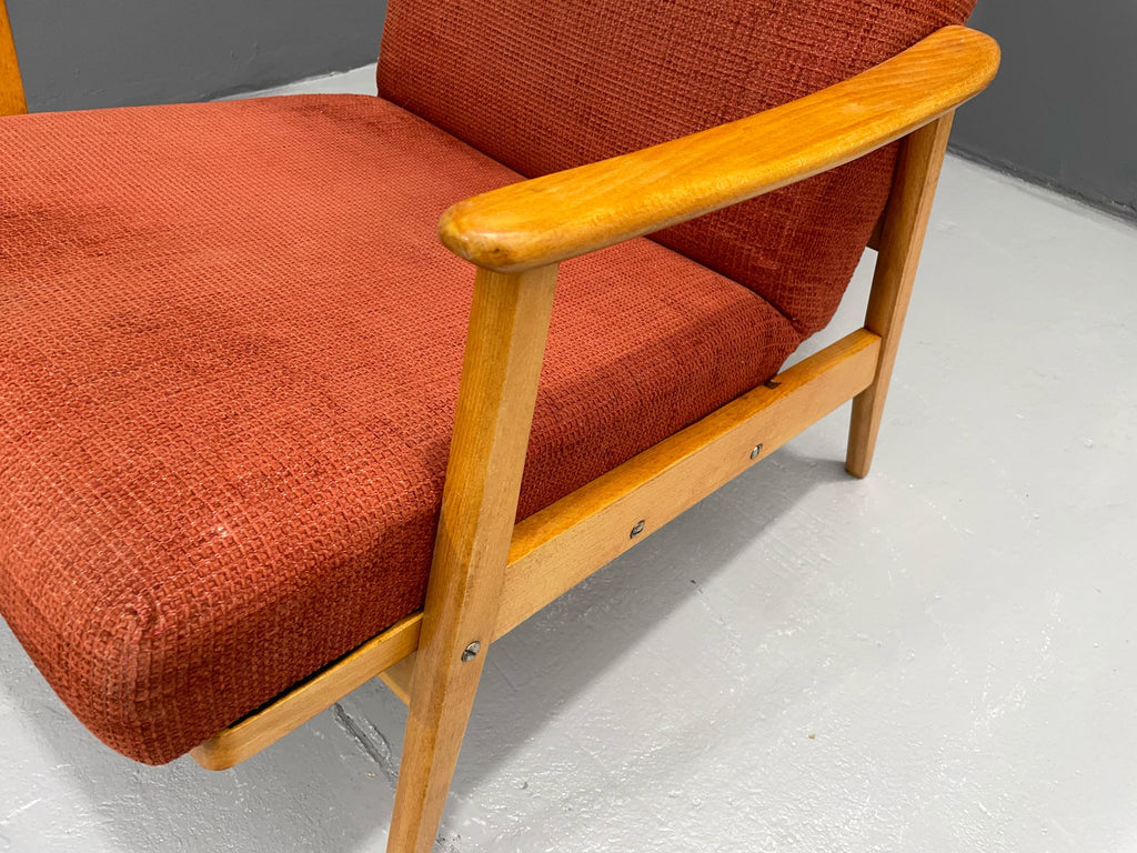 The chair is in very good condition with minimal signs of use consistent with its age. The wooden frame is intact and the upholstery is well preserved.