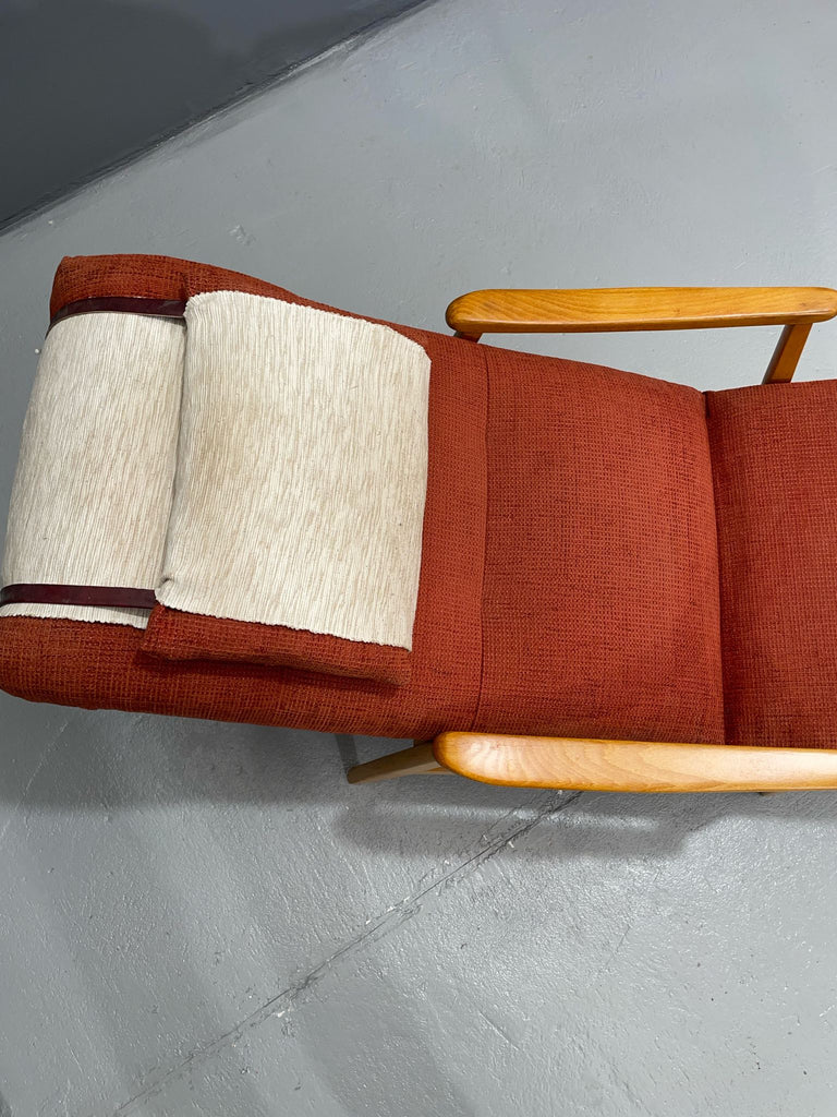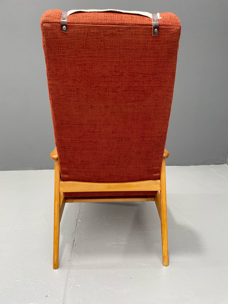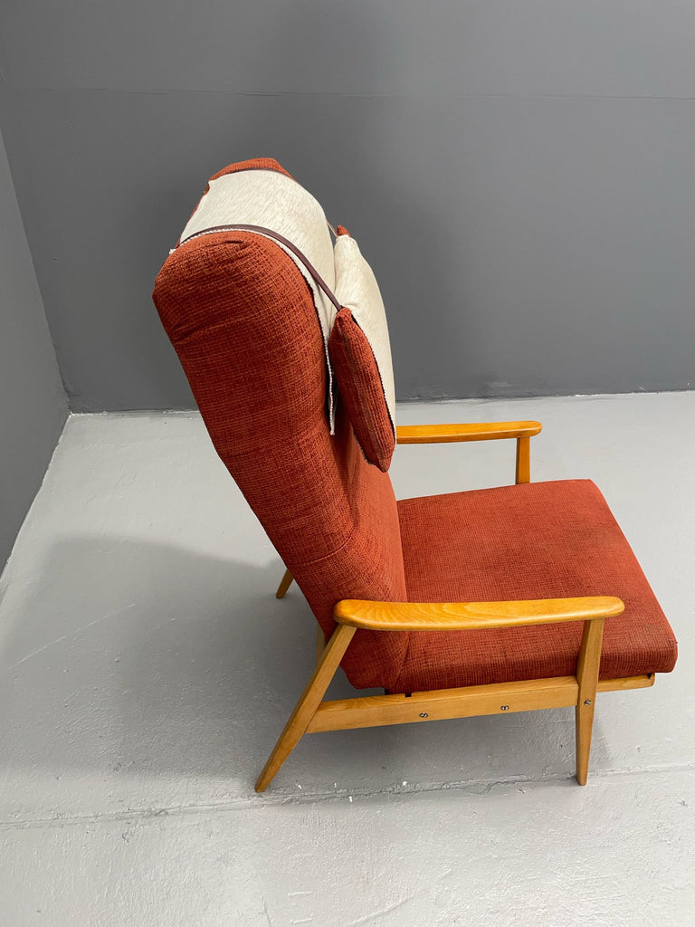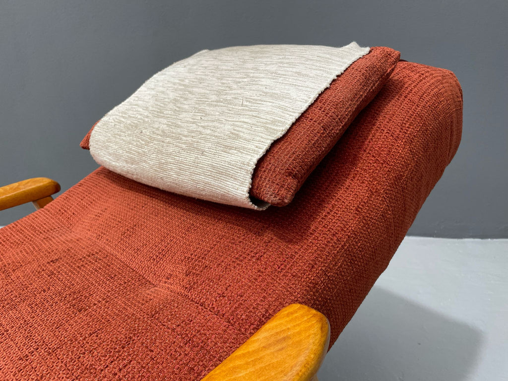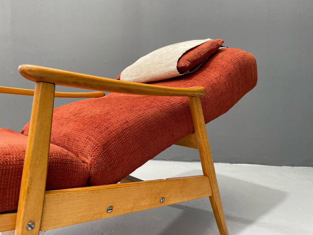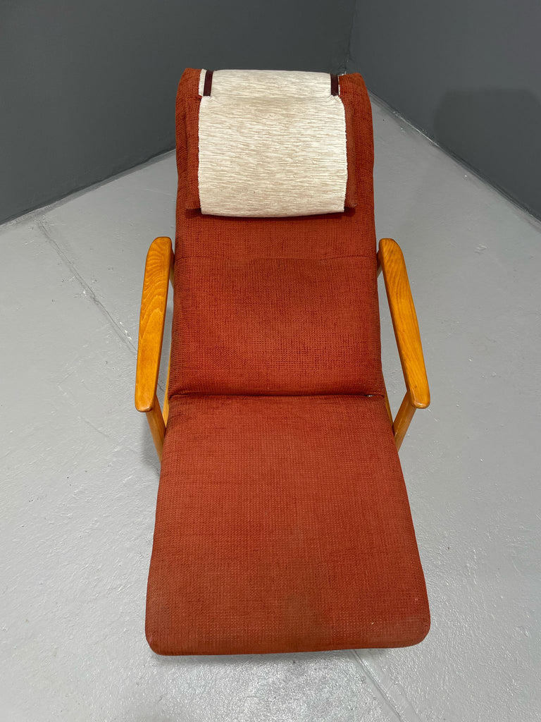 We offer a reclining armchair from the 1950s in Scandinavian Modern style, made in Sweden. The structure is crafted from solid beech wood, with seat and back upholstered in brick-red fabric. It includes a light-colored textile headrest for added comfort.