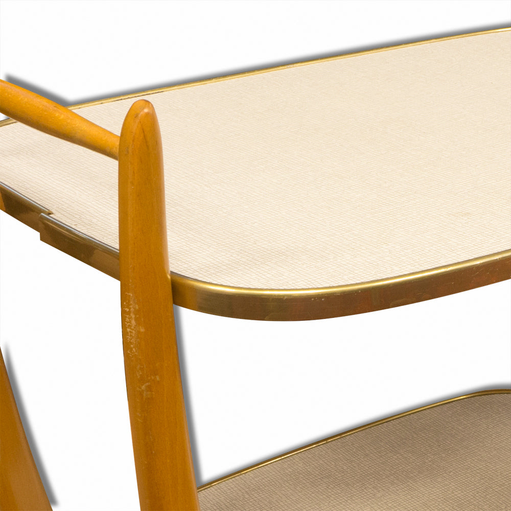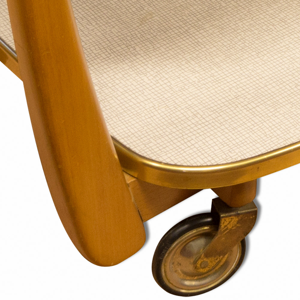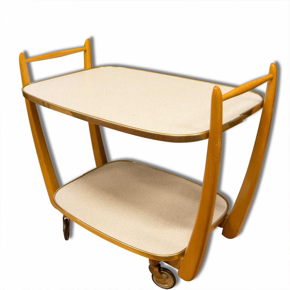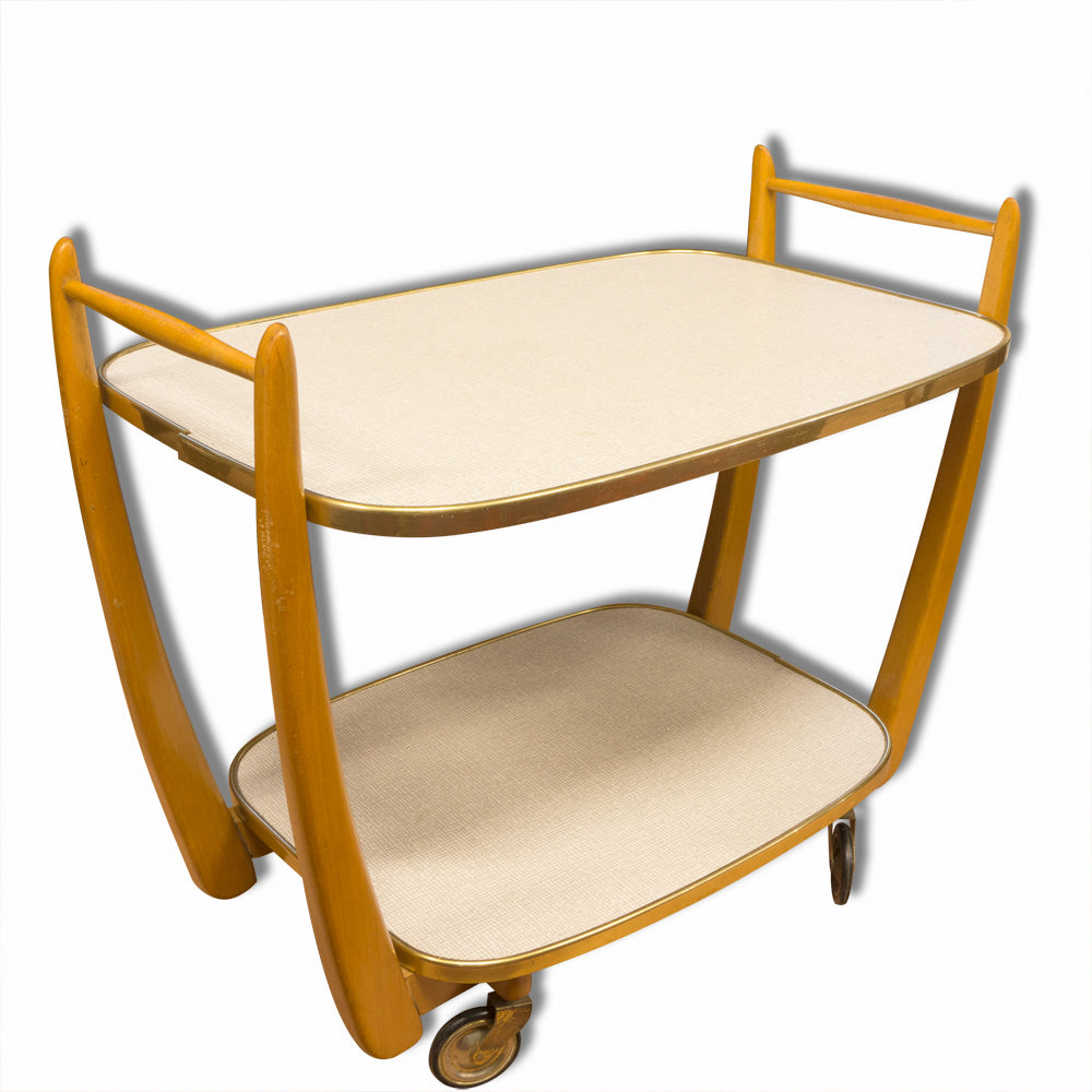 Very elegant mid century bar trolley or magazine stand/rack, dating to the 1960´s, manufactured probably in Germany Beech wood structure, laminated top plate.