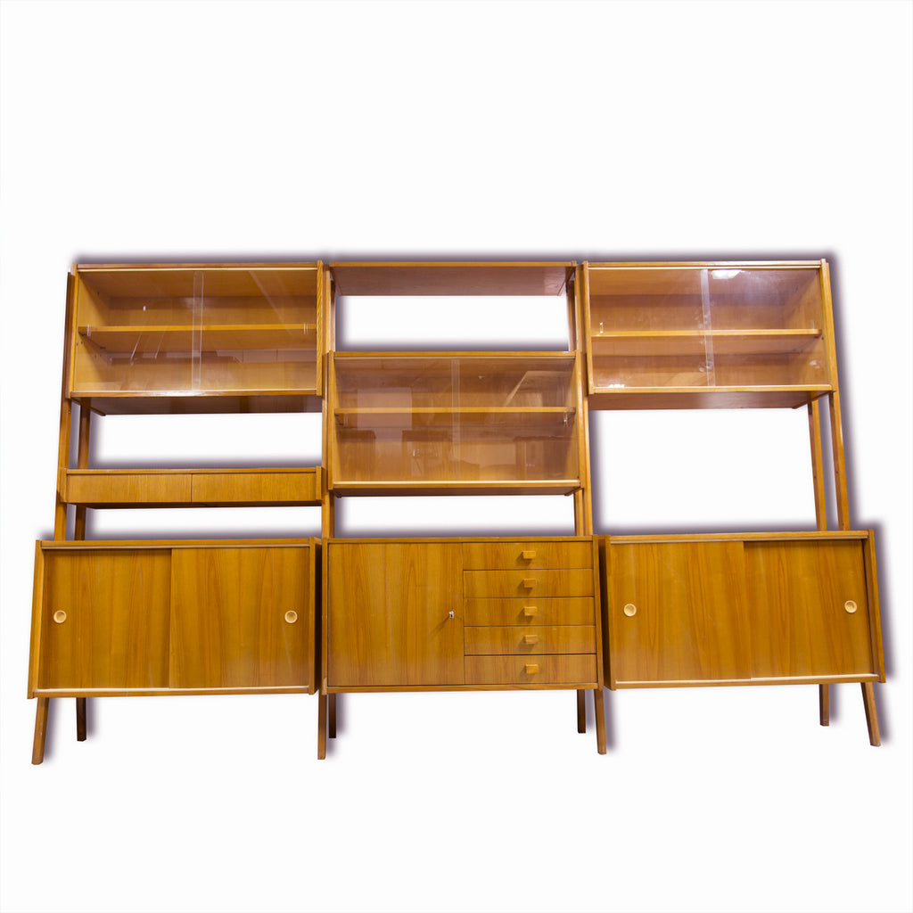 Mid Century Modern beech unit shelf system by Frantisek Jirak for Tatra nabytok. Made in Czechoslovakia during the 1960´s. The system is made from beech wood. The unit is a part of living set. In very good Vintage condition without any visible damage.