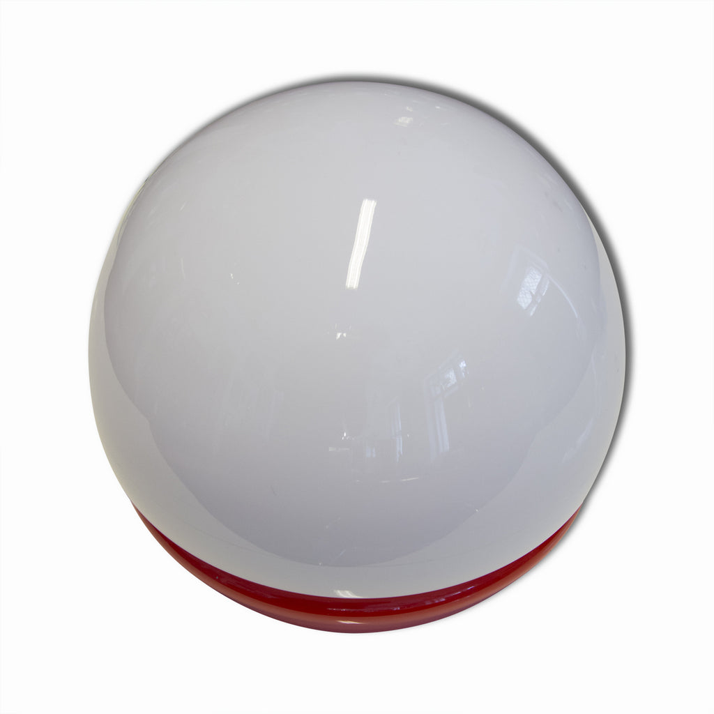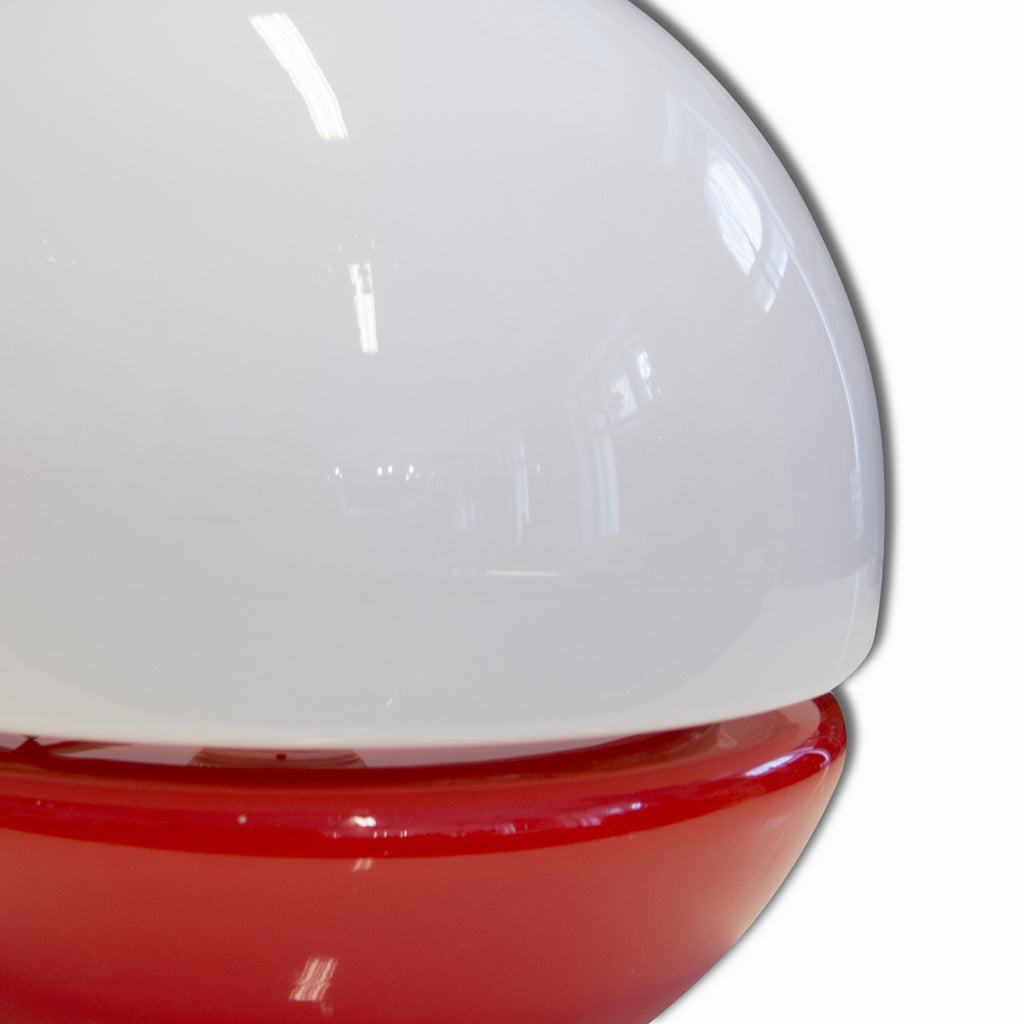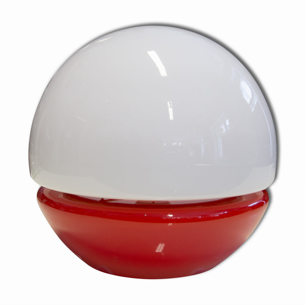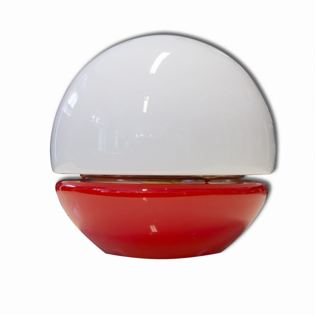 Mid century glass desk lamp associated with "Brussels period" and world-renowned EXPO58. Designed by Stepan Tabera, Czechoslovakia. The lamp is made of glass. The round shape of the lamp is composed of two domes. The lower dome is reddish and glass top of the dome is a milky color. The upper dome can be removed. This lamp was made in the second half of the 20th century.