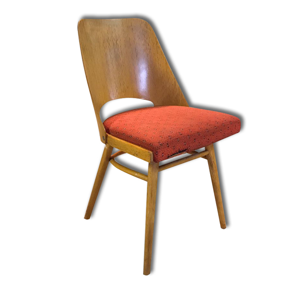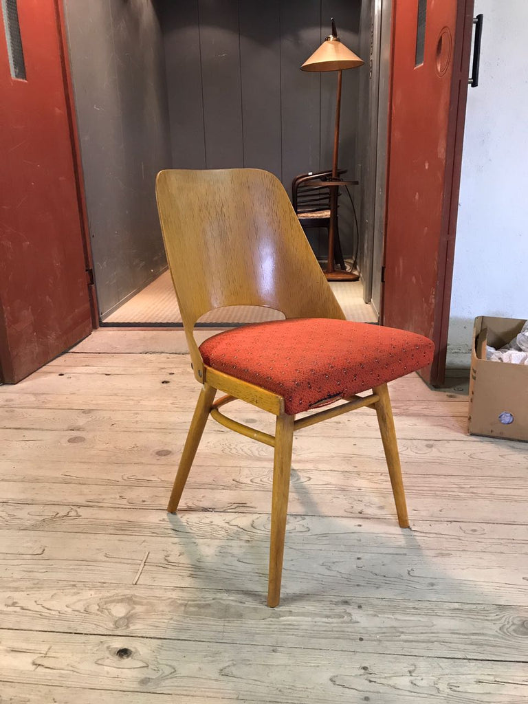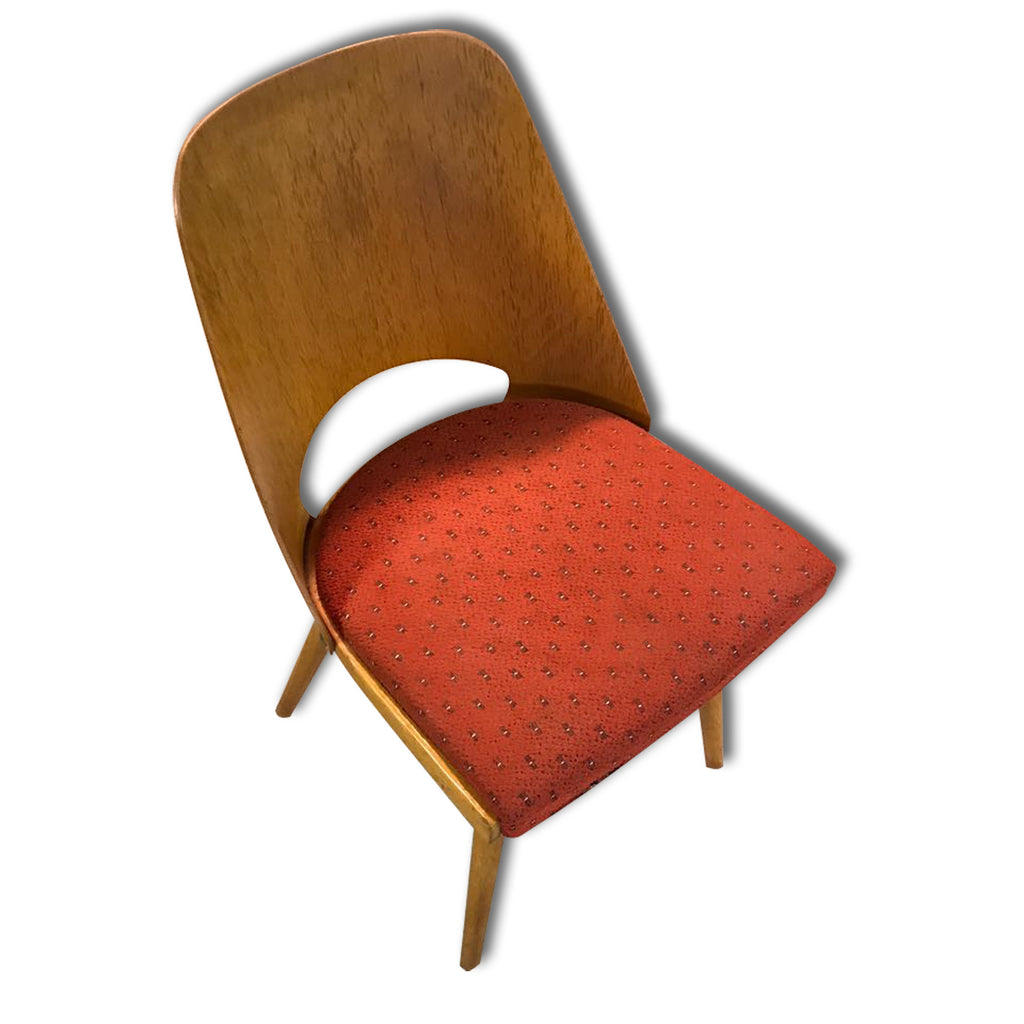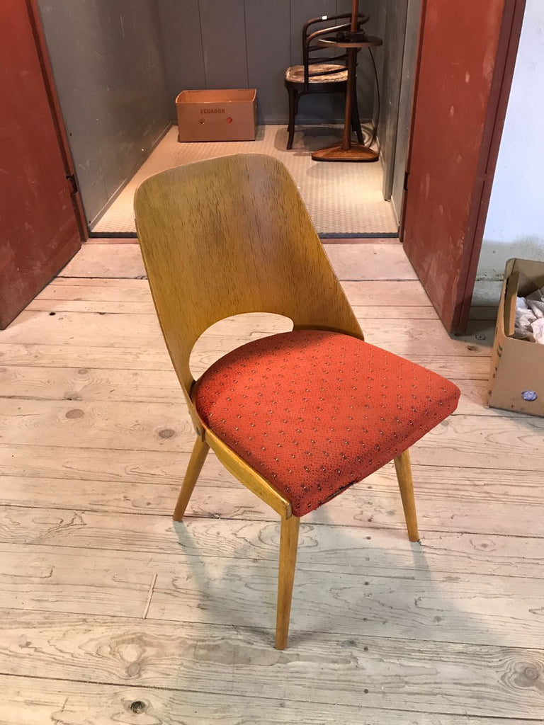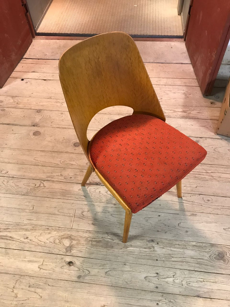 An interesting vintage chairs in the Oswald Haerdtl style, upholstered, beech wood. A typical example of Czechoslovak design after the huge success of the Czechoslovak pavilion at Expo 58 in Brussels. The wooden structure and upholstery are in their original condition. This chairs remains fully functional, but it shows sign of age through scuffs, dings, faded finishes, minimal upholstery defects, or visible repairs.