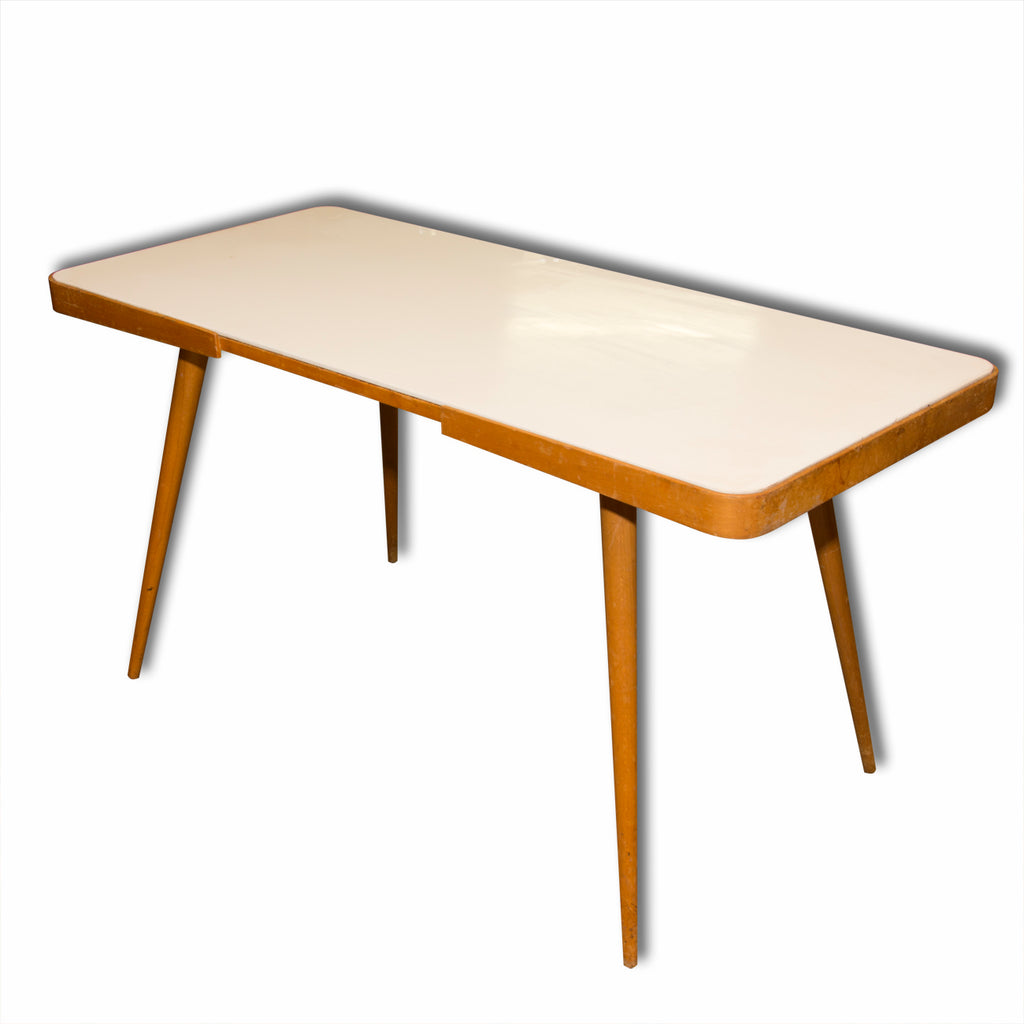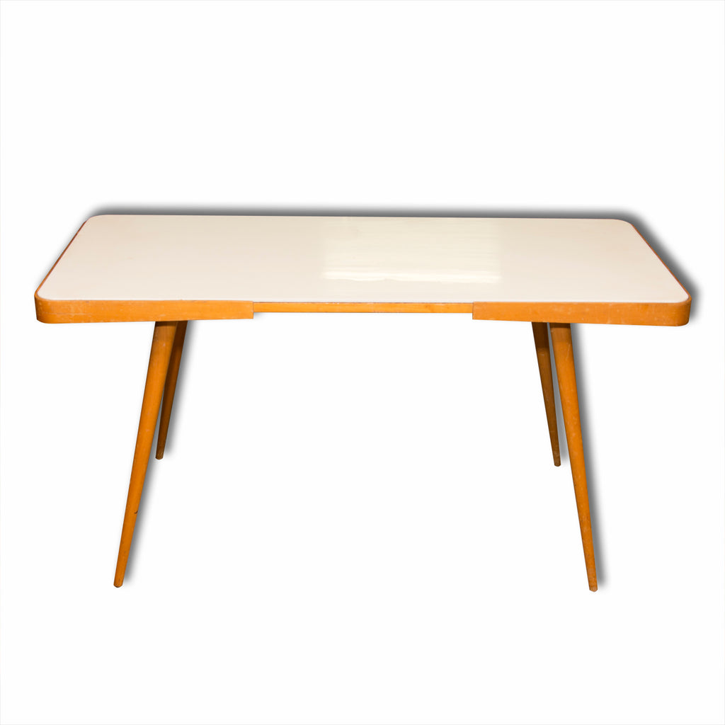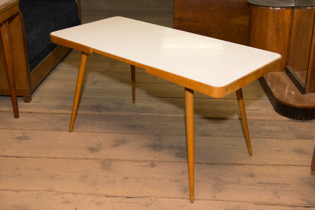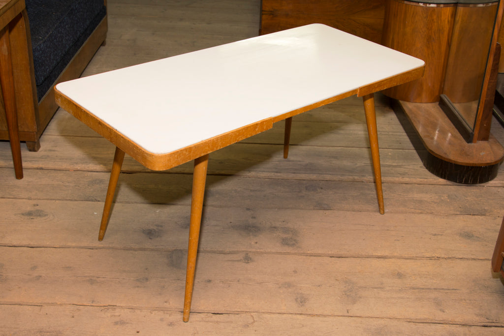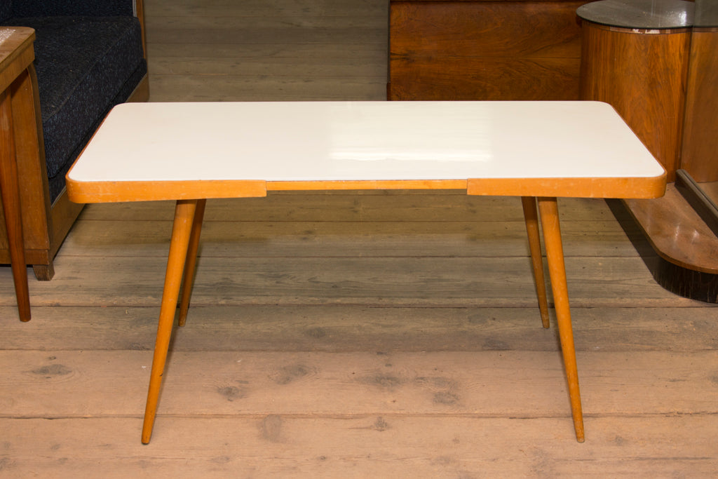 Mid century long coffee table, glass table top in white color, 1960´s. Associated with world-renowned exhibition EXPO 58 in Brussels. Beechwood, an opaxit glass. In good Vintage condition.