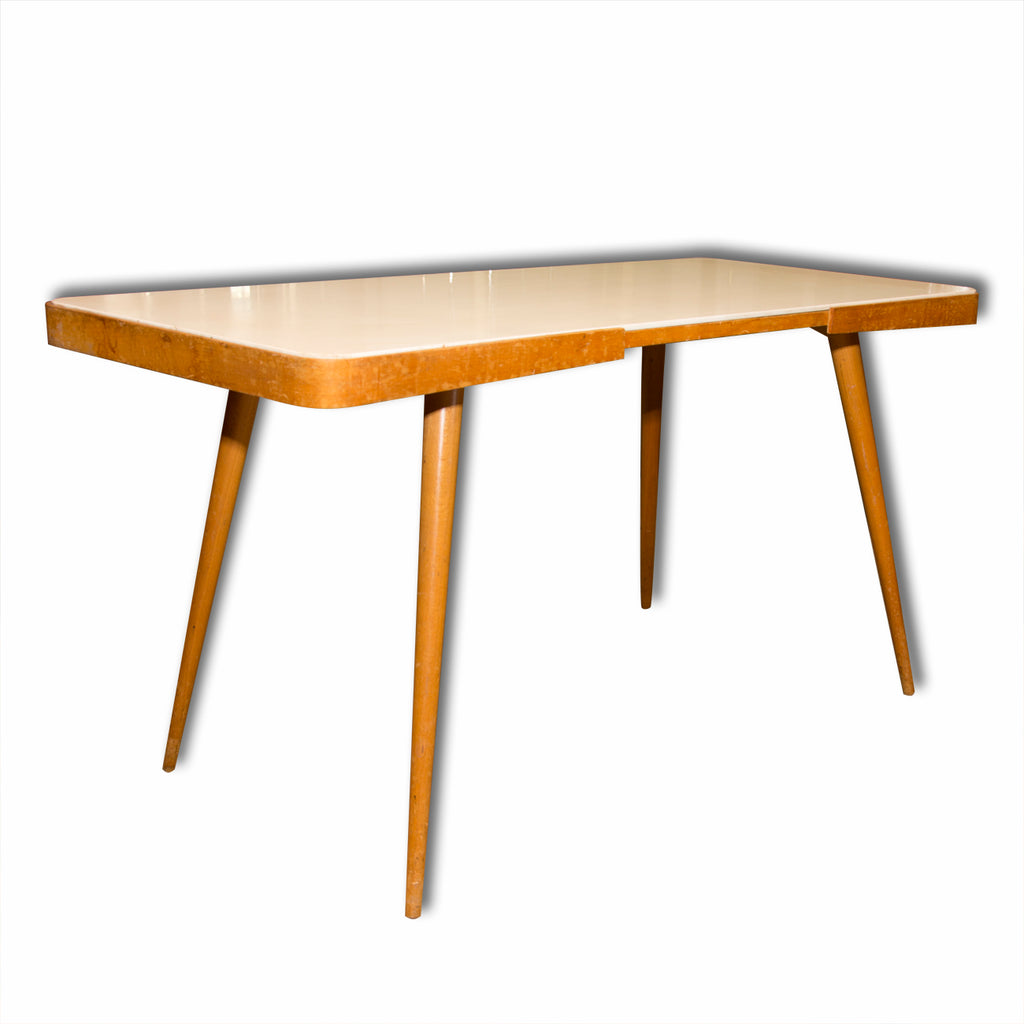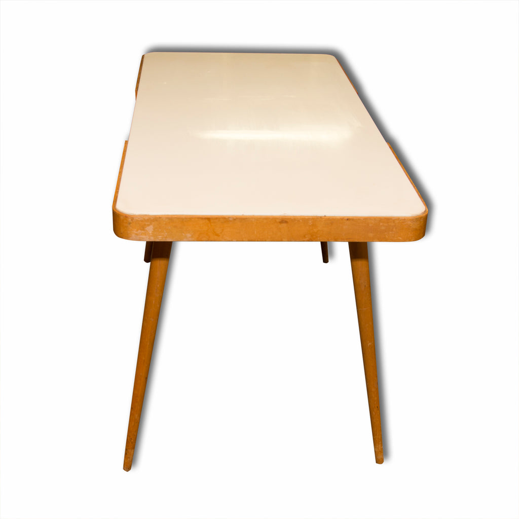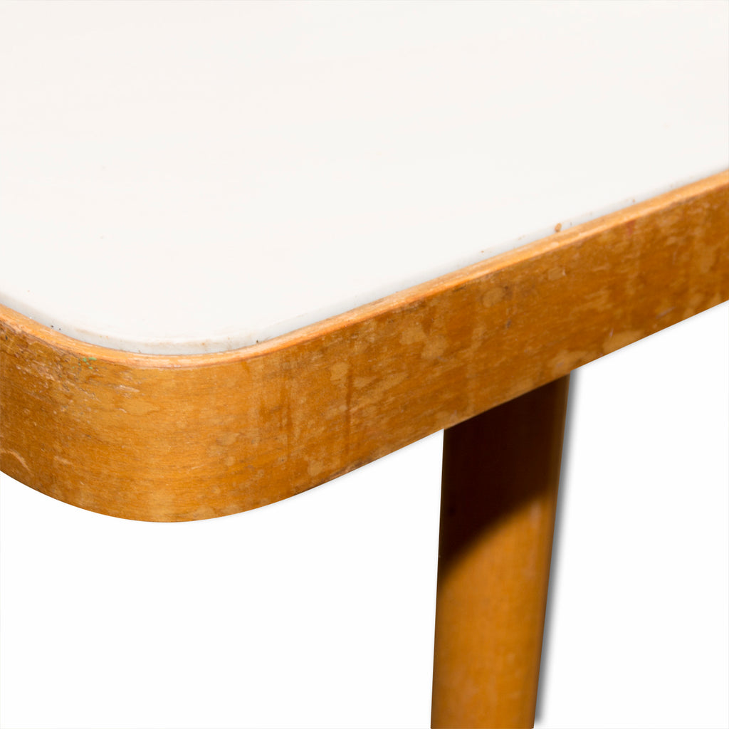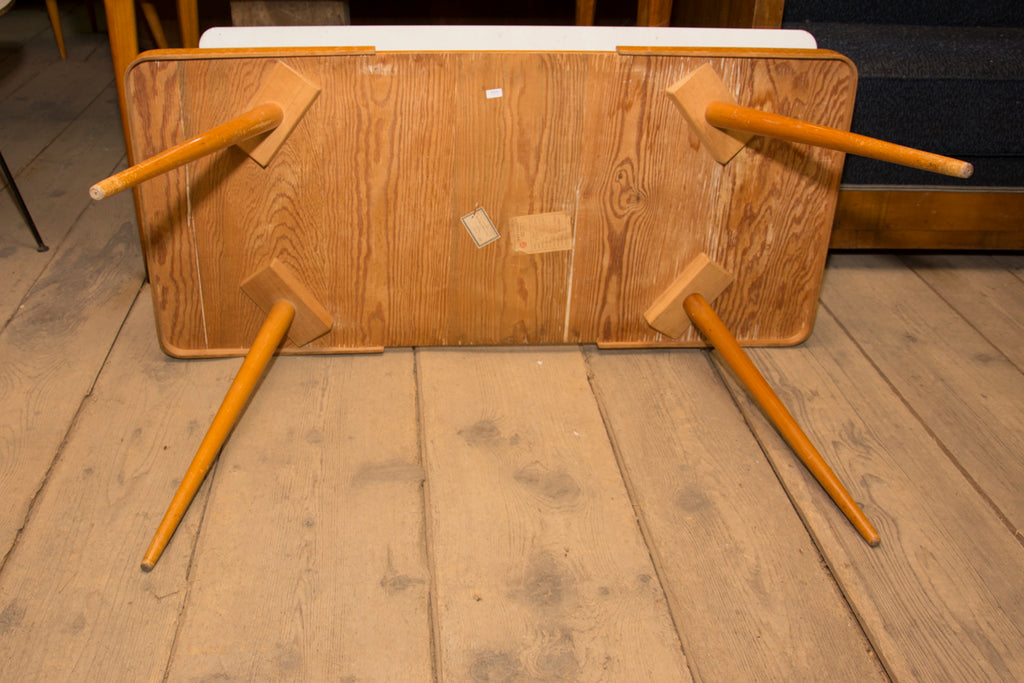 Mid century long coffee table, glass table top in white color, 1960´s. Associated with world-renowned exhibition EXPO 58 in Brussels. Beechwood, an opaxit glass. In good Vintage condition.