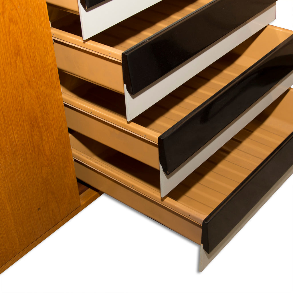 A popular Vintage sideboard model U-460 from the 1960´s. It was designed by Jiri Jiroutek for Interier Praha. In very good condition. Beechwood, plywood. Colored lacquered drawers.