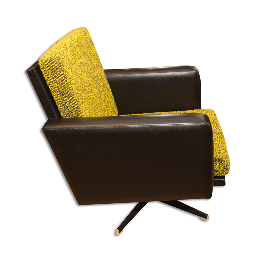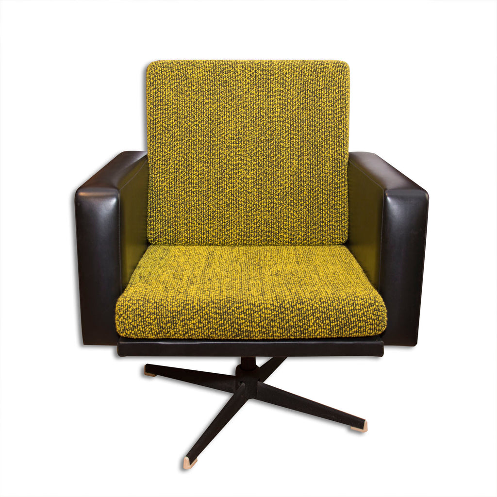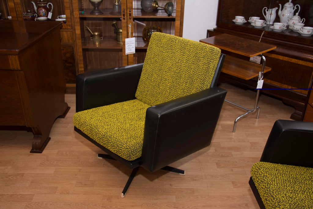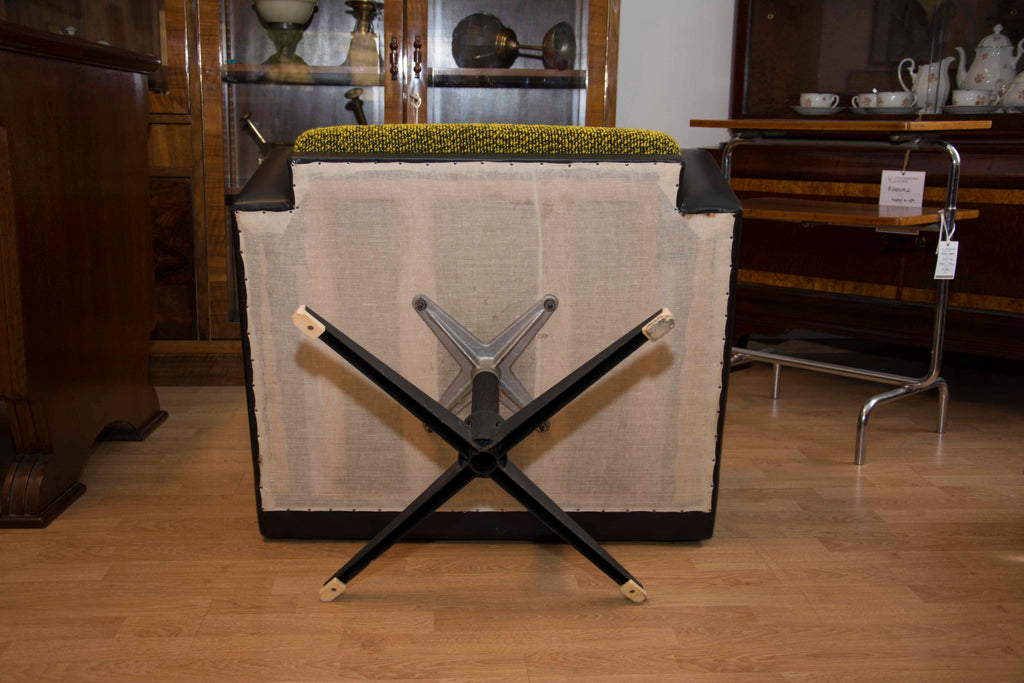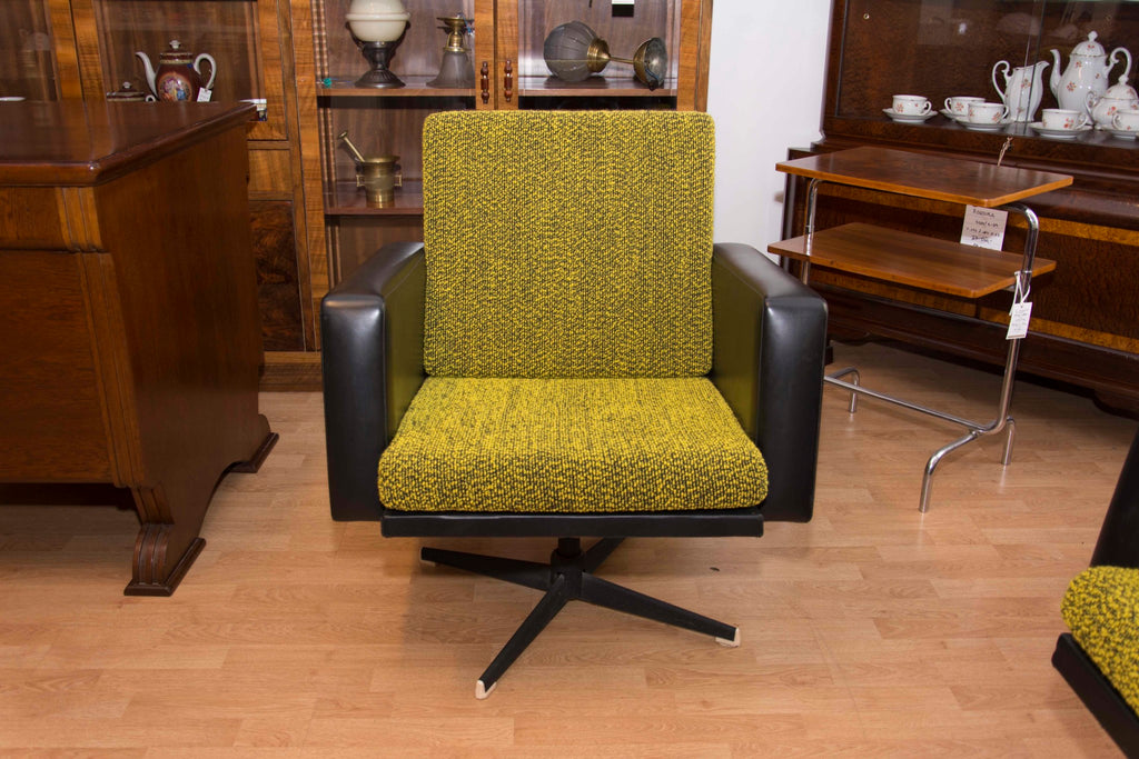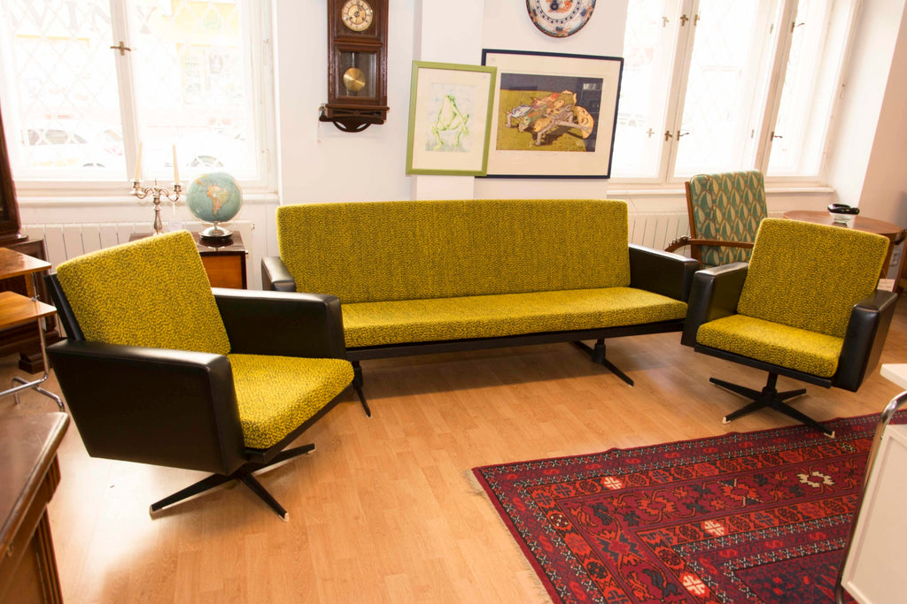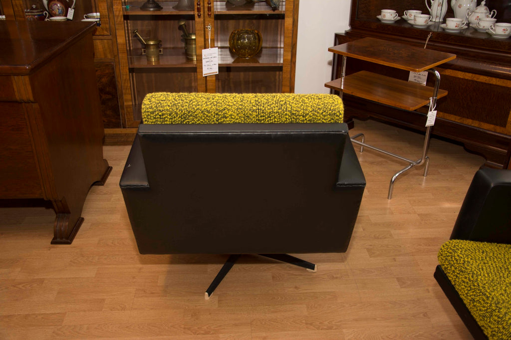 This lounge or office set was made in Czechoslovakia in the 1970´s and consists of one sofa and a pair of swivel armchairs. The set is upholstered with brown leatherette and features original light green upholstery. The legs are made from iron. All in original condition. Price is for the set. The furniture is in excellent original condition.