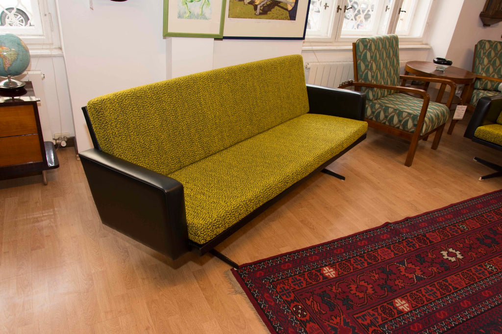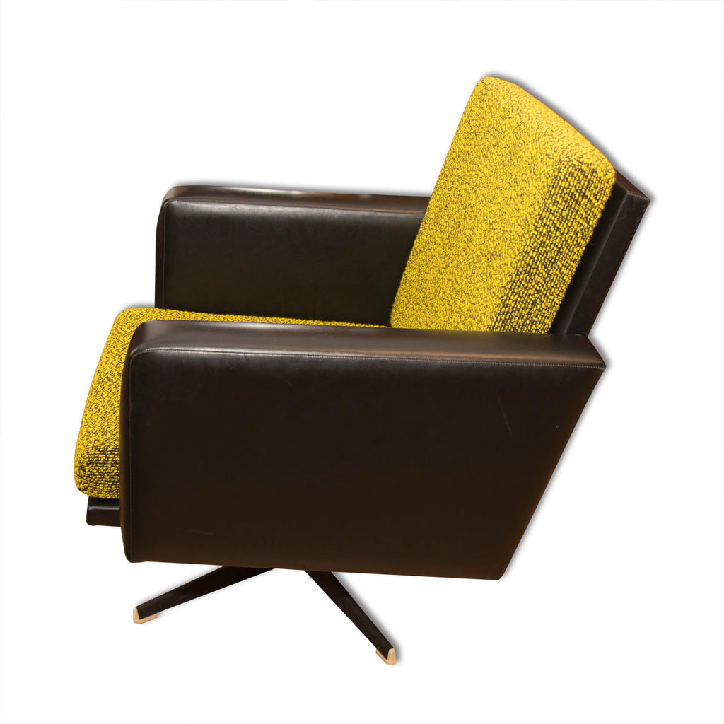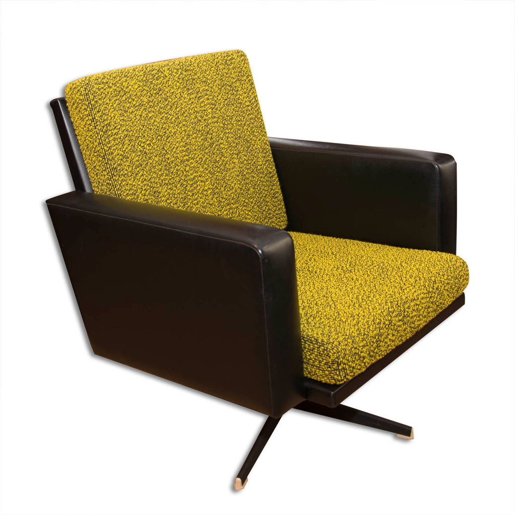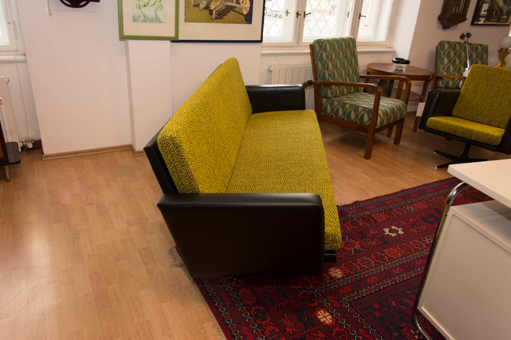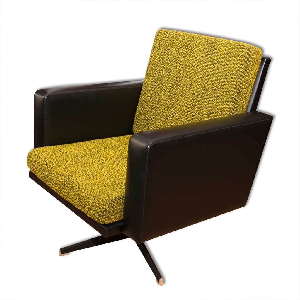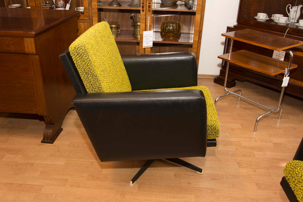 This lounge or office set was made in Czechoslovakia in the 1970´s and consists of one sofa and a pair of swivel armchairs. The set is upholstered with brown leatherette and features original light green upholstery. The legs are made from iron. All in original condition. Price is for the set. The furniture is in excellent original condition.