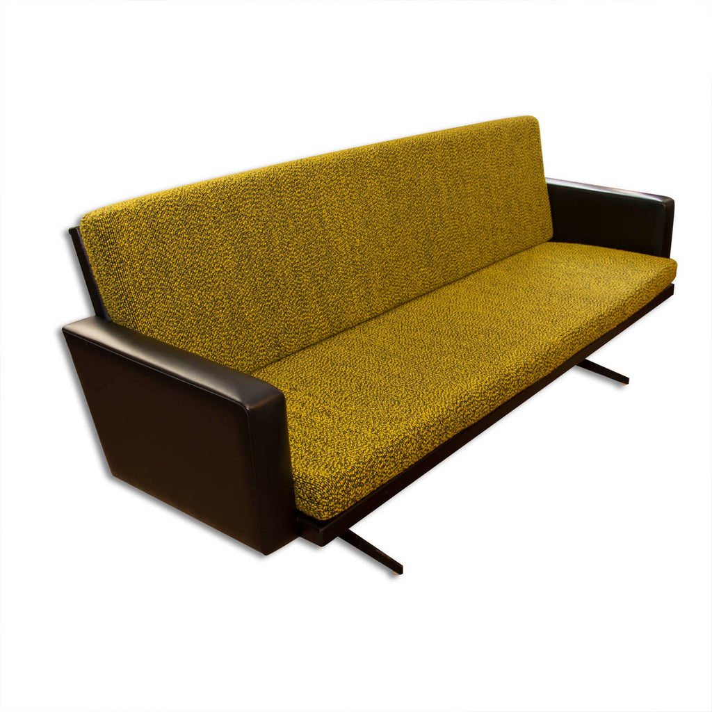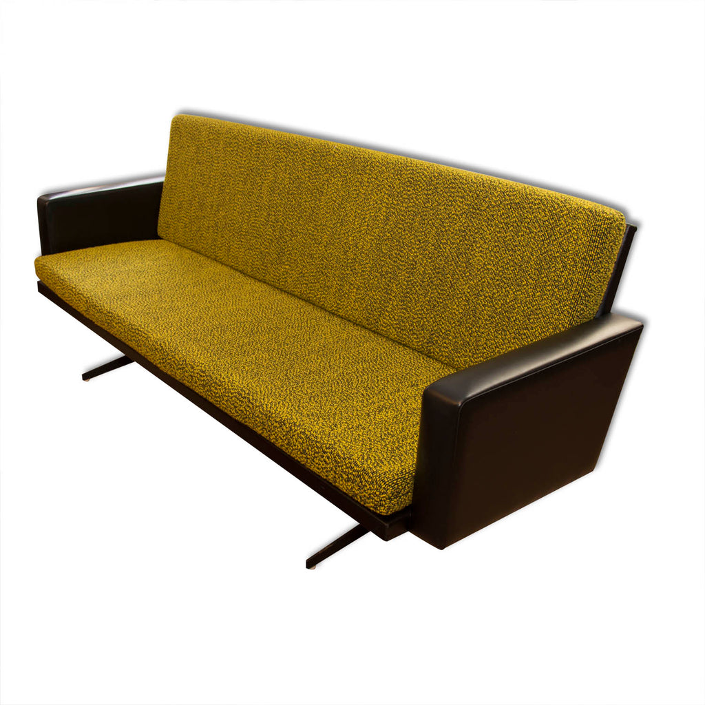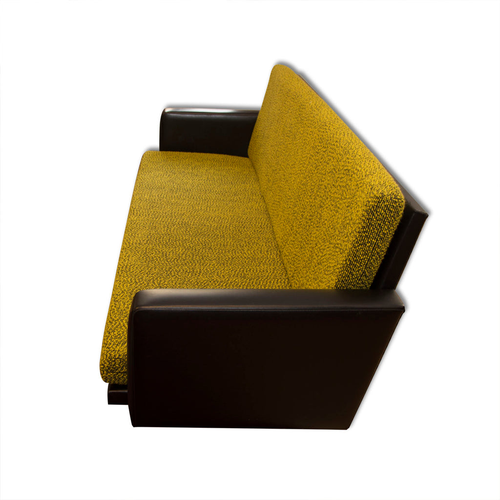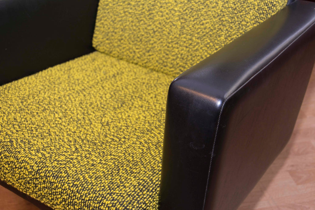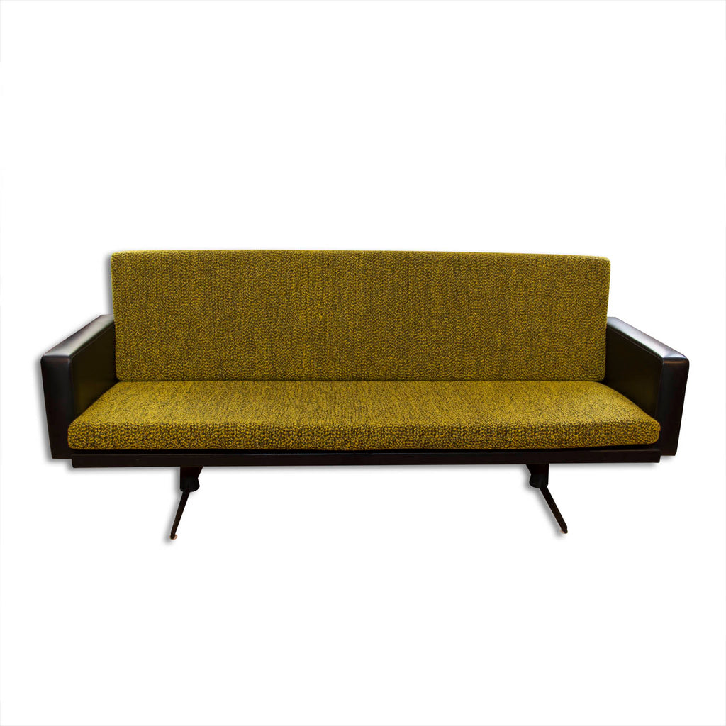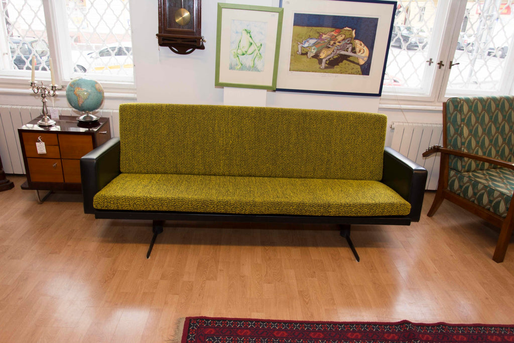 This lounge or office set was made in Czechoslovakia in the 1970´s and consists of one sofa and a pair of swivel armchairs. The set is upholstered with brown leatherette and features original light green upholstery. The legs are made from iron. All in original condition. Price is for the set. The furniture is in excellent original condition.