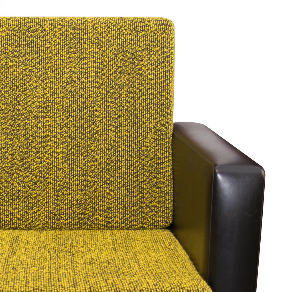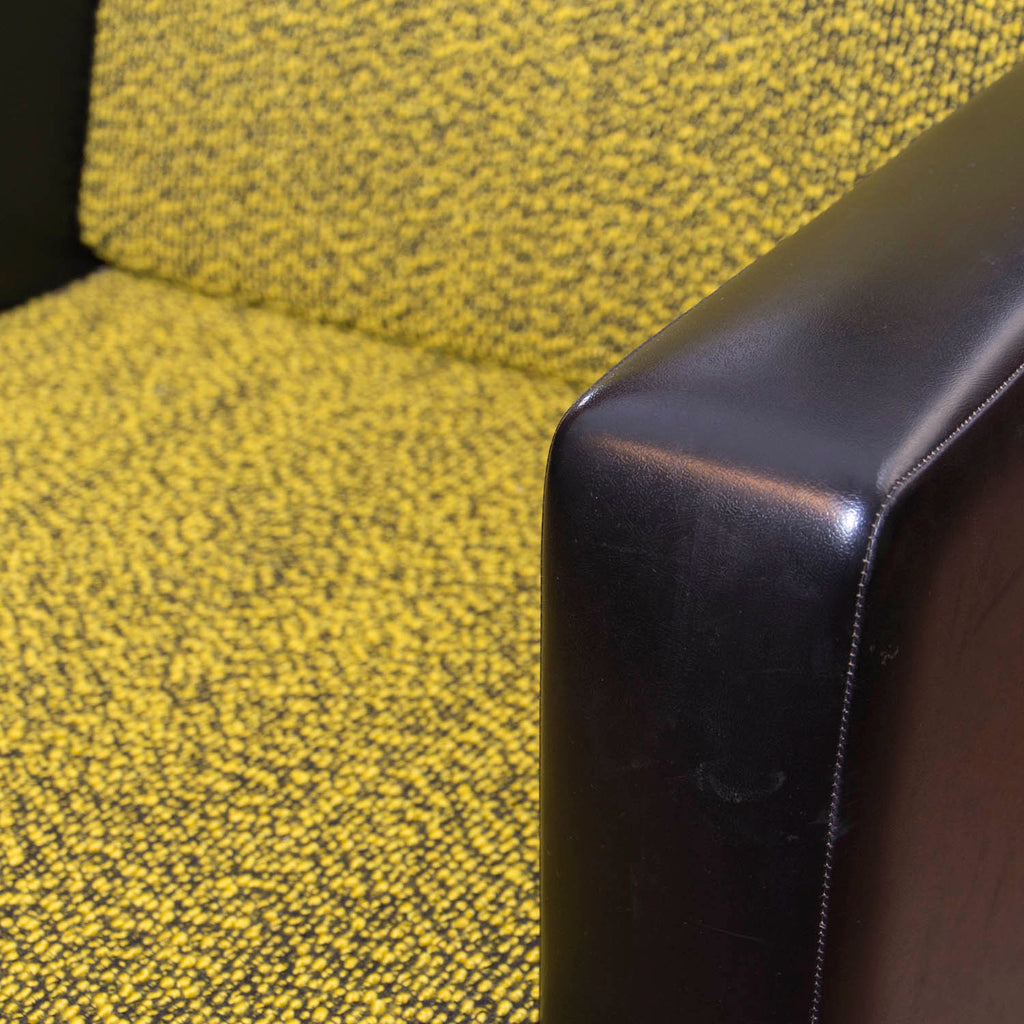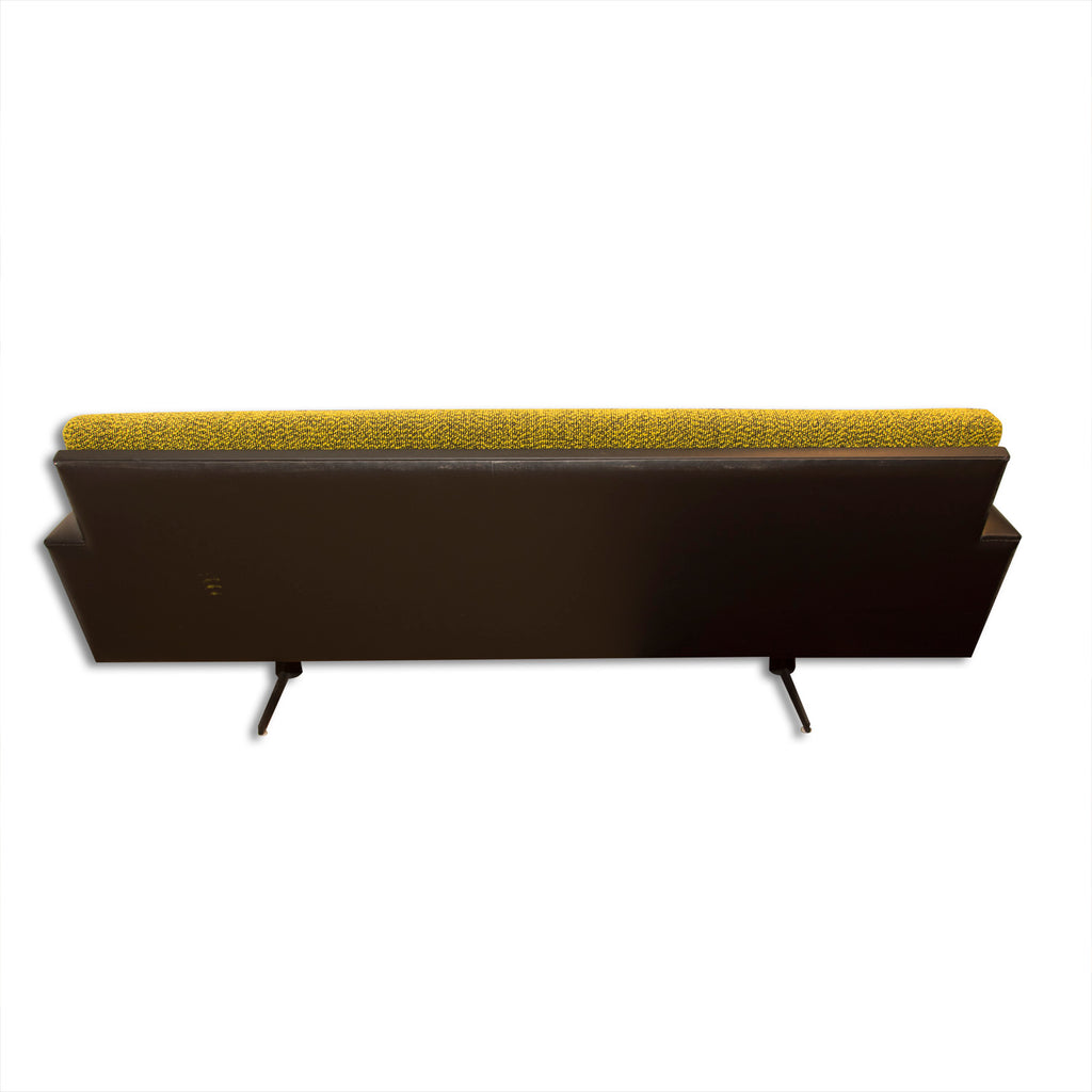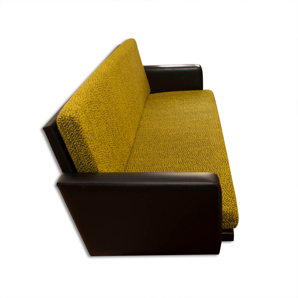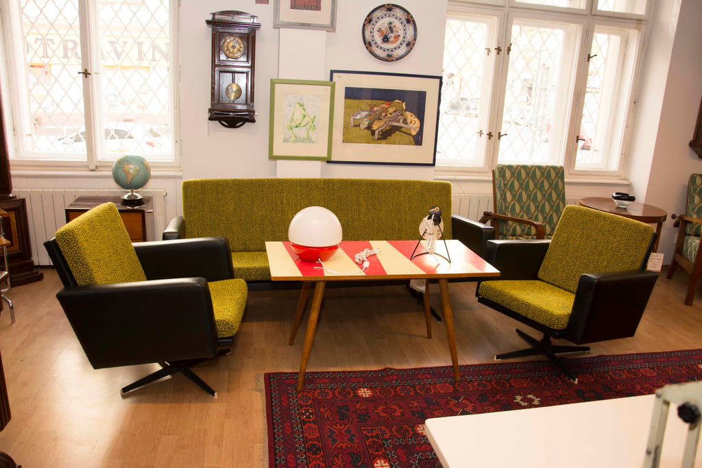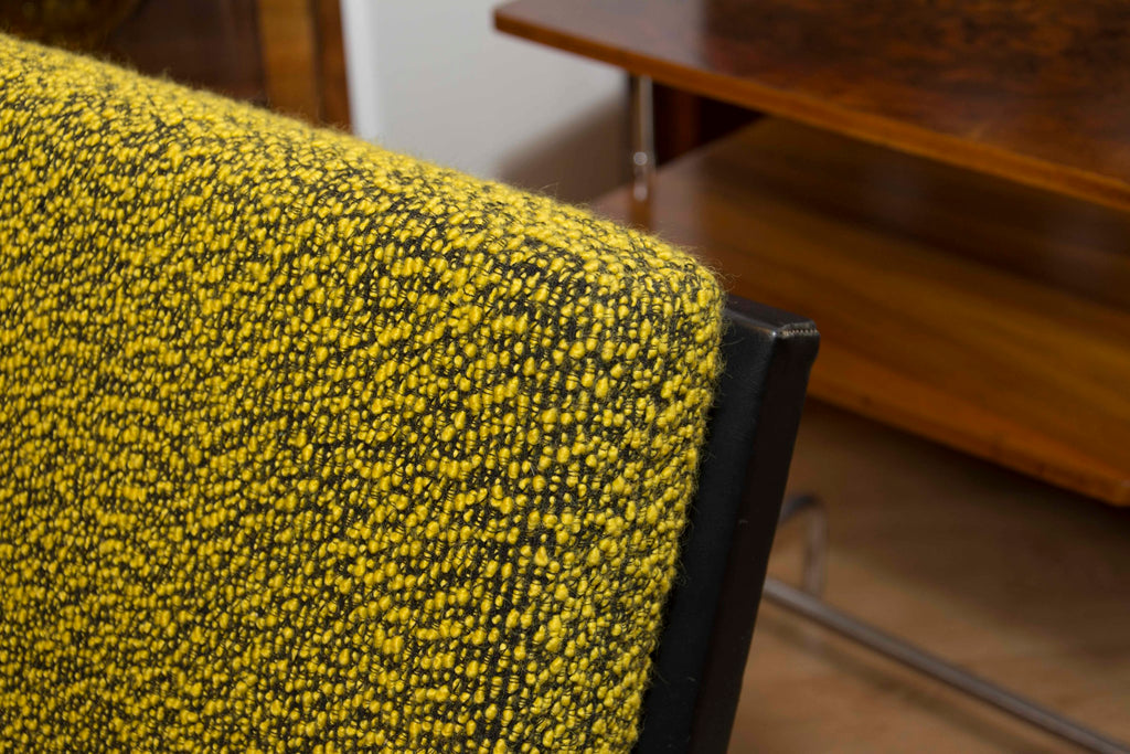 This lounge or office set was made in Czechoslovakia in the 1970´s and consists of one sofa and a pair of swivel armchairs. The set is upholstered with brown leatherette and features original light green upholstery. The legs are made from iron. All in original condition. Price is for the set. The furniture is in excellent original condition.