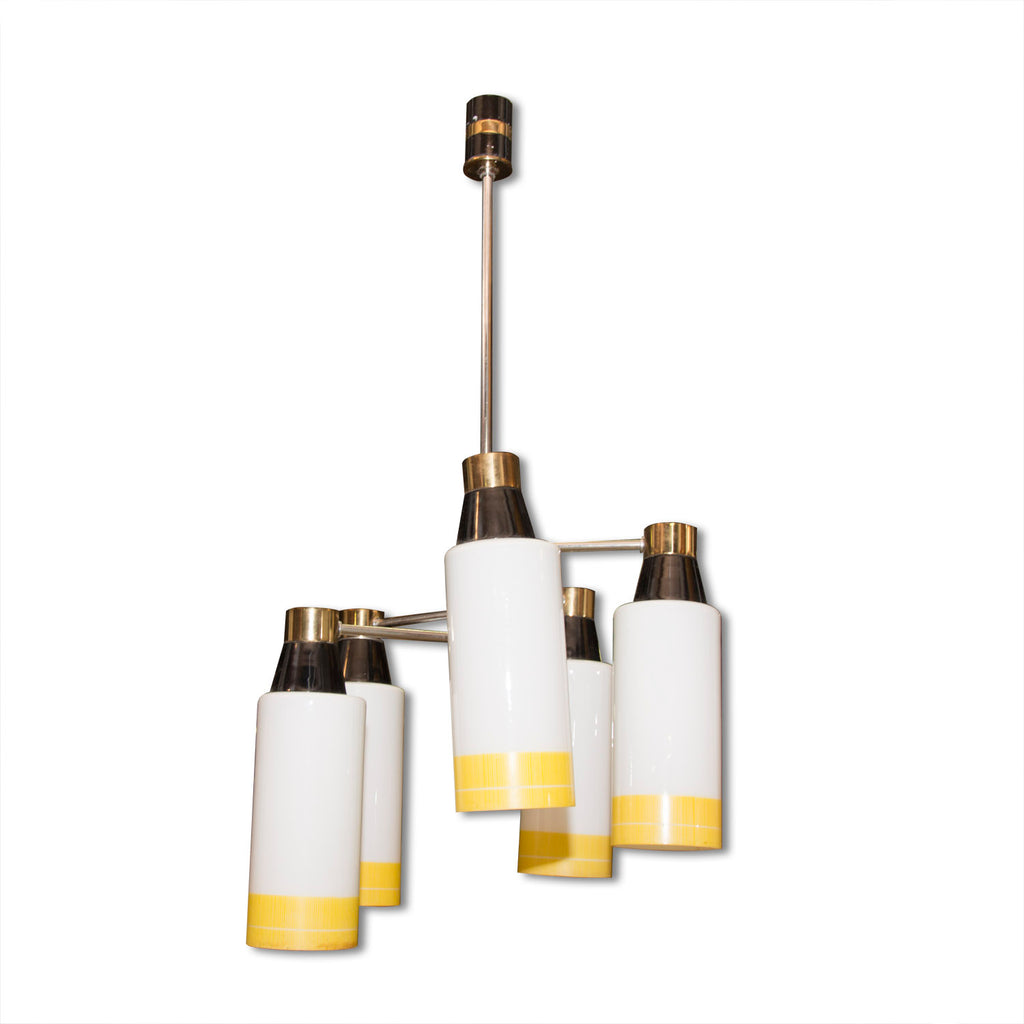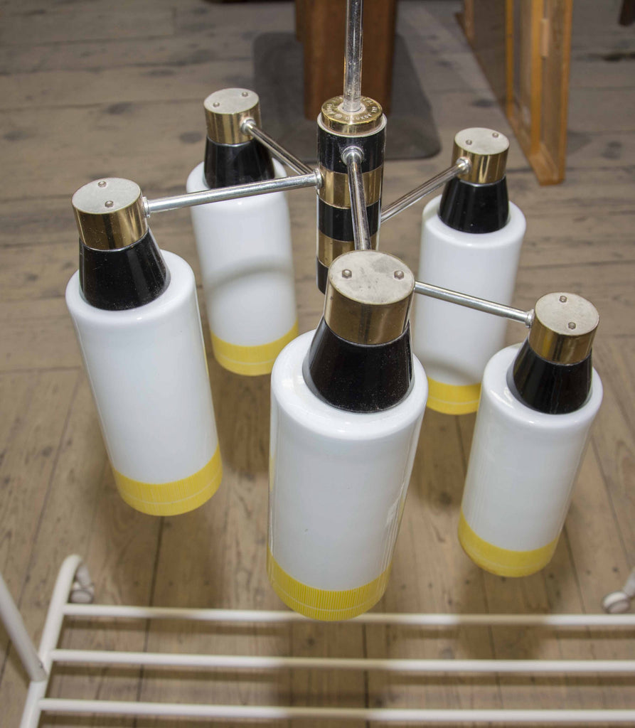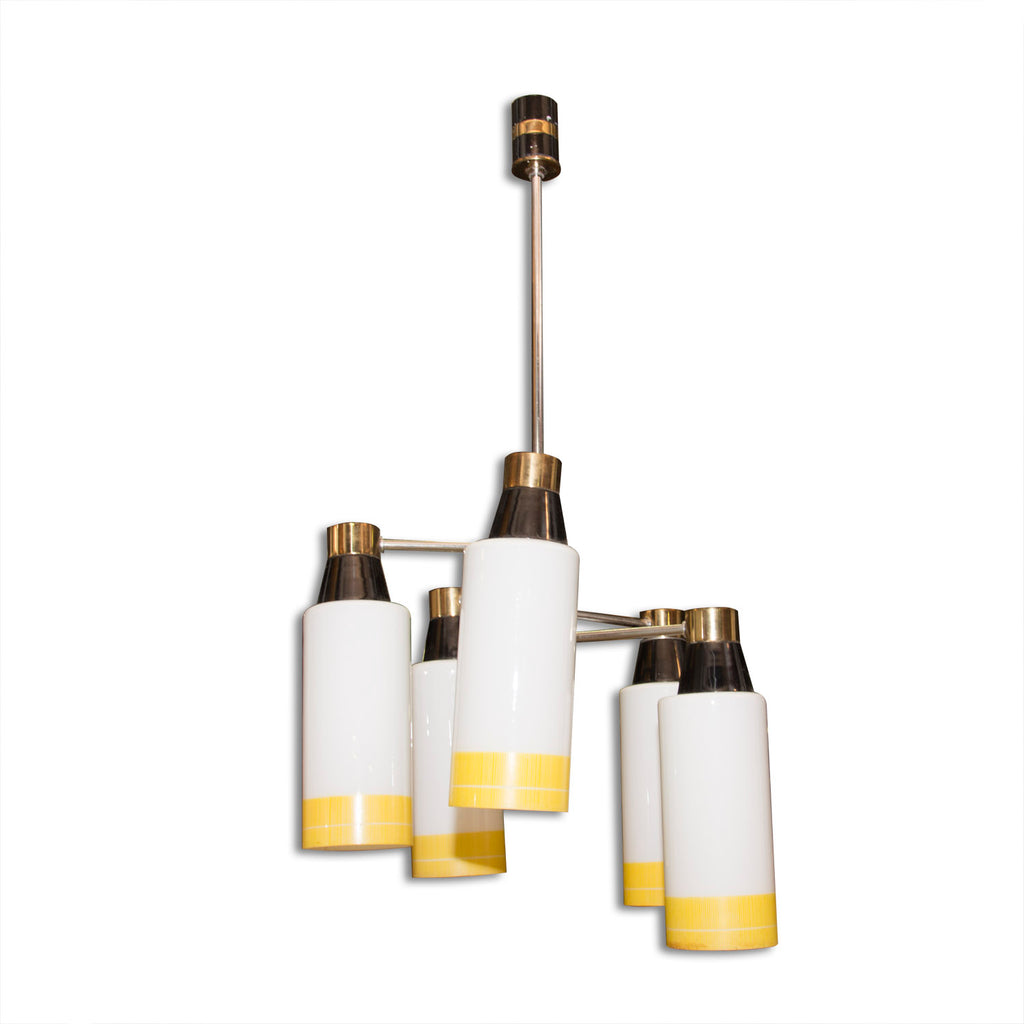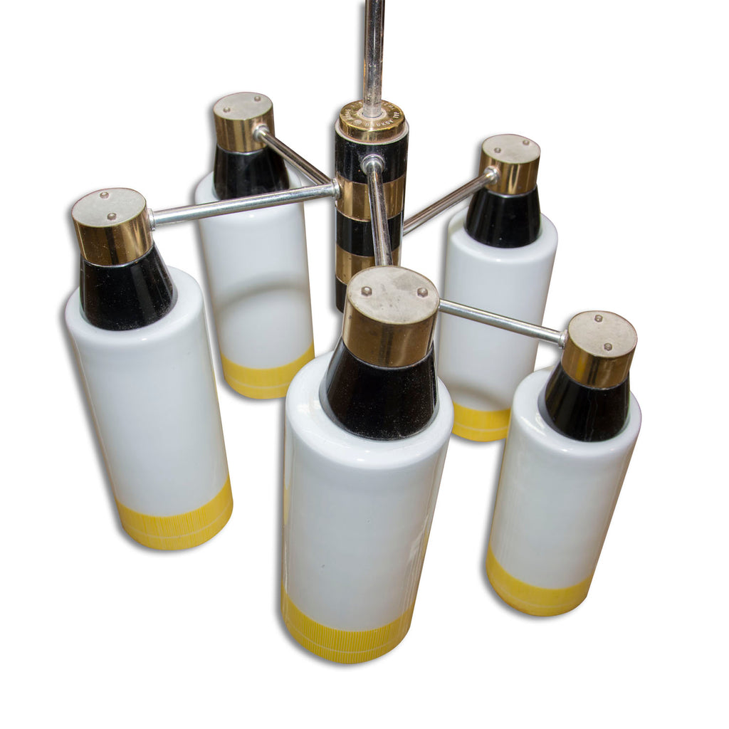 Hanging chandelier from the turn of the 50s and 60s. It was made in Czechoslovakia by the famous company- DRUKOV. Awesome design. New wiring. Material: metal, chrome,brass, milky glass.