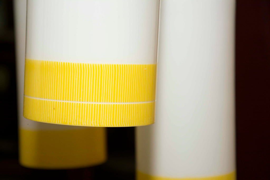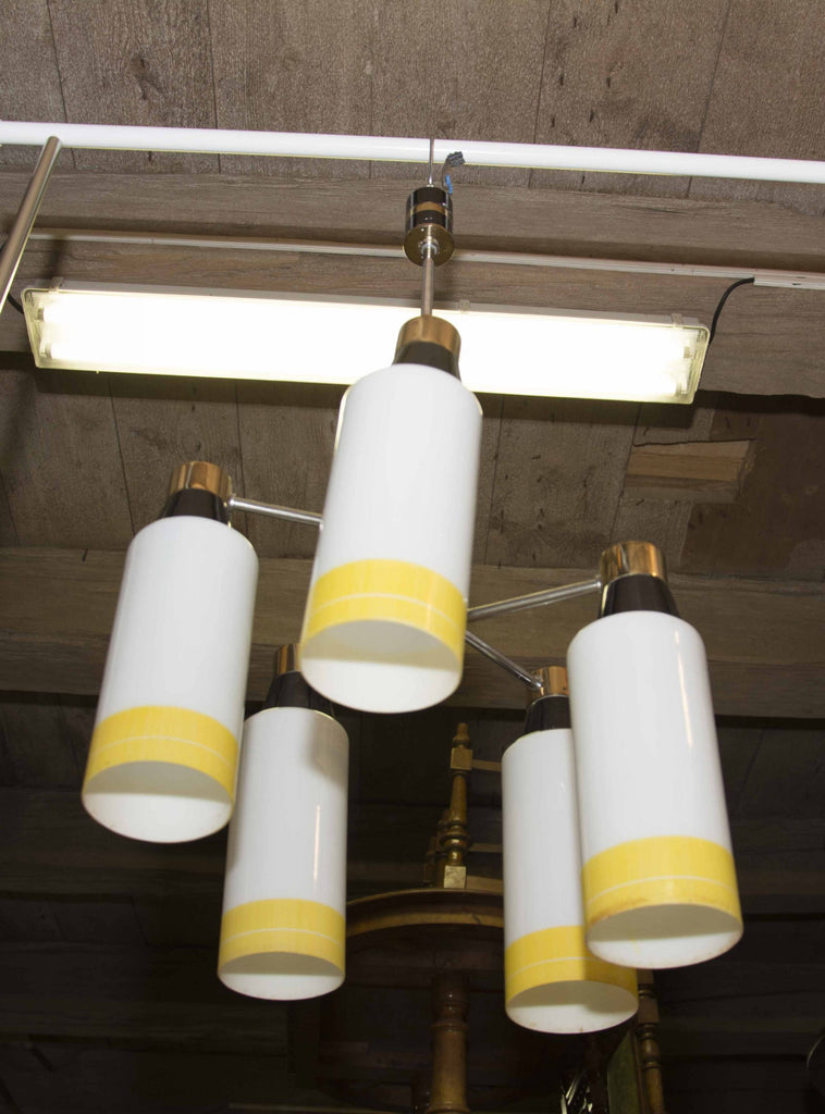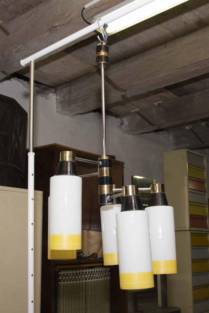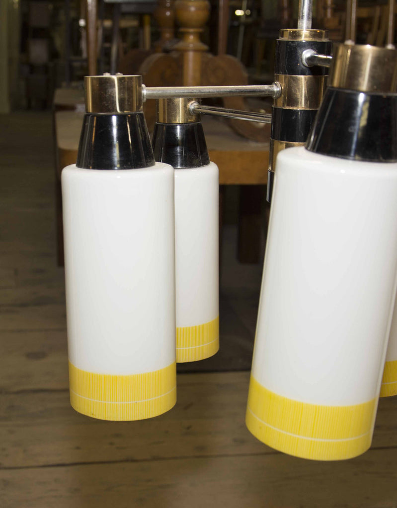 Hanging chandelier from the turn of the 50s and 60s. It was made in Czechoslovakia by the famous company- DRUKOV. Awesome design. New wiring. Material: metal, chrome,brass, milky glass.