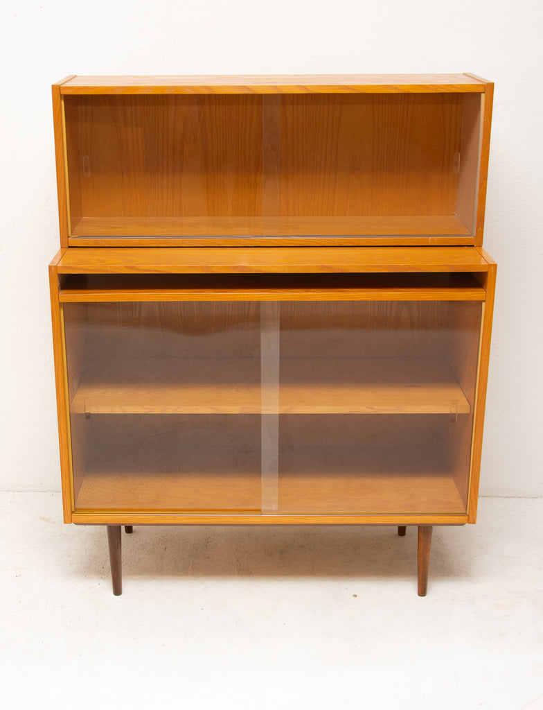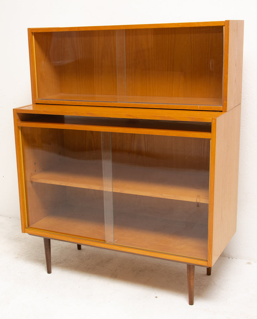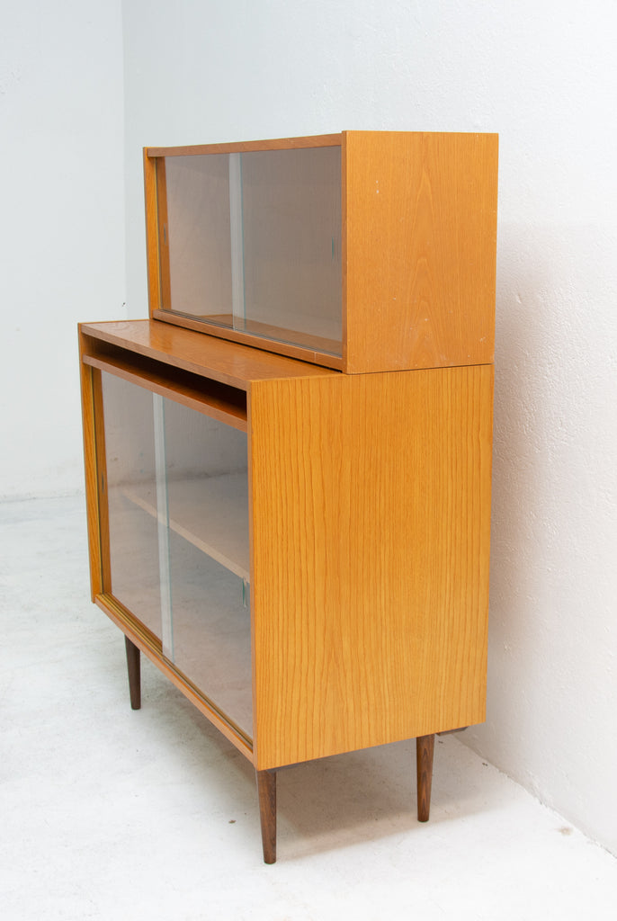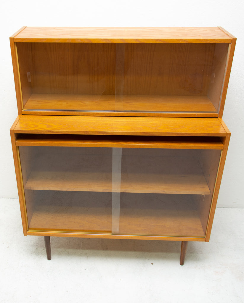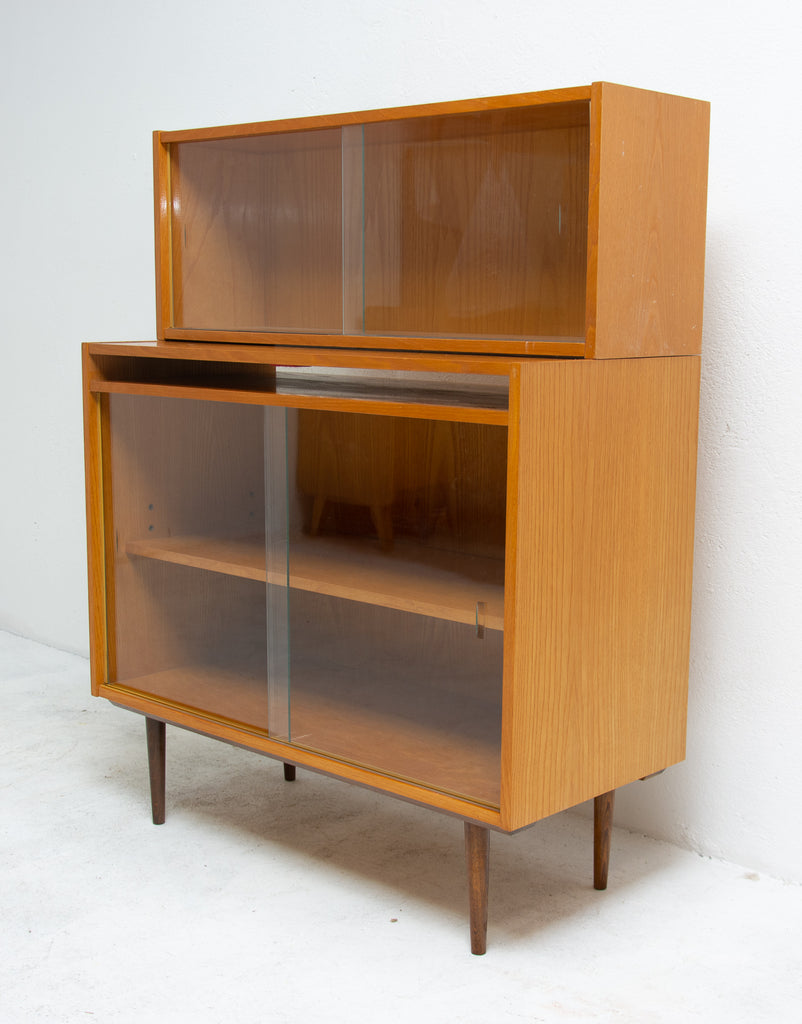 Mid-century two-storey glazed showcase. It can be used also as a small library. It features a glazed upper part and glazed part at the bottom. It´s made of oak wood with polished veneer. It was produced by ÚP Zavody in the 1960´s. In very good condition with only minor wear.
