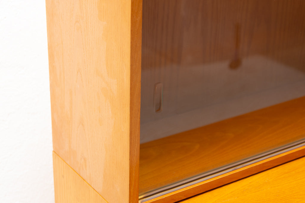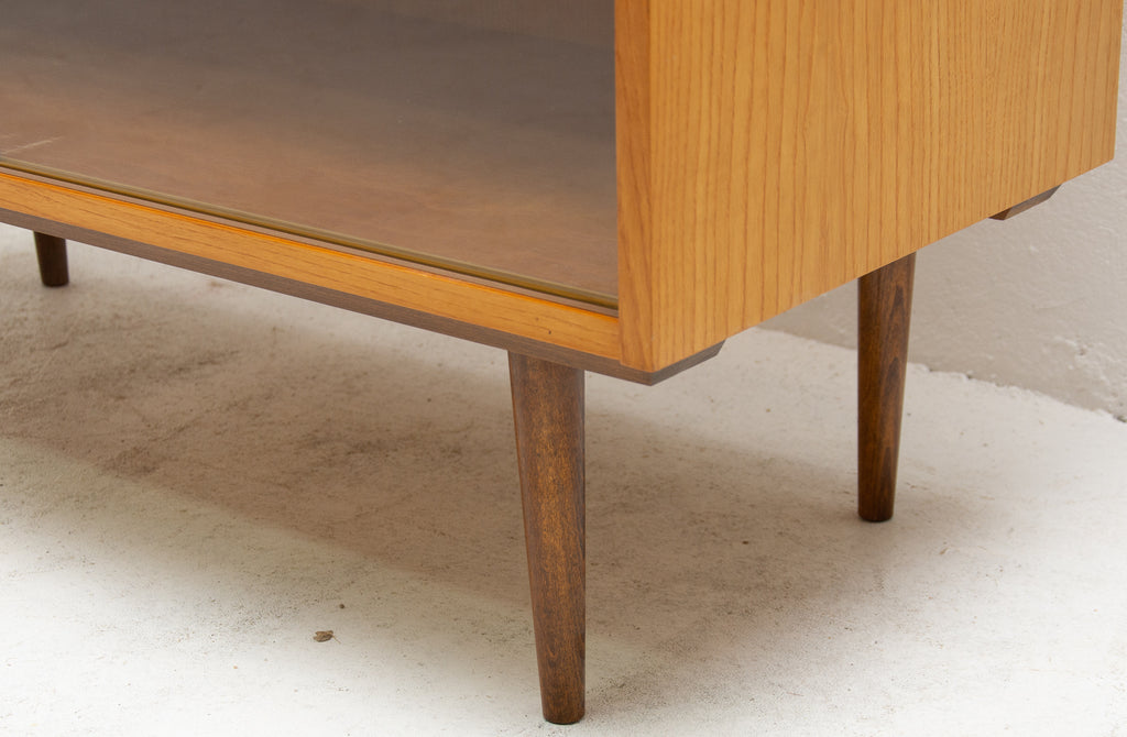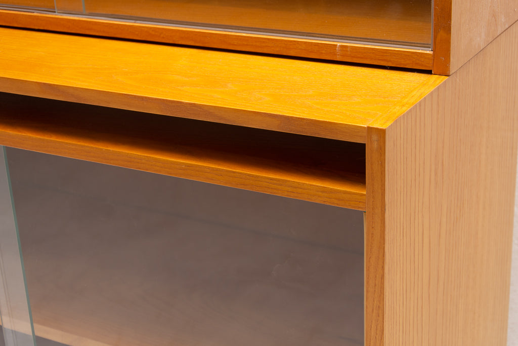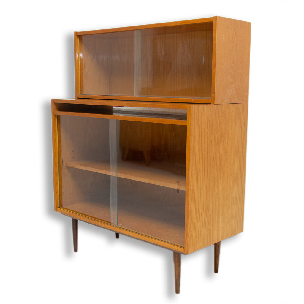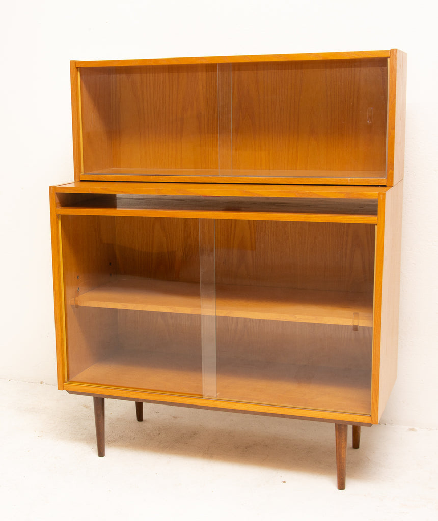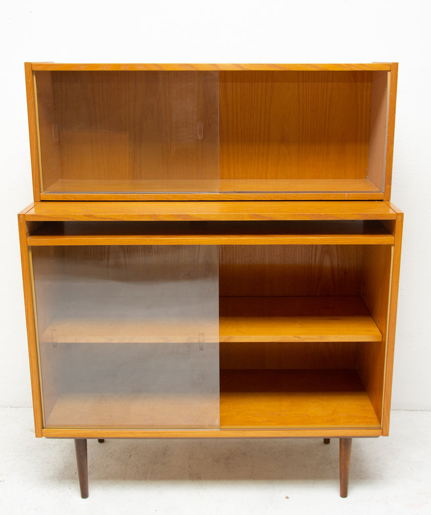 Mid-century two-storey glazed showcase. It can be used also as a small library. It features a glazed upper part and glazed part at the bottom. It´s made of oak wood with polished veneer. It was produced by ÚP Zavody in the 1960´s. In very good condition with only minor wear.