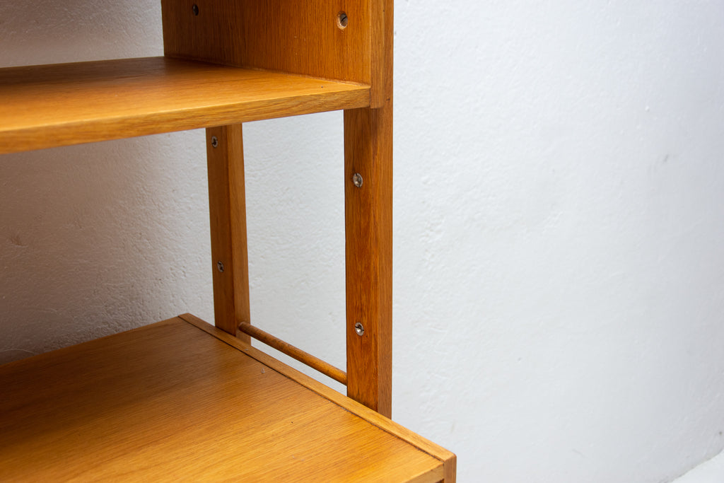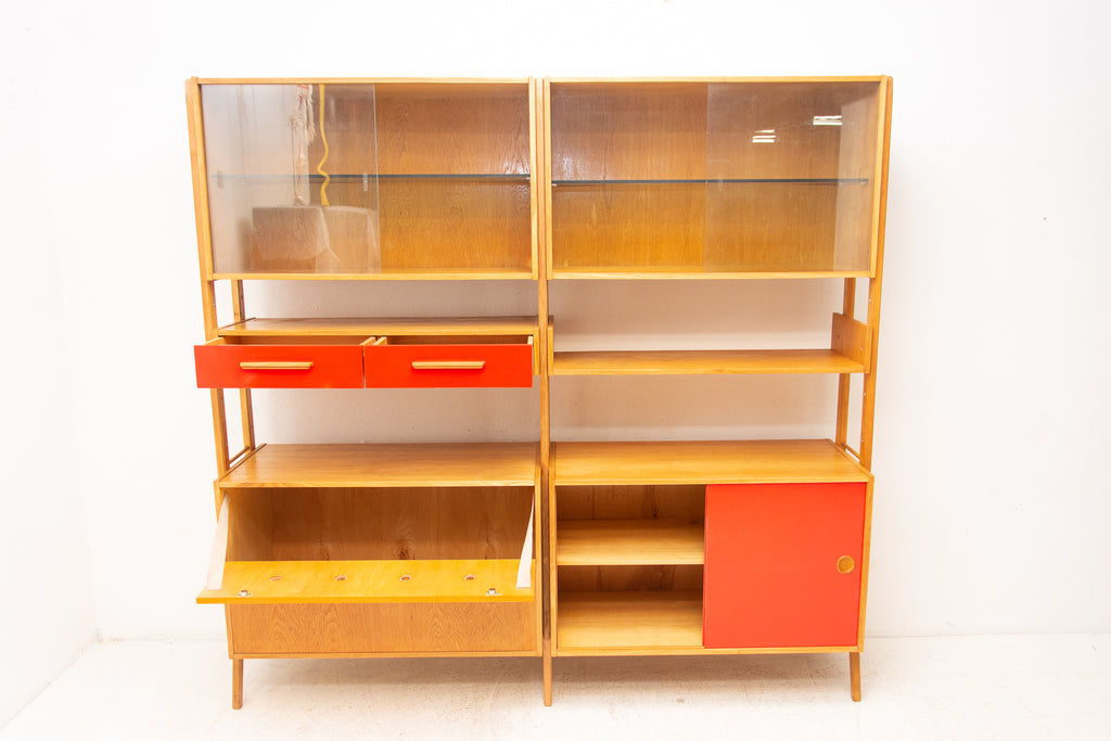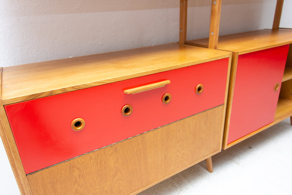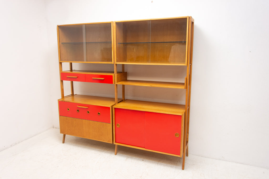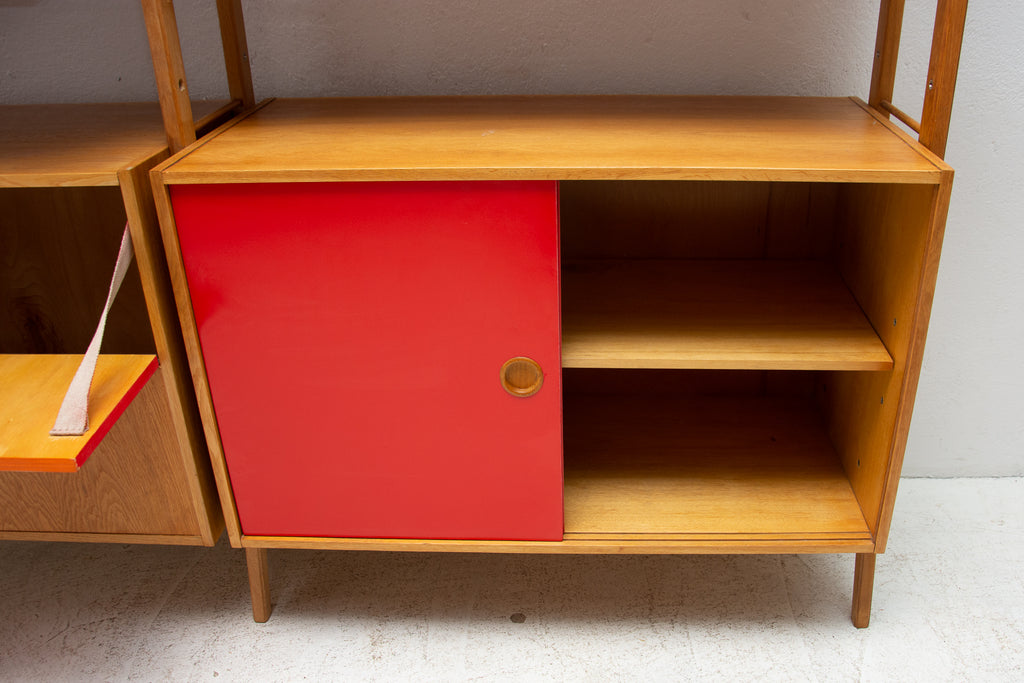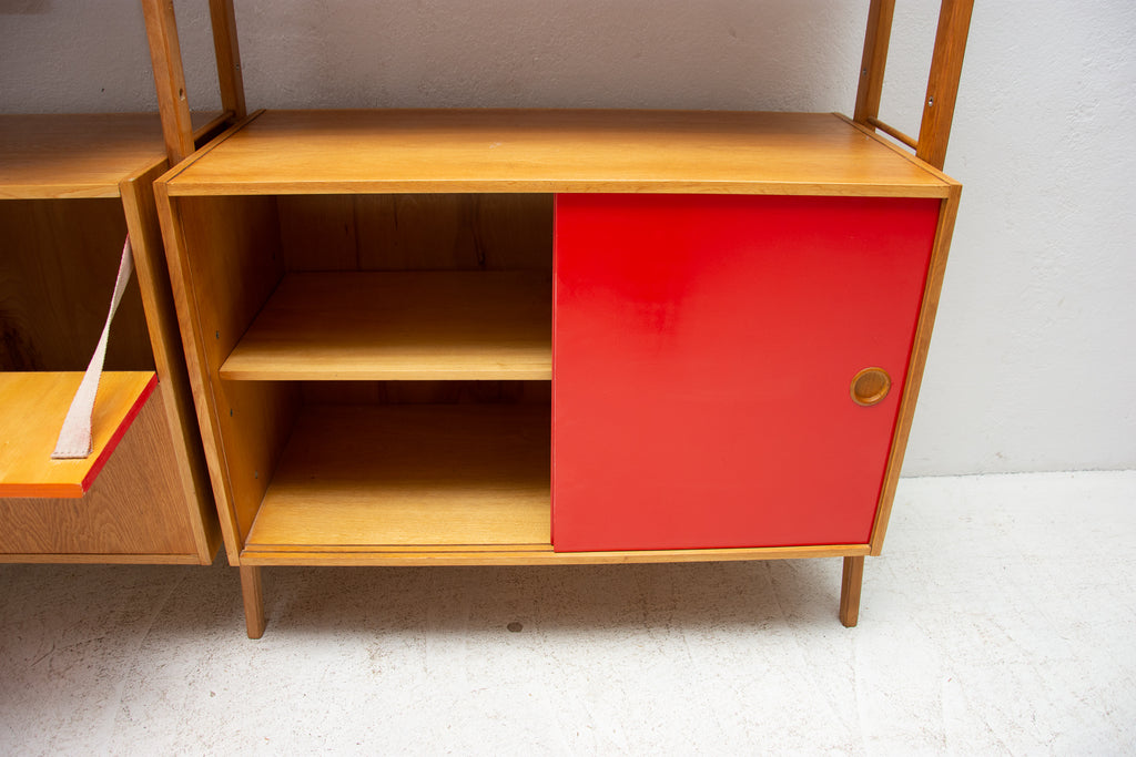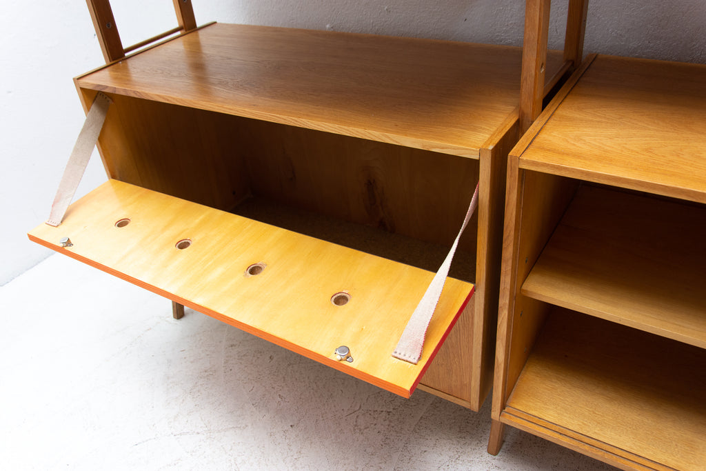 Mid century wall shelf system from the 1960´s. It was designed by Frantisek Jirák and was made by Tatra nábytok company in the former Czechoslovakia. It was renovated, in very good condition. Beech wood veneer.