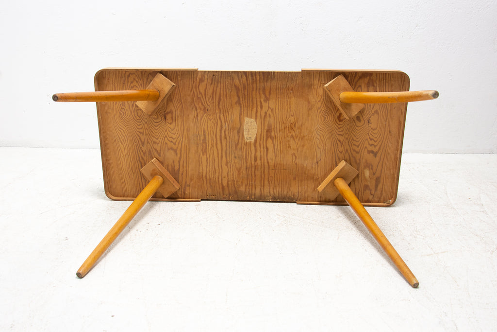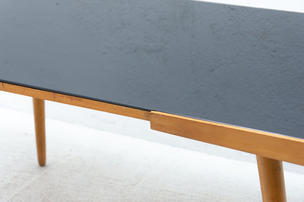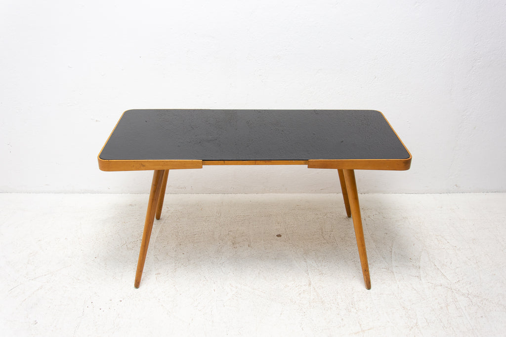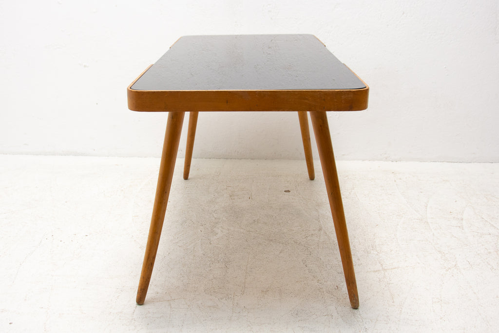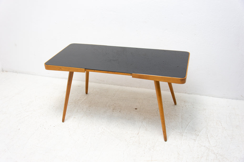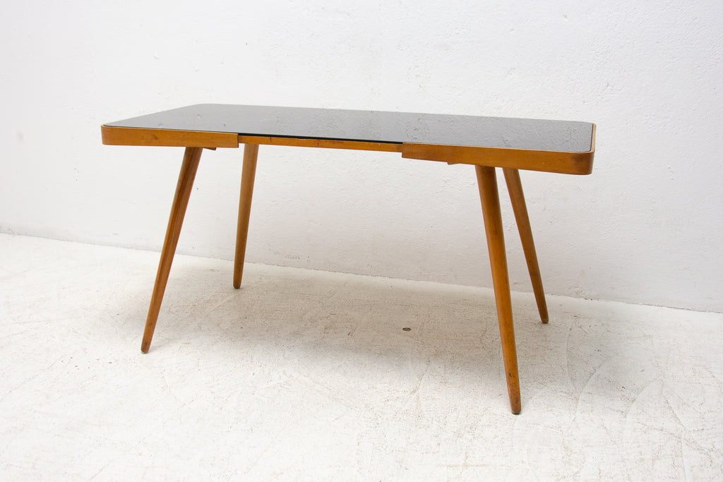 Mid century opaxite glass coffee table from the 1960´s. Associated with the world-renowned exhibition EXPO 58 in Brussels. It was produced by "Český nábytek". It features a beechwood structure and a black glass tabletop. In very good Vintage condition, shows signs of age and using.