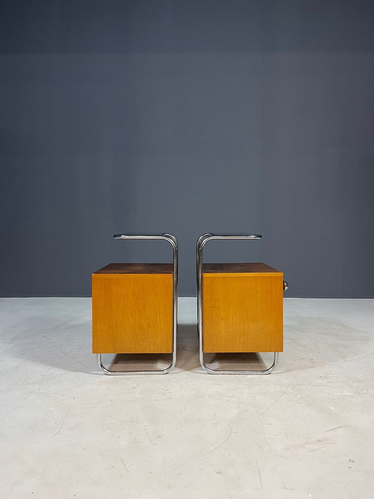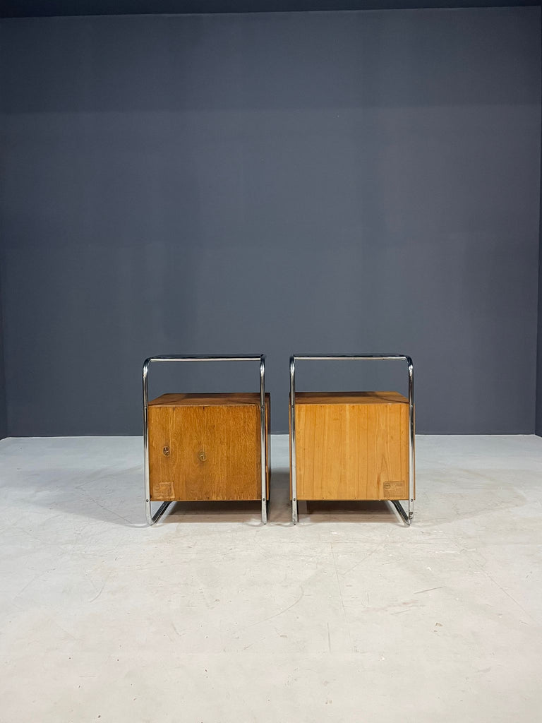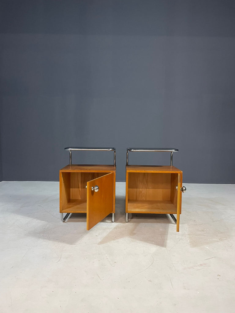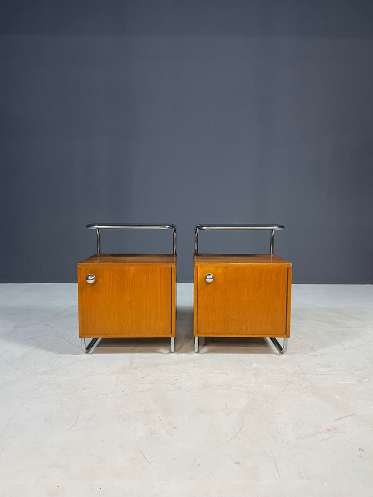 A pair of Bauhaus-style bedside tables from the 1930s, made in Czechoslovakia.