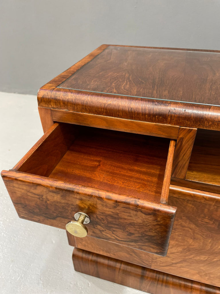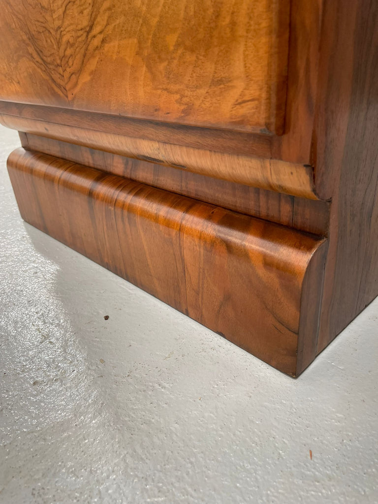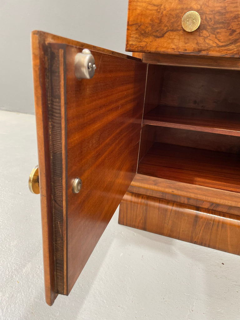 This pair of vintage bedside tables, crafted in Czechoslovakia around 1938, showcases the refined geometry and elegance of the Art Deco period. The pieces have recently undergone a complete professional renovation, including restoration of the veneer, structural touch-ups, and surface polishing. They now offer both their original charm and renewed durability.