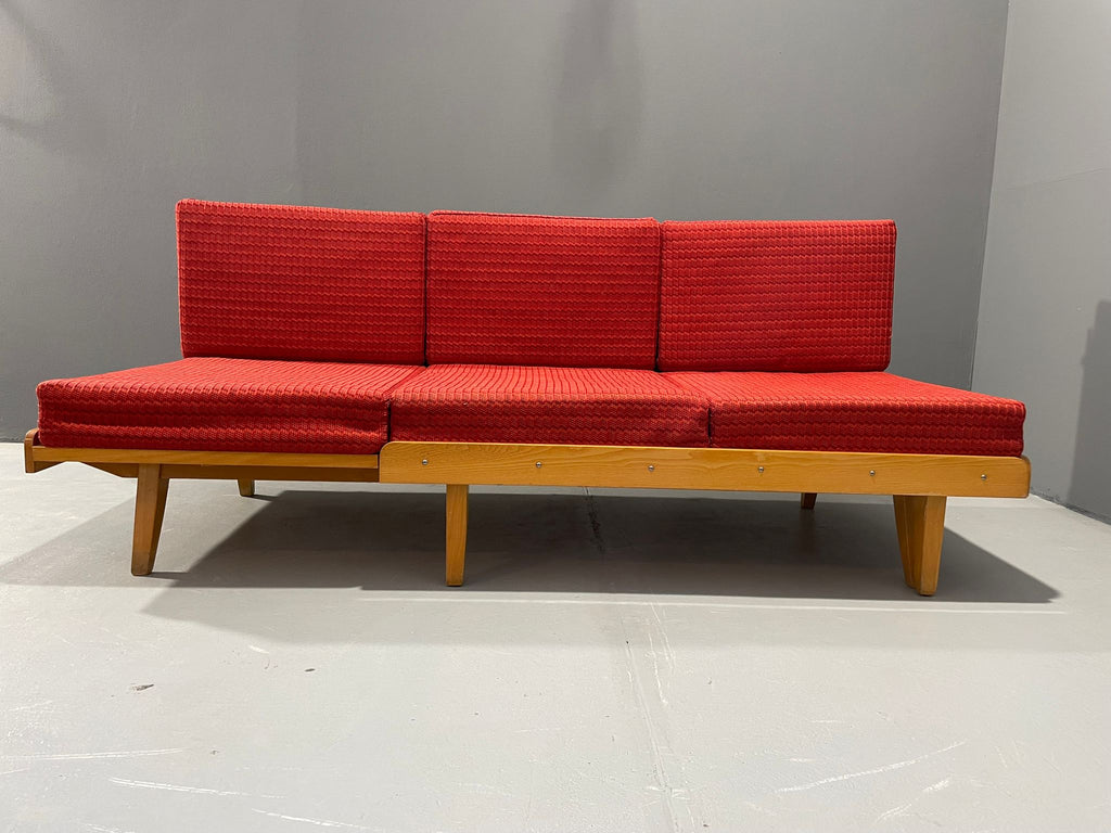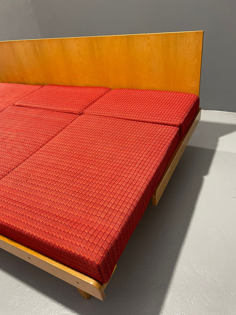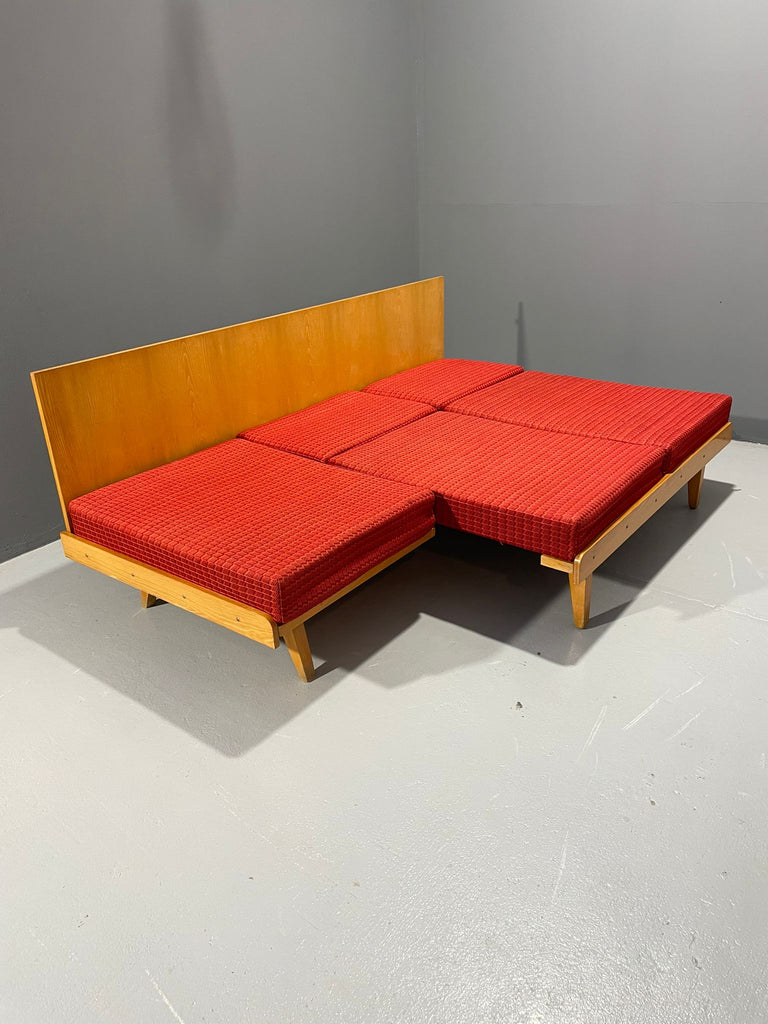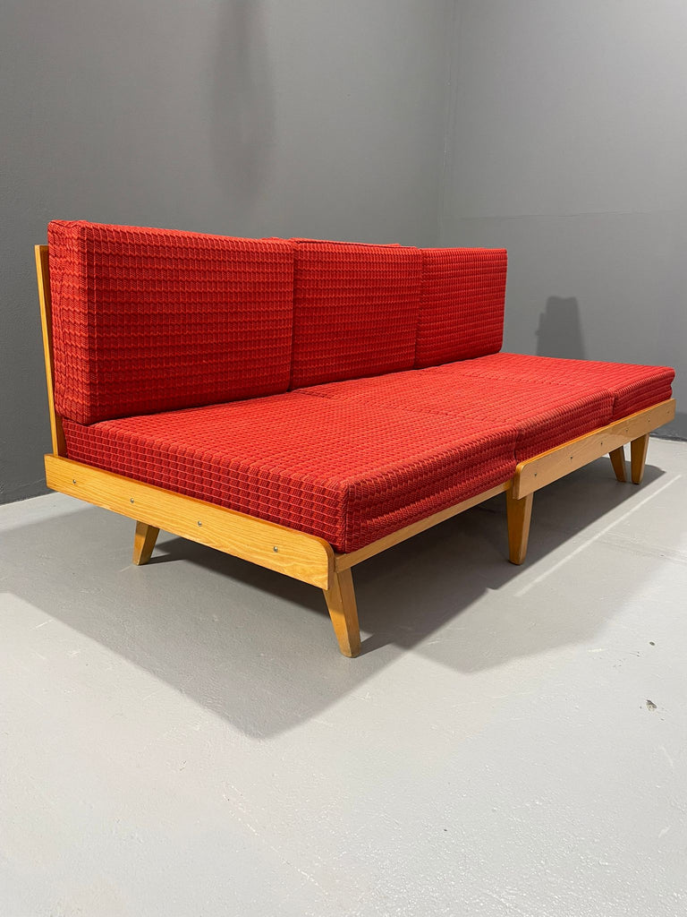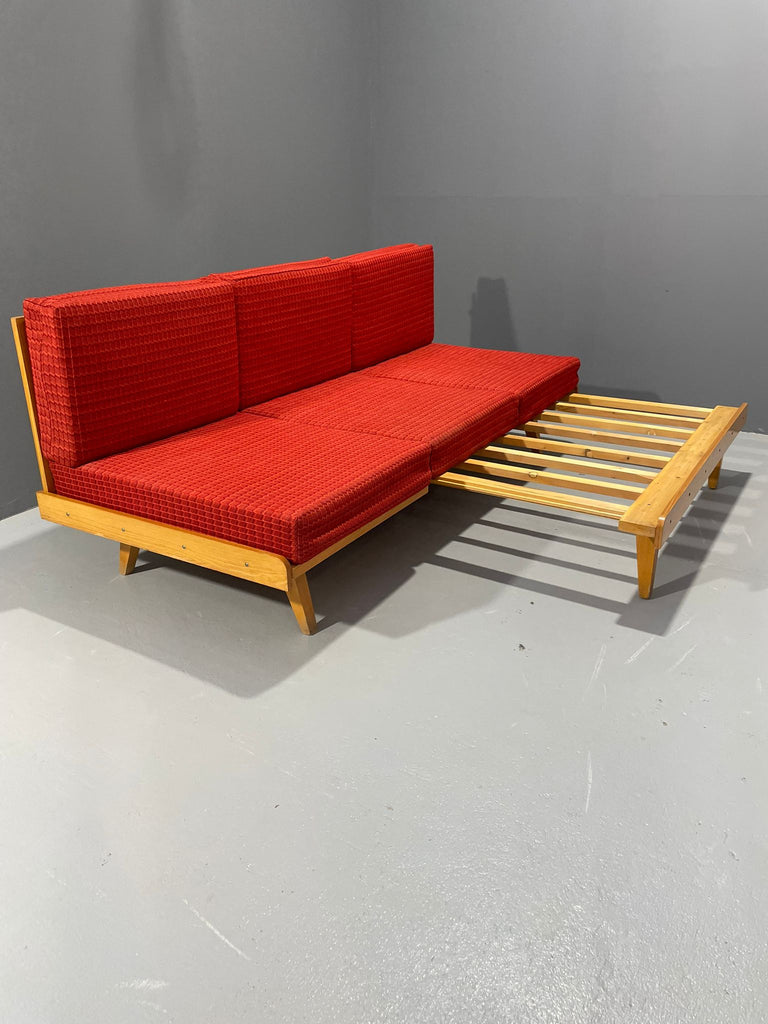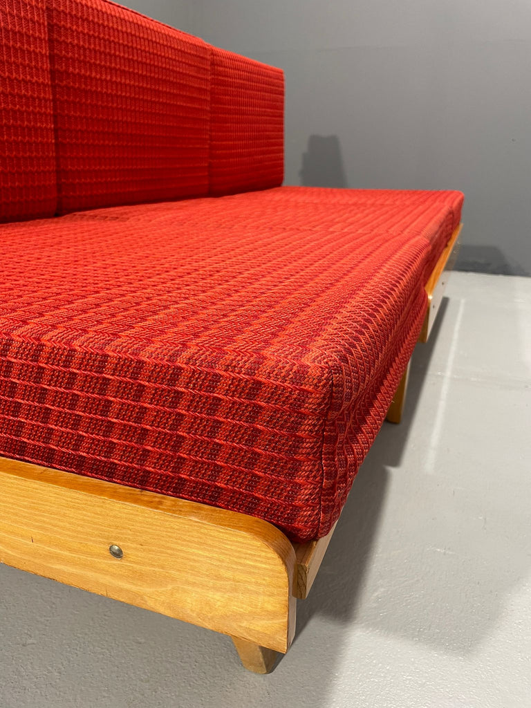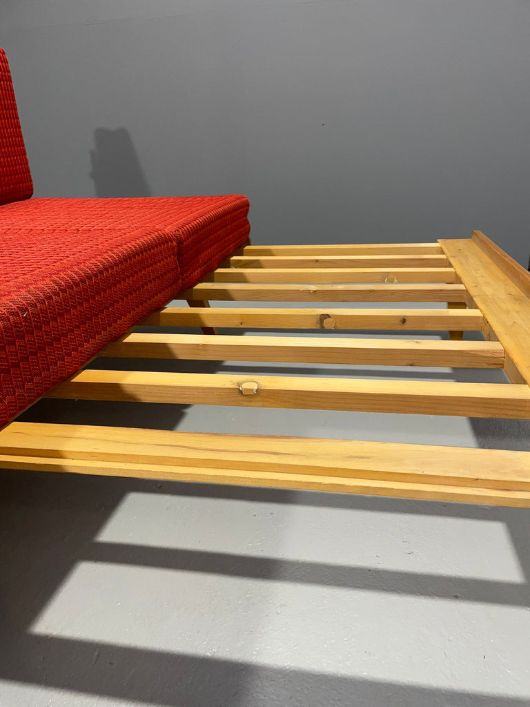 The sofa features a wooden frame and red fabric upholstery. When extended, it transforms into a comfortable sleeping area. One of the seat modules – a footrest or extended segment – is upholstered in a different patterned fabric, adding a playful and visually interesting contrast. The piece is in very good original condition, with minor signs of use appropriate to its age.