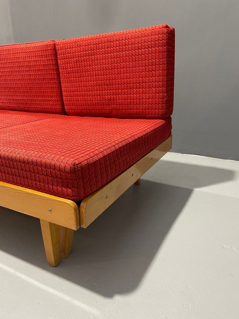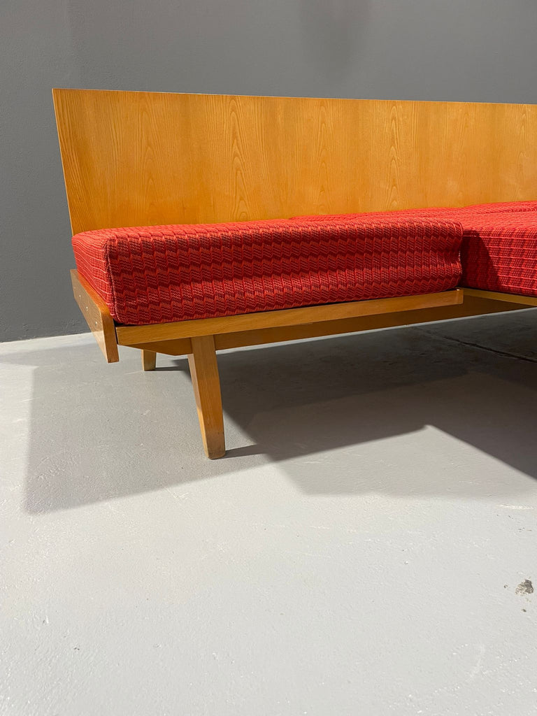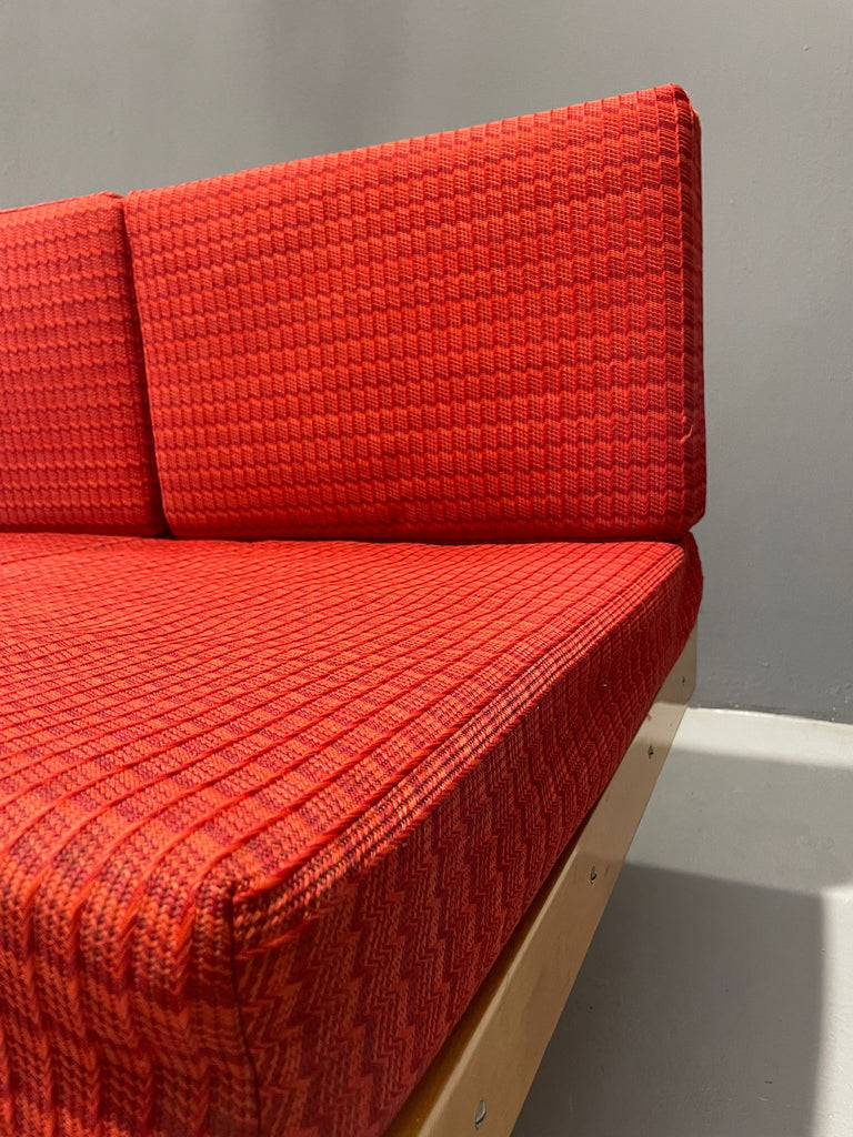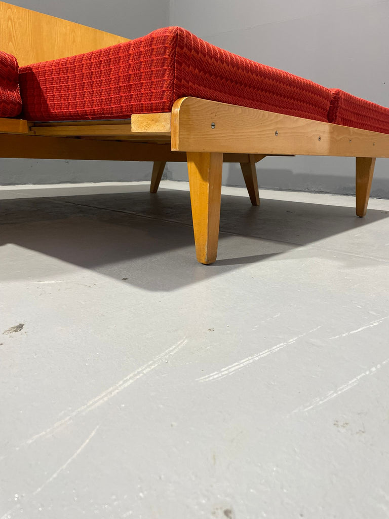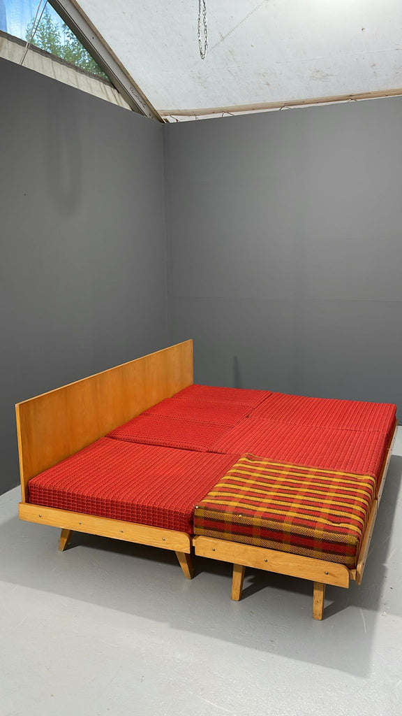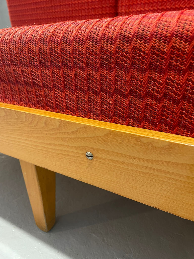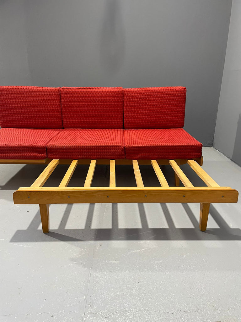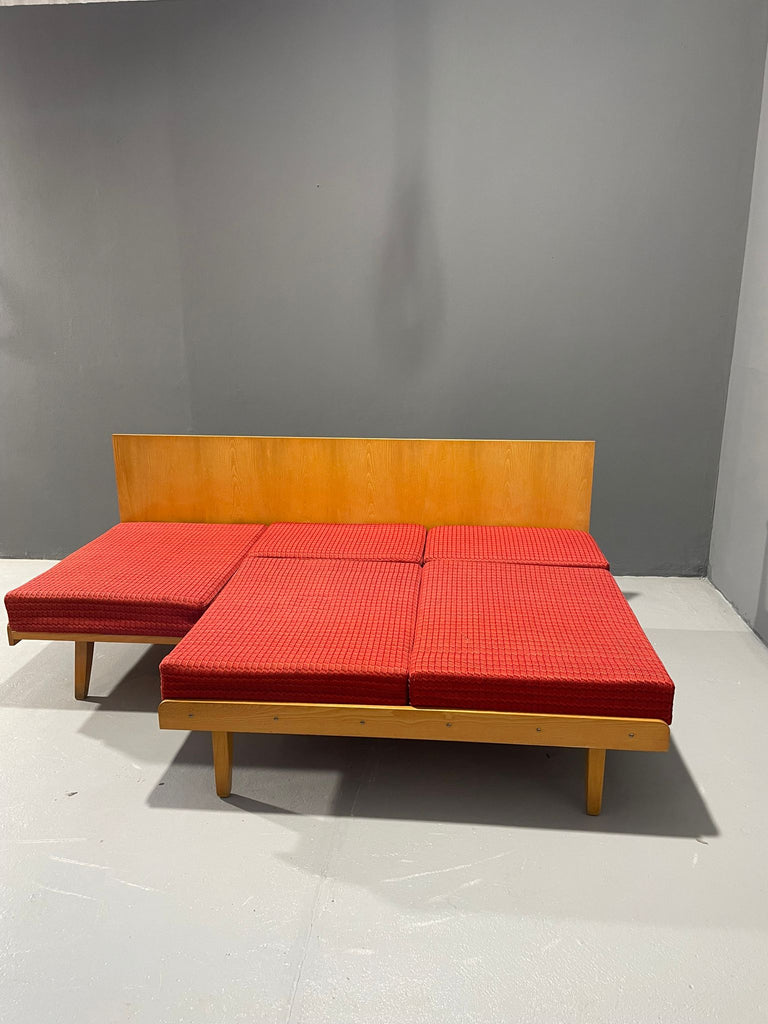 The sofa features a wooden frame and red fabric upholstery. When extended, it transforms into a comfortable sleeping area. One of the seat modules – a footrest or extended segment – is upholstered in a different patterned fabric, adding a playful and visually interesting contrast. The piece is in very good original condition, with minor signs of use appropriate to its age.