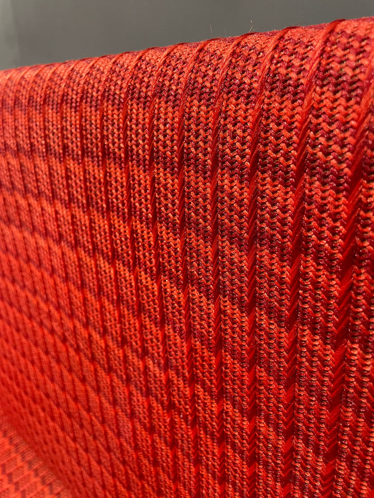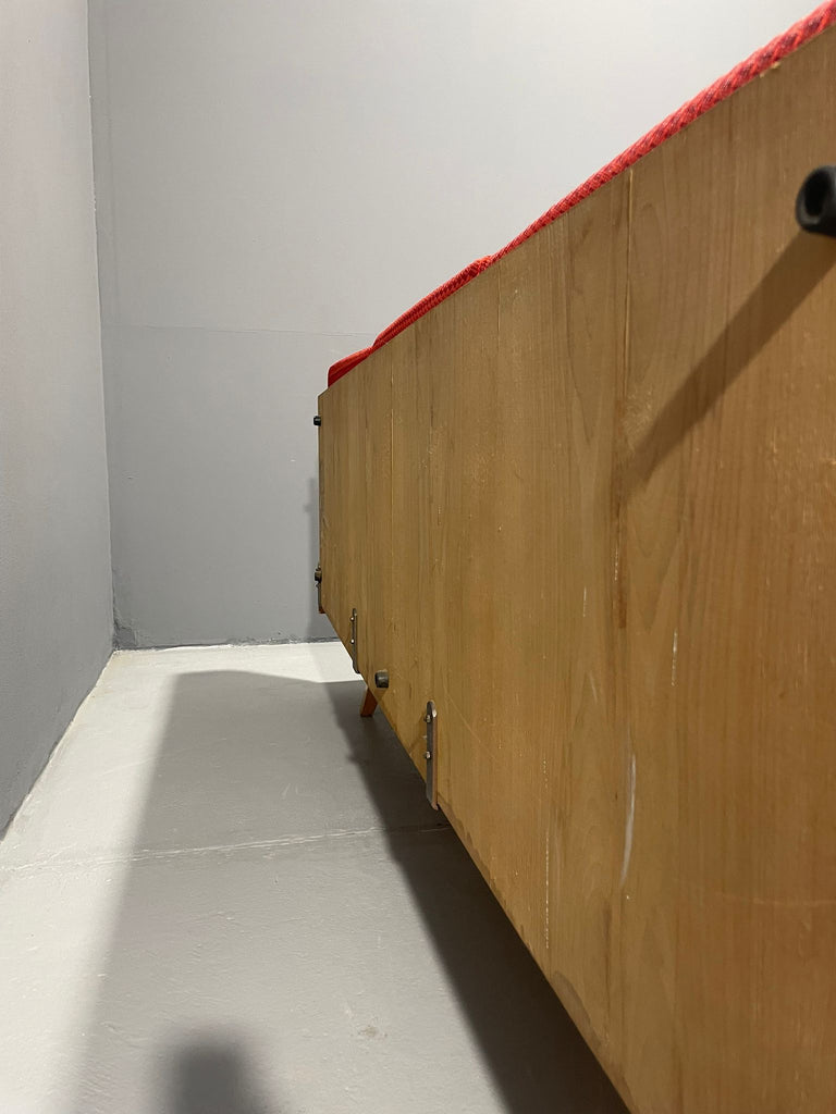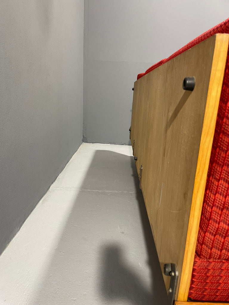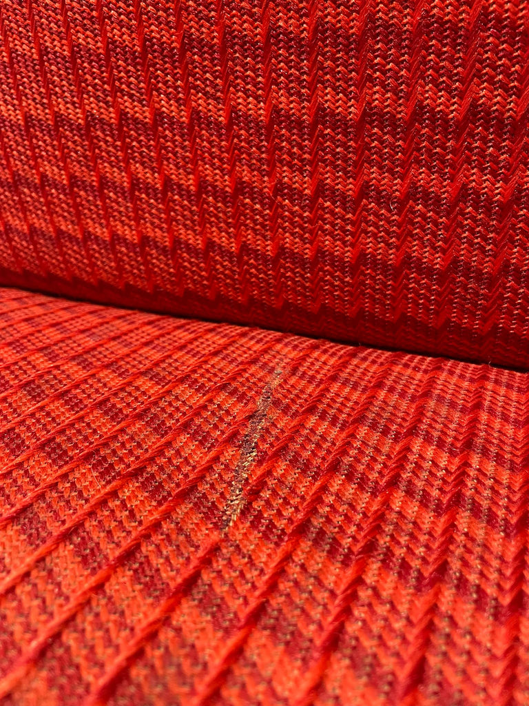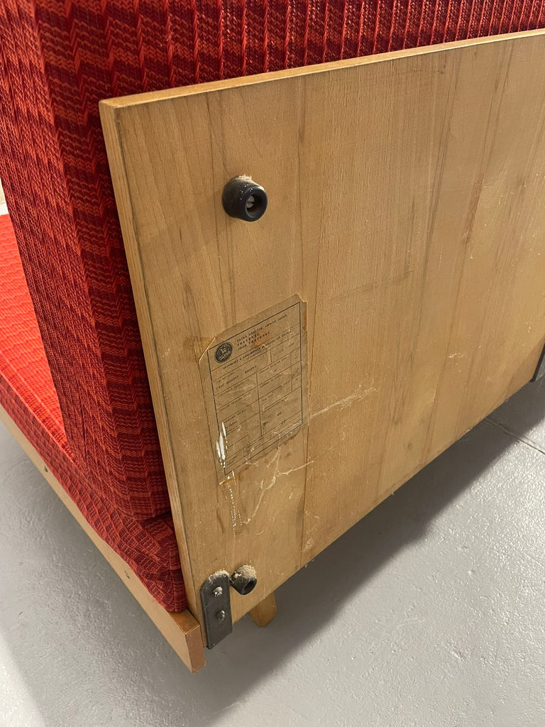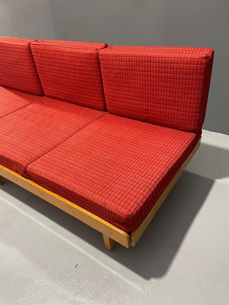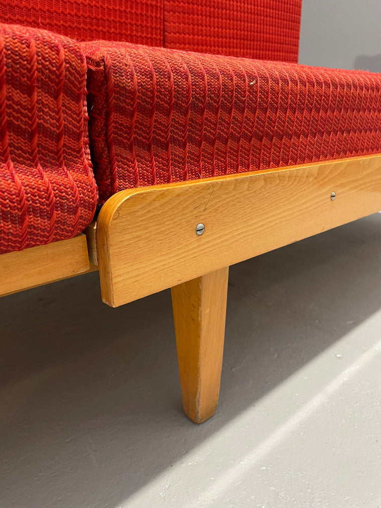 The sofa features a wooden frame and red fabric upholstery. When extended, it transforms into a comfortable sleeping area. One of the seat modules – a footrest or extended segment – is upholstered in a different patterned fabric, adding a playful and visually interesting contrast. The piece is in very good original condition, with minor signs of use appropriate to its age.
