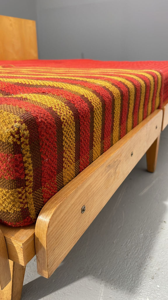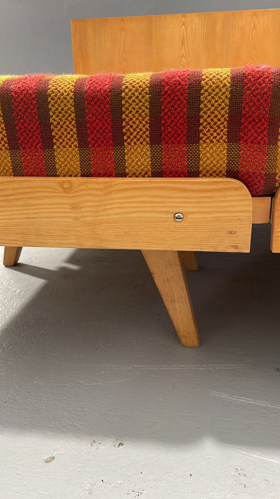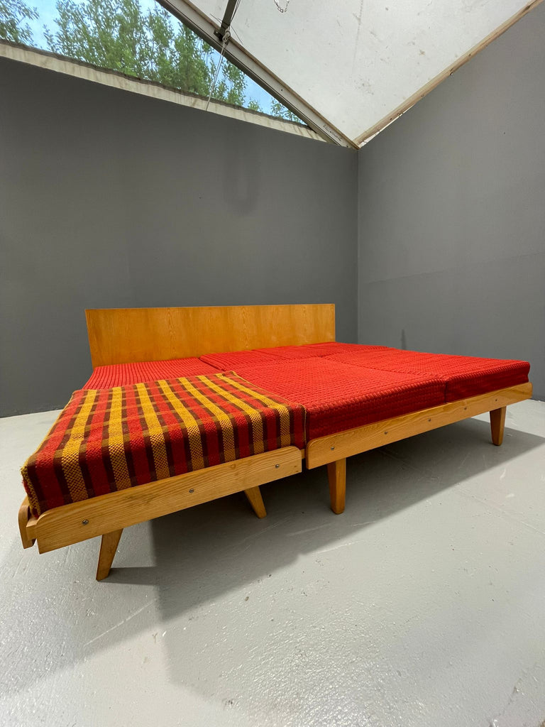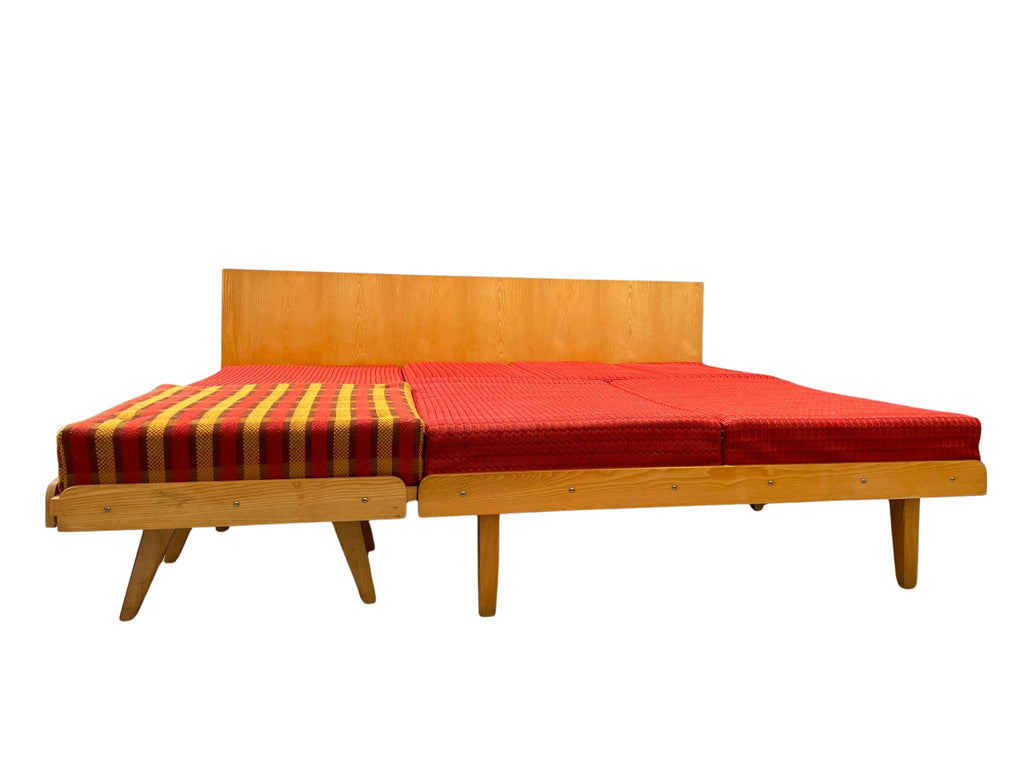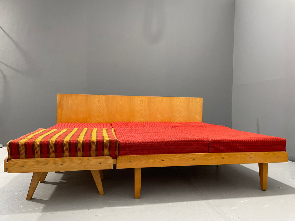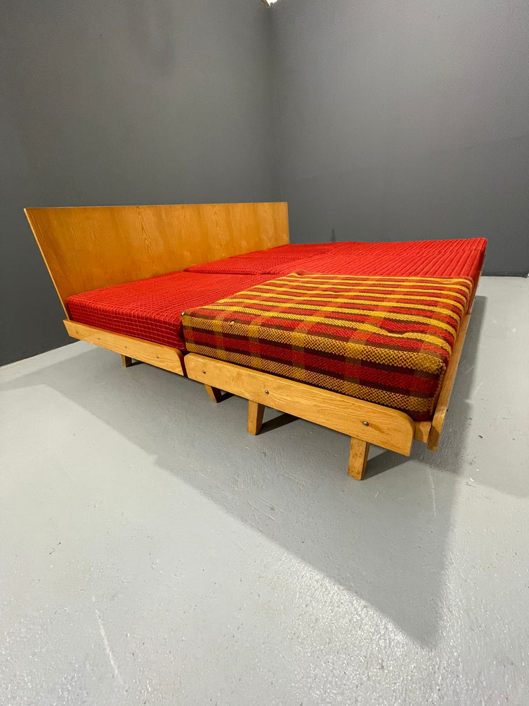 This vintage convertible sofa was made in the 1960s by Tatra Nábytok, Pravenec, in former Czechoslovakia. It represents a classic example of mid-century Czechoslovak design.