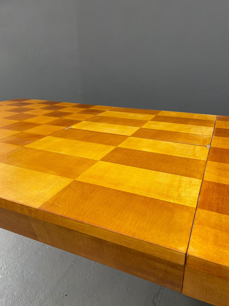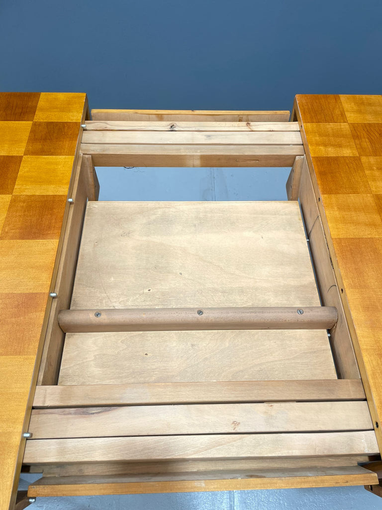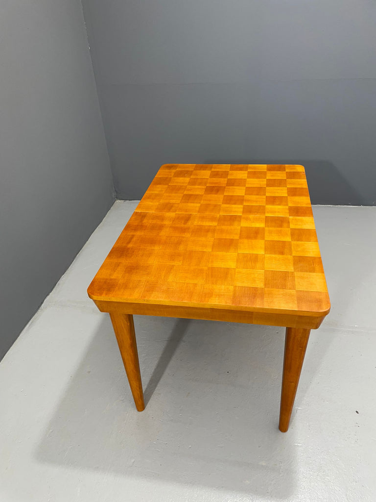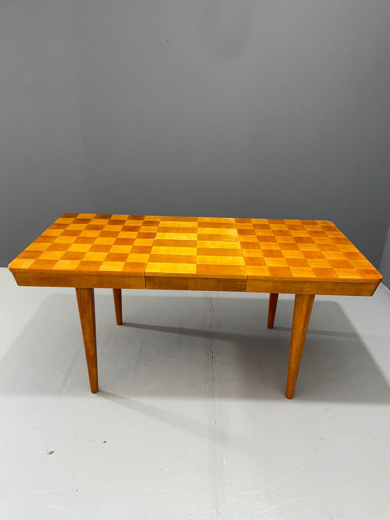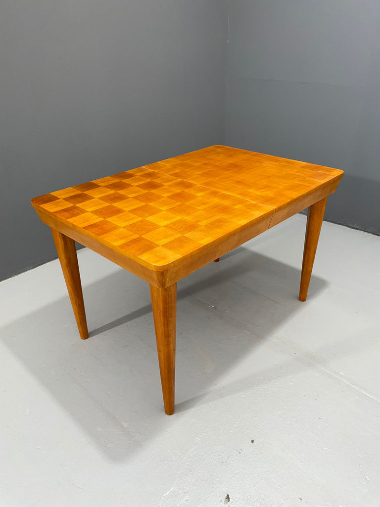 This mid-century extendable dining table designed by Jindřich Halabala is a stunning example of Czechoslovak modernist furniture from the 1940s–1950s. It features a beautifully executed checkerboard veneer top, a hallmark of Halabala’s refined sense of form and function.