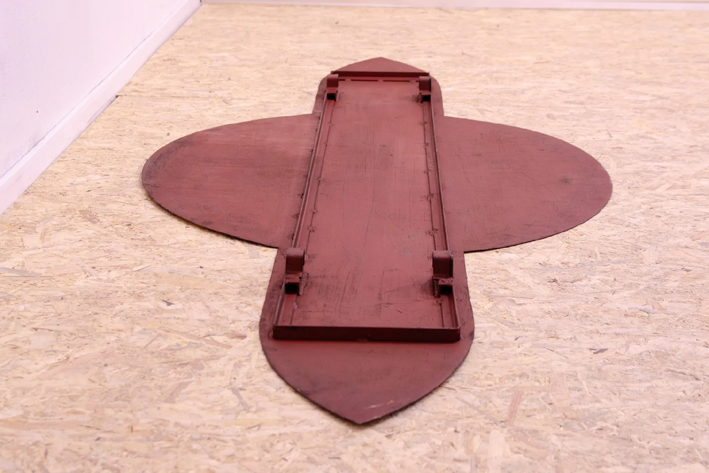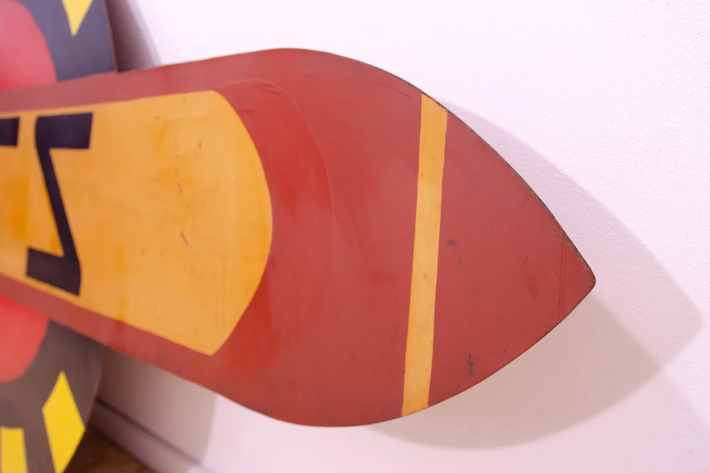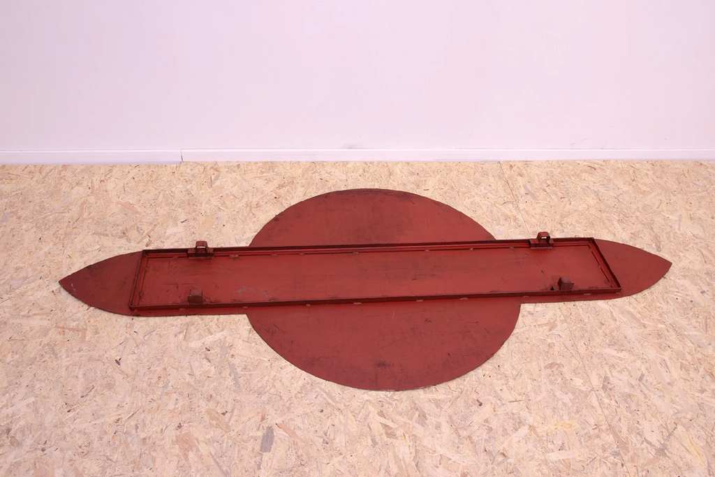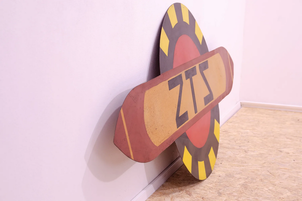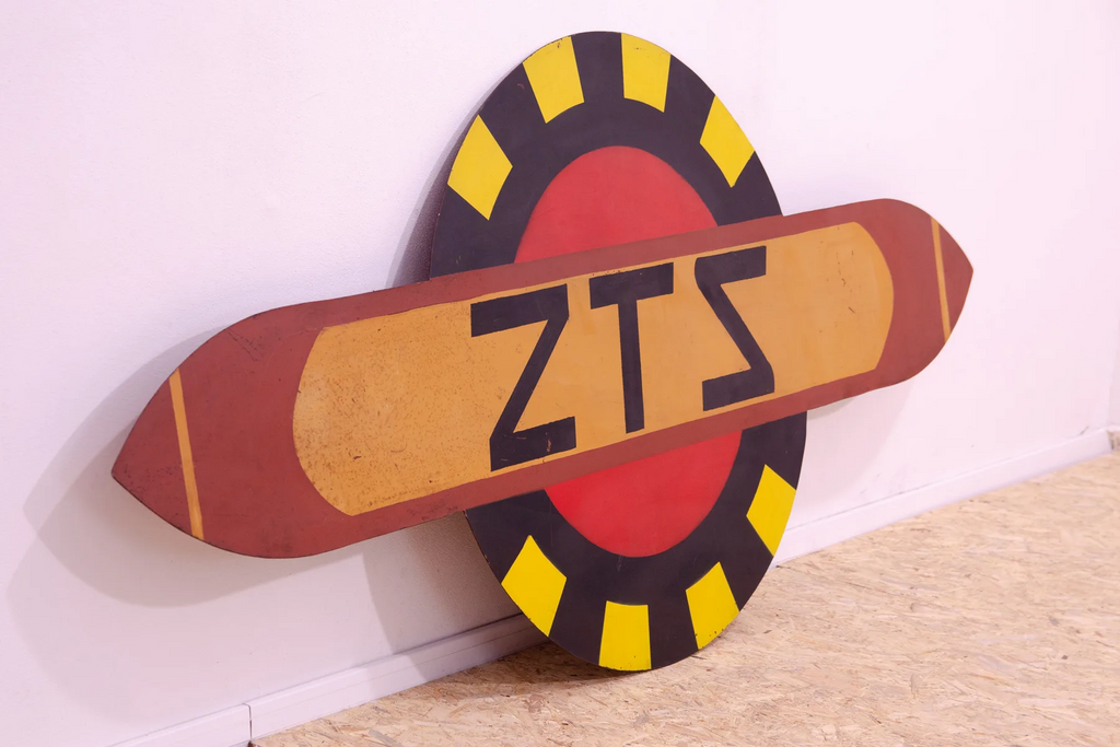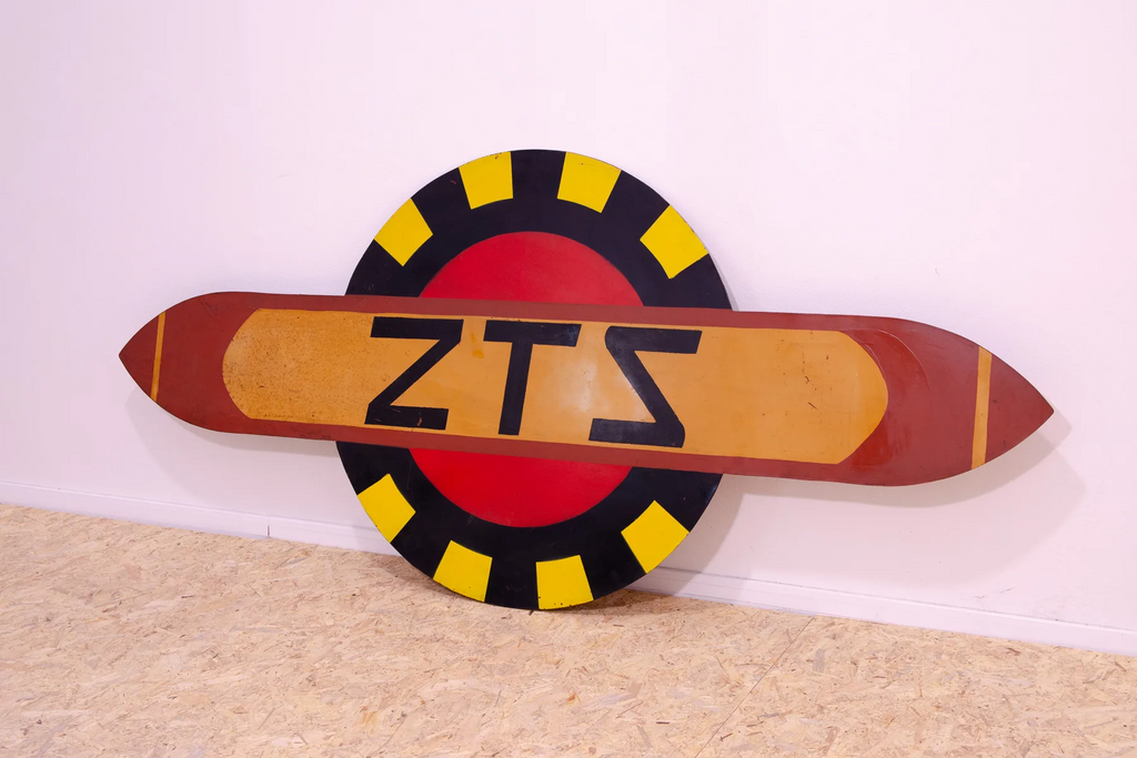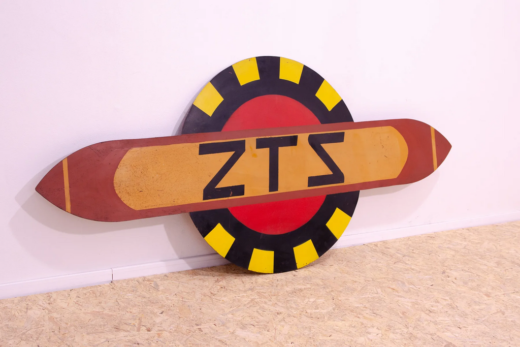 This hanging advertising sign is made of sheet metal and metal and features the letters ZTS. It was made in Czechoslovakia during the 80s and is in very good vintage condition. You can hang it on the wall with two screws.