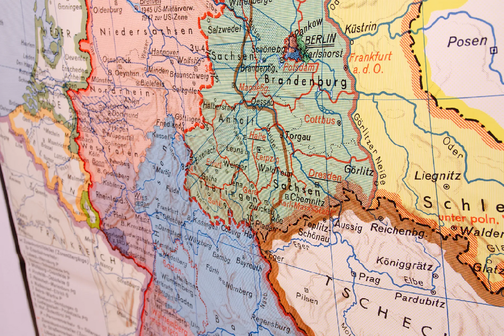 Old Vintage school paper map of Central Europe. It was produced in 1961 in Germany.