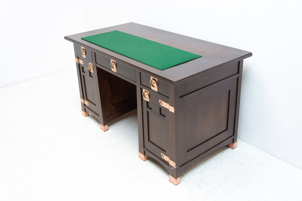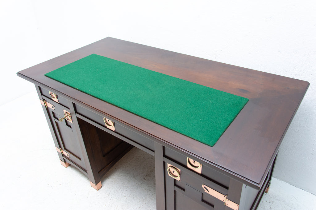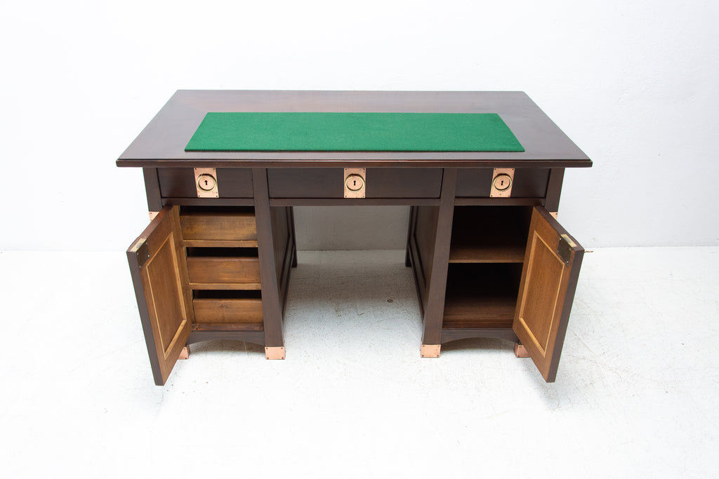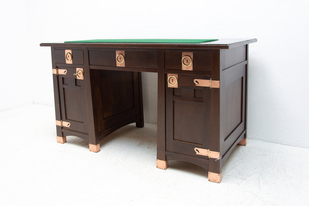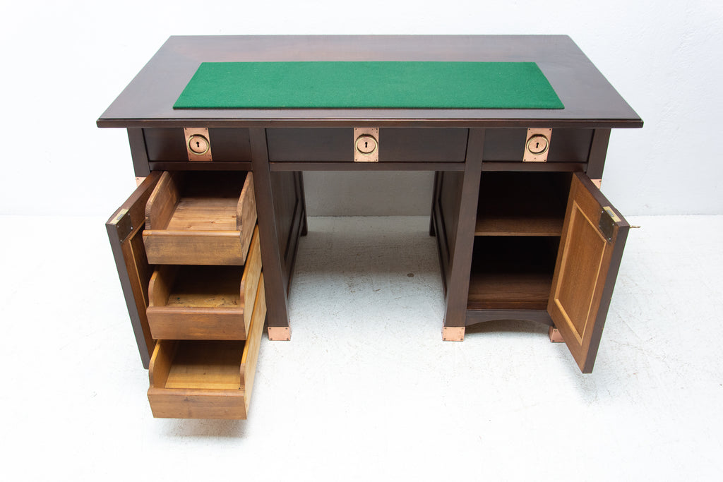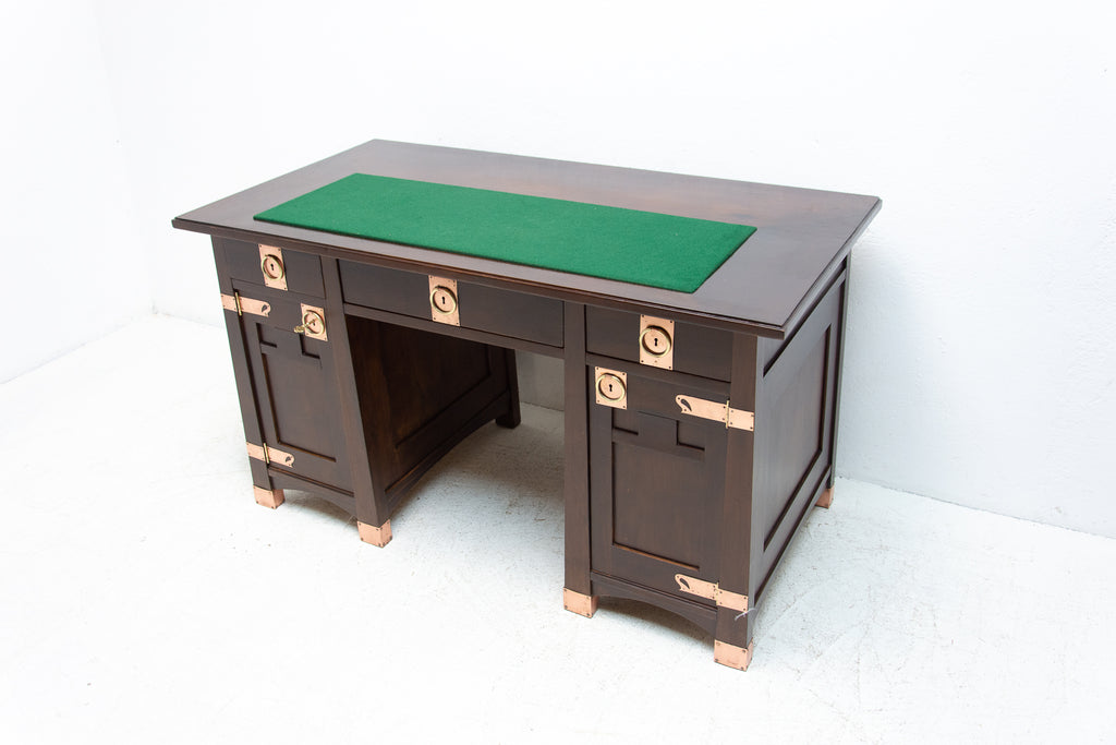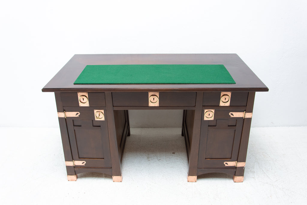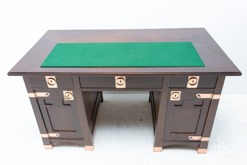 This luxurious-looking Art Nouveau writing desk was made in about 1910 in the former Austria-Hungary. It is made of oak wood. The table top is covered with green plush in the front. All original metal decorative parts were professionally cleaned, locks were repaired and cleaned. The table is in excellent condition after a complete professional renovation.